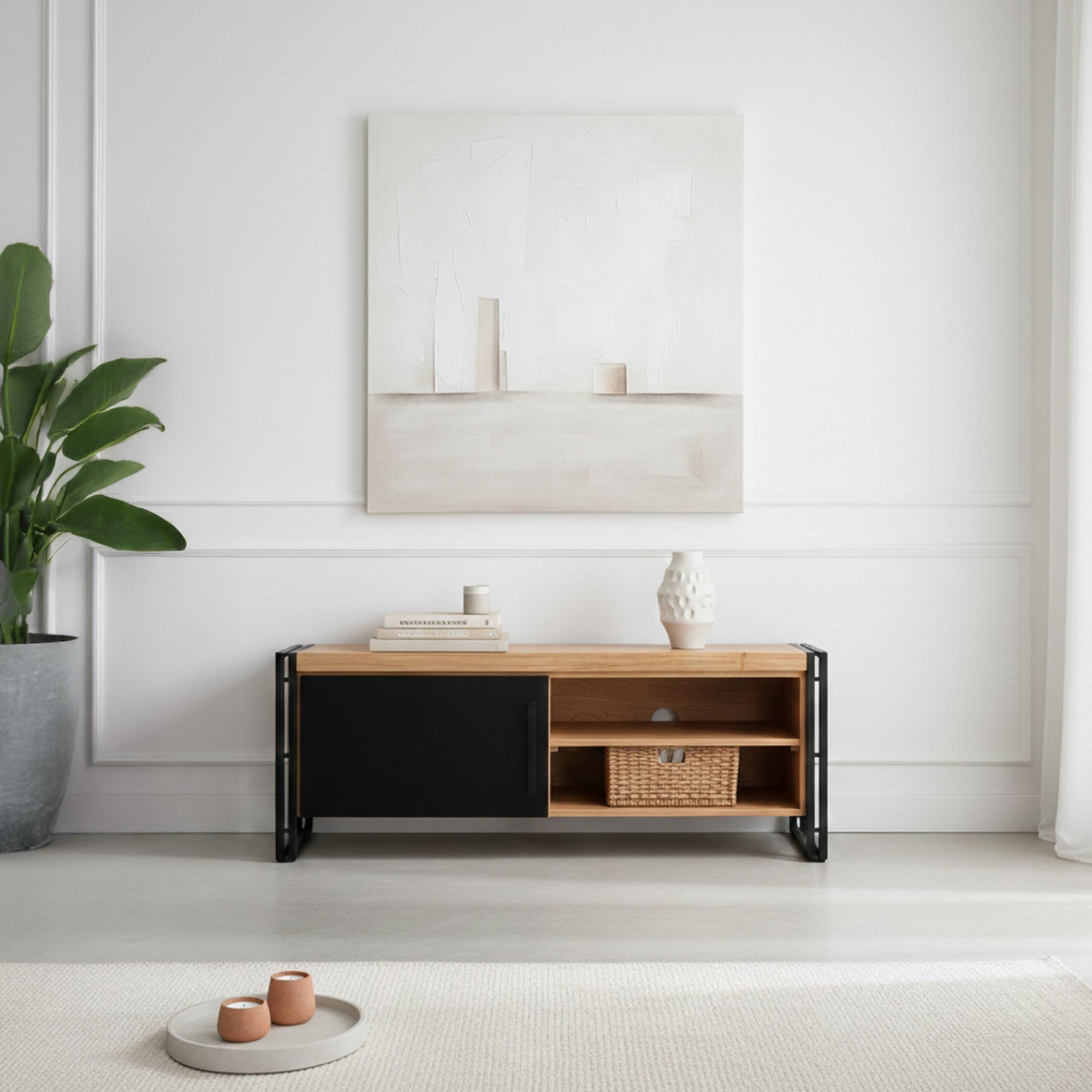 Pensé pour le quotidien, ce meuble télé bois massif et métal offre une organisation claire et fonctionnelle. Derrière la porte battante, un espace généreux d’environ 57 cm de large permet de dissimuler box, accessoires ou documents. Les niches ouvertes, de près de 58 cm de largeur et 15 cm de hauteur, accueillent facilement lecteur multimédia ou console de jeu. Un orifice discret à l’arrière facilite le passage des câbles et préserve une esthétique soignée.