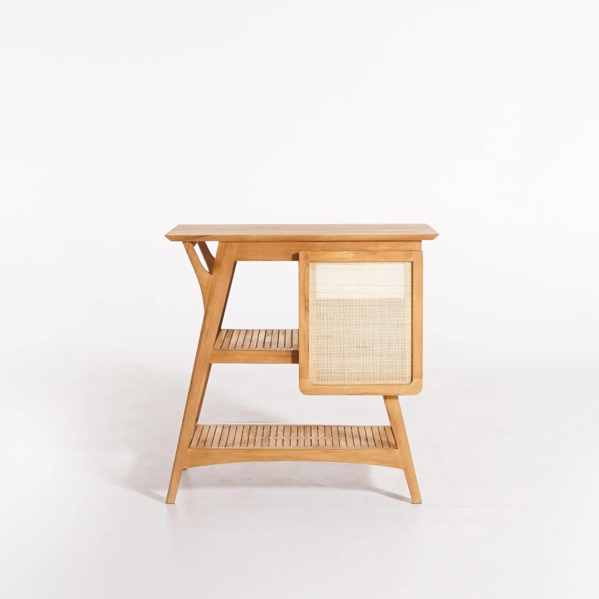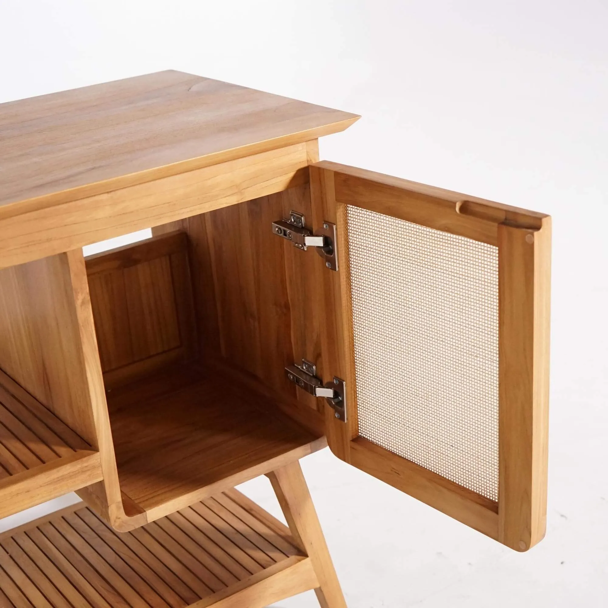 Nos designers ont longuement travaillé la courbe singulière des pieds et l’équilibre des volumes de ce meuble de salle de bain en bois de teck massif simple vasque afin de créer une pièce fluide et organique. Le cannage naturel qui habille la façade apporte une touche de texture délicate, créant un dialogue harmonieux entre la lumière et le bois. Les finitions manuelles assurent une surface parfaitement lisse, sans altérer le caractère vivant du teck.
