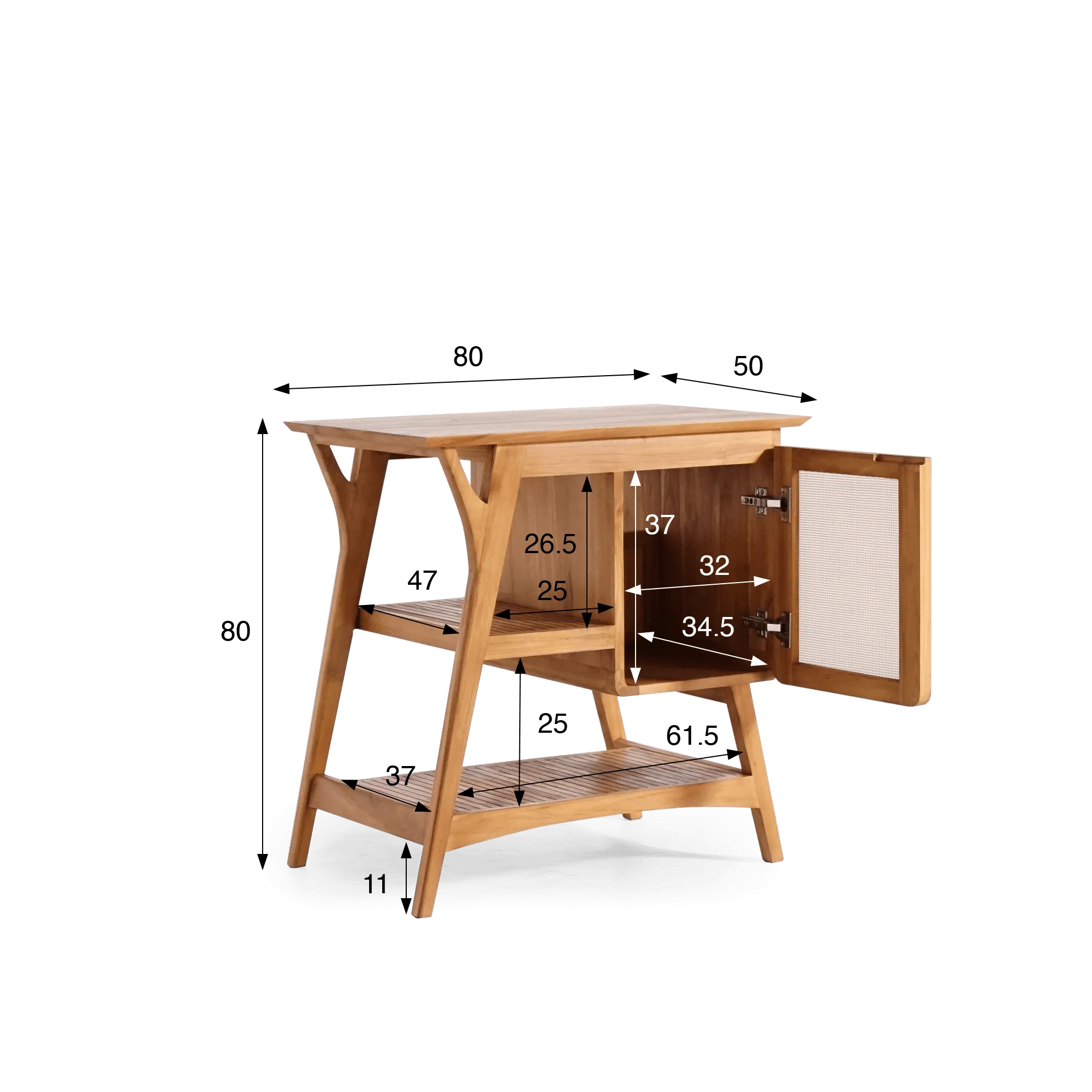 Fabriqué en teck massif, reconnu pour sa résistance naturelle à l’humidité et son toucher soyeux, ce meuble de salle de bain en bois de teck massif simple vasque met en valeur les veines subtiles et les nuances dorées du bois. Sa porte battante à ouverture soft close révèle un compartiment pratique (32 cm de largeur, 34,5 cm de profondeur et 37 cm de hauteur), idéal pour ranger les accessoires de toilette ou les serviettes. Les deux plateaux extérieurs, ajourés et solidement ancrés dans la structure, offrent des espaces supplémentaires (25 cm et 61,5 cm de largeur utile) pour accueillir paniers, serviettes ou flacons de soin, tout en laissant respirer la matière.
