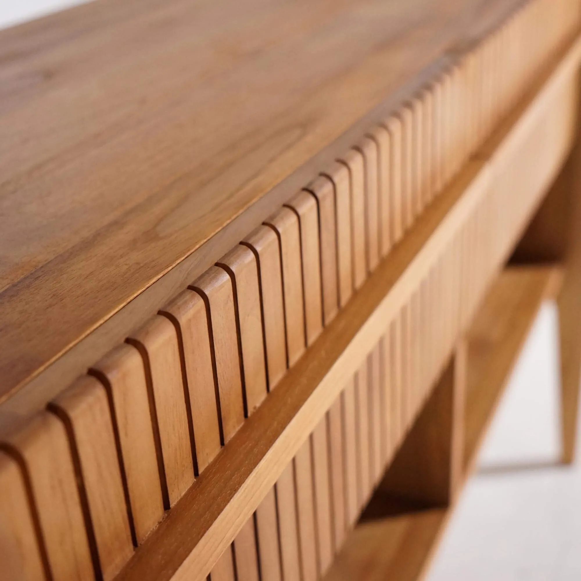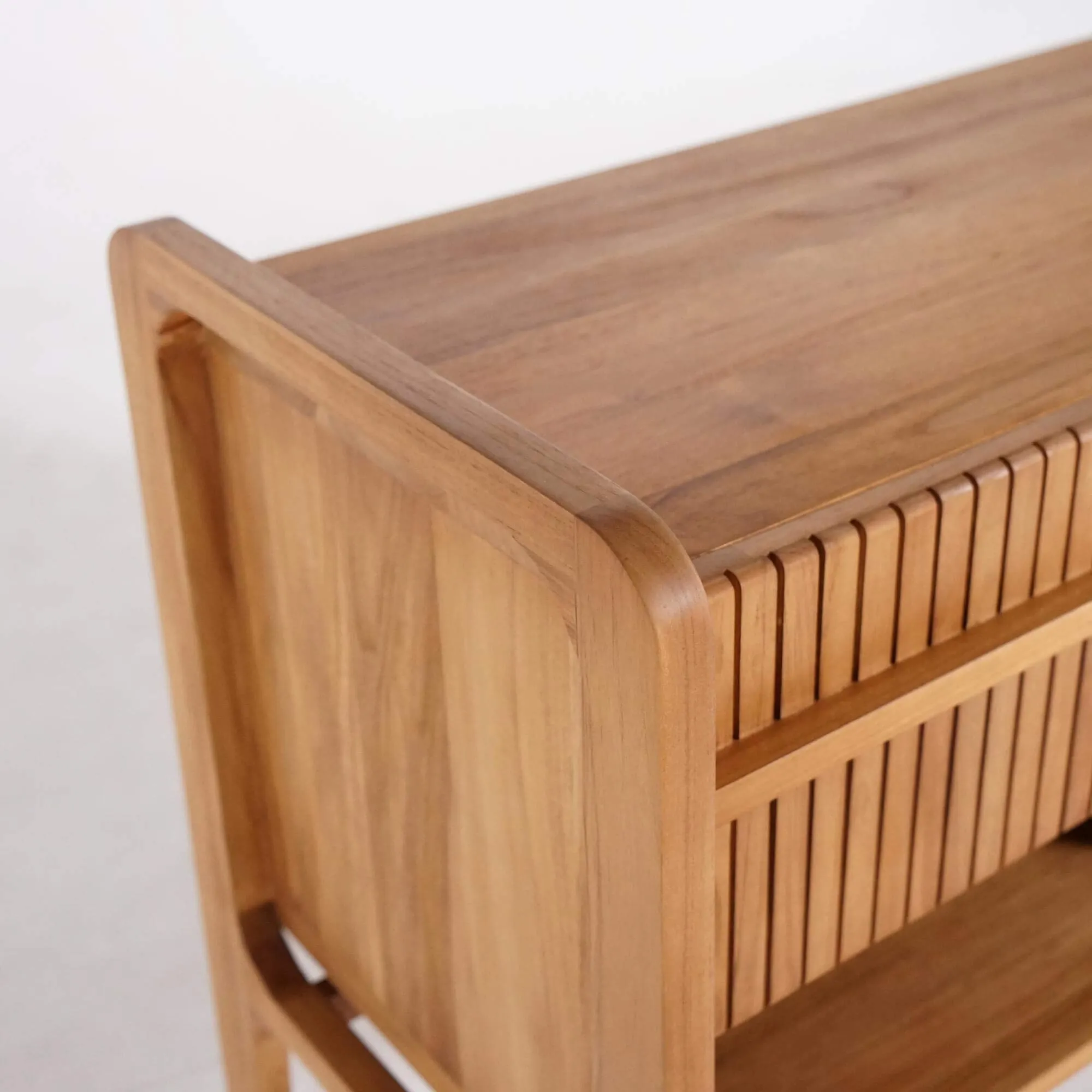 Fabriqué en bois massif de teck, reconnu pour sa résistance naturelle à l’humidité et son toucher soyeux, ce meuble de salle de bain bois teck massif double vasque conjugue esthétique et durabilité. Sa silhouette fluide, ponctuée d’angles adoucis et de contours arrondis, incarne l’esprit Japandi, ce mélange subtil entre rigueur japonaise et douceur scandinave. La façade à lames verticales offre un jeu de lumière et de texture qui anime la surface du bois, tout en dissimulant deux tiroirs spacieux à fermeture soft close. Chacun d’eux, d’une largeur de 57 cm pour une profondeur de 28 cm et une hauteur de 24,5 cm, accueille aisément vos accessoires de bain, textiles ou produits de soin.