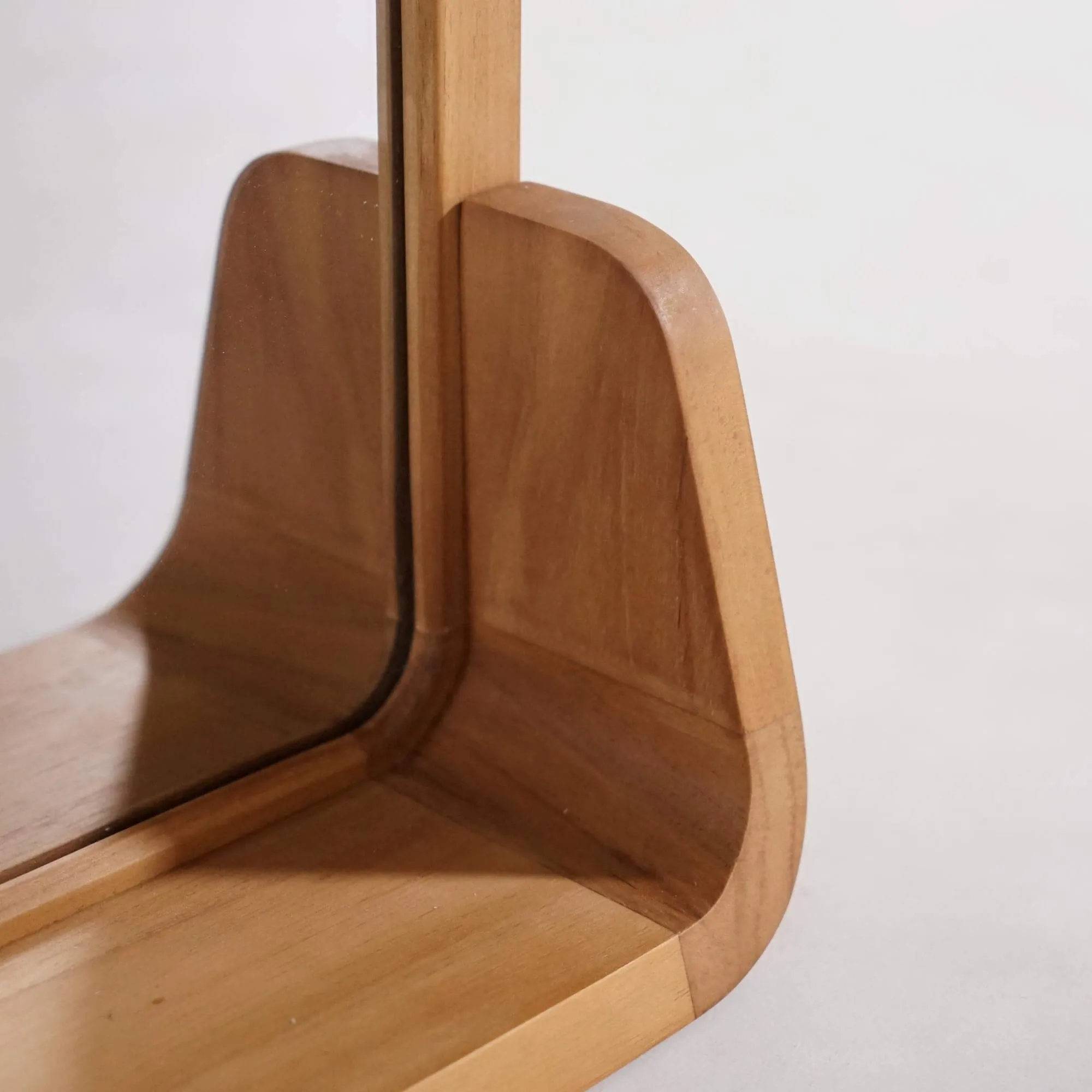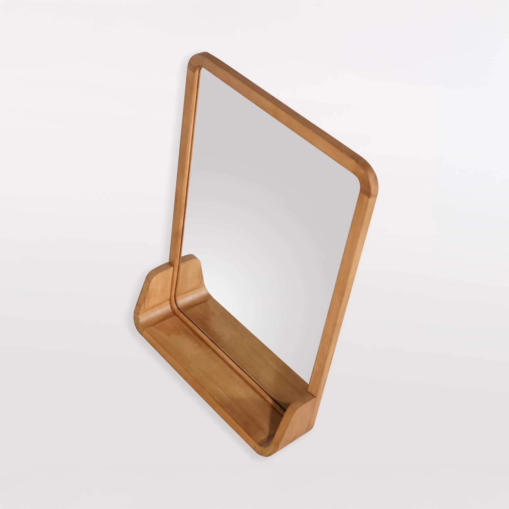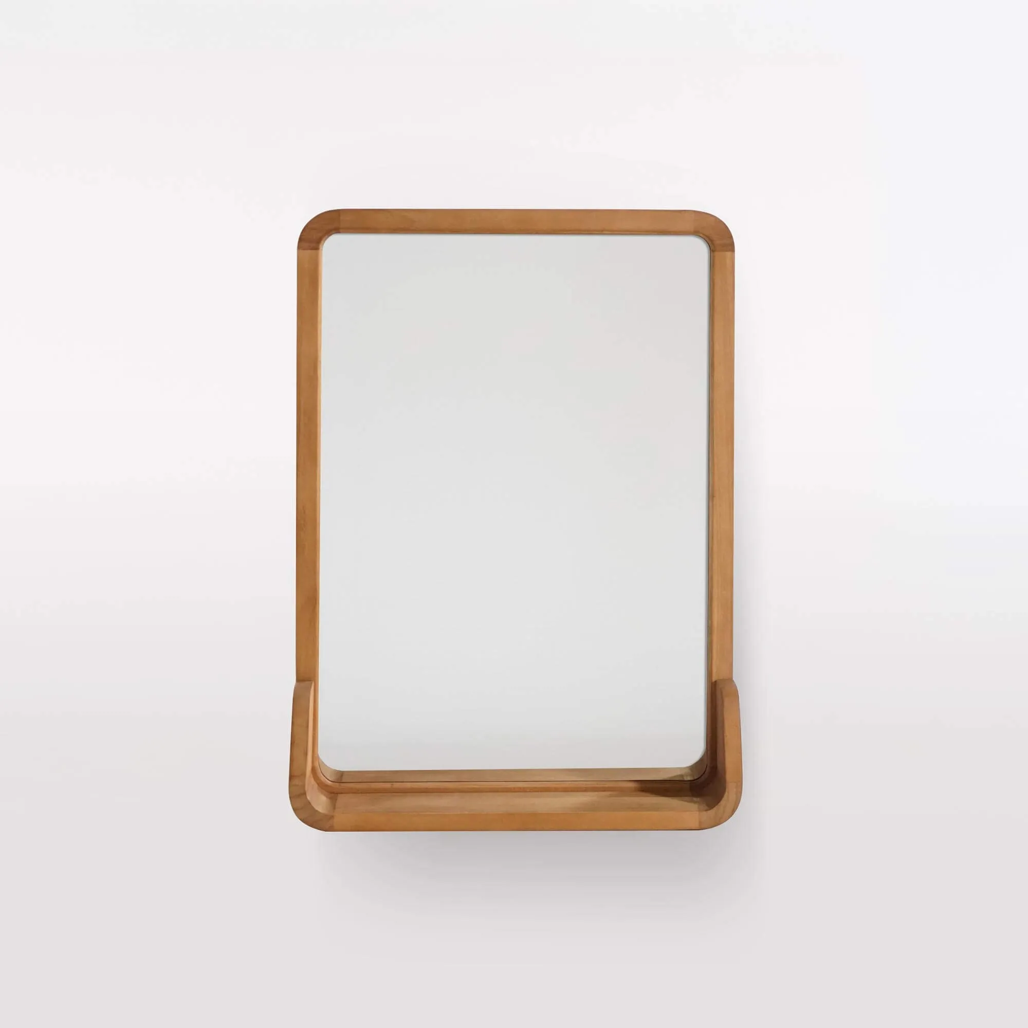 Chaque miroir rectangulaire en bois de teck avec étagère est fabriqué artisanalement, selon un savoir-faire précis qui valorise le travail du bois massif. Le teck, choisi pour sa résistance naturelle à l’humidité, dévoile ici un veinage nuancé et vivant. Les courbes arrondies de la structure témoignent d’une recherche d’équilibre entre design et ergonomie, là où chaque détail – du ponçage soyeux à la jonction parfaite des angles – a été pensé pour durer.