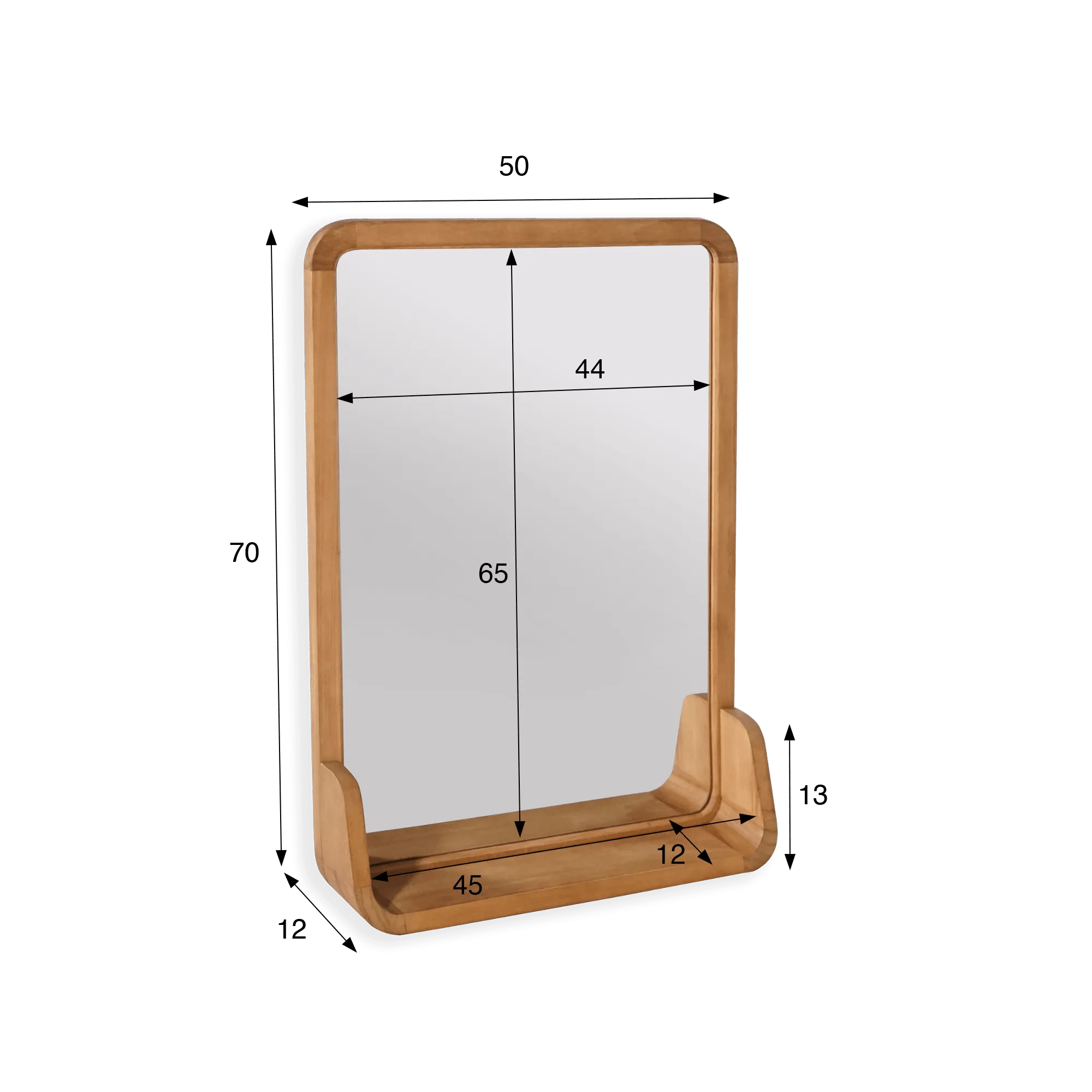 Avec ses 70 cm de haut et 50 cm de large, ce miroir rectangulaire en bois de teck avec étagère trouve aisément sa place au-dessus d’un meuble simple ou double vasque. Le cadre en teck, d’une teinte miel chaleureuse, entoure le miroir d’un liseré finement adouci, tandis qu’une petite tablette intégrée de 12 cm de profondeur vient accueillir les objets du quotidien : parfum, brosse, ou bougie décorative.