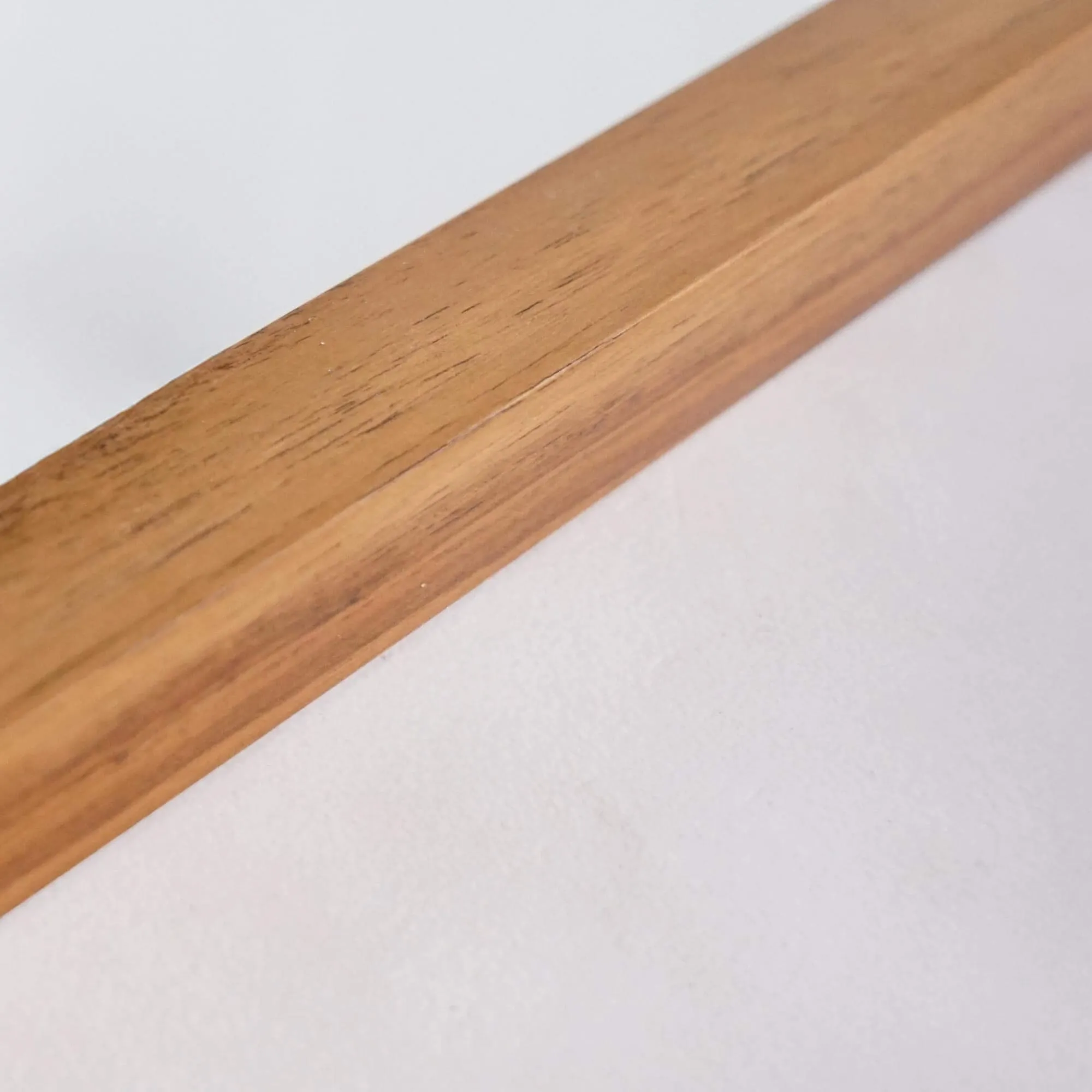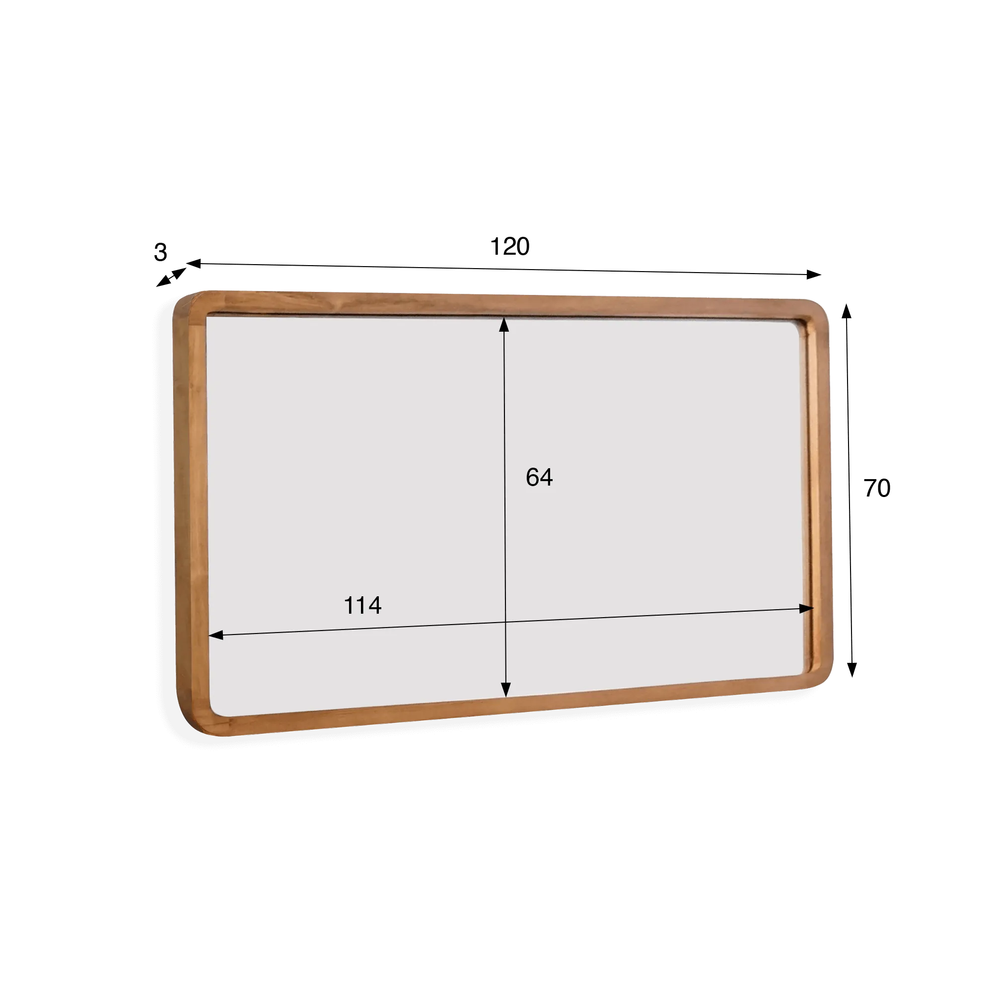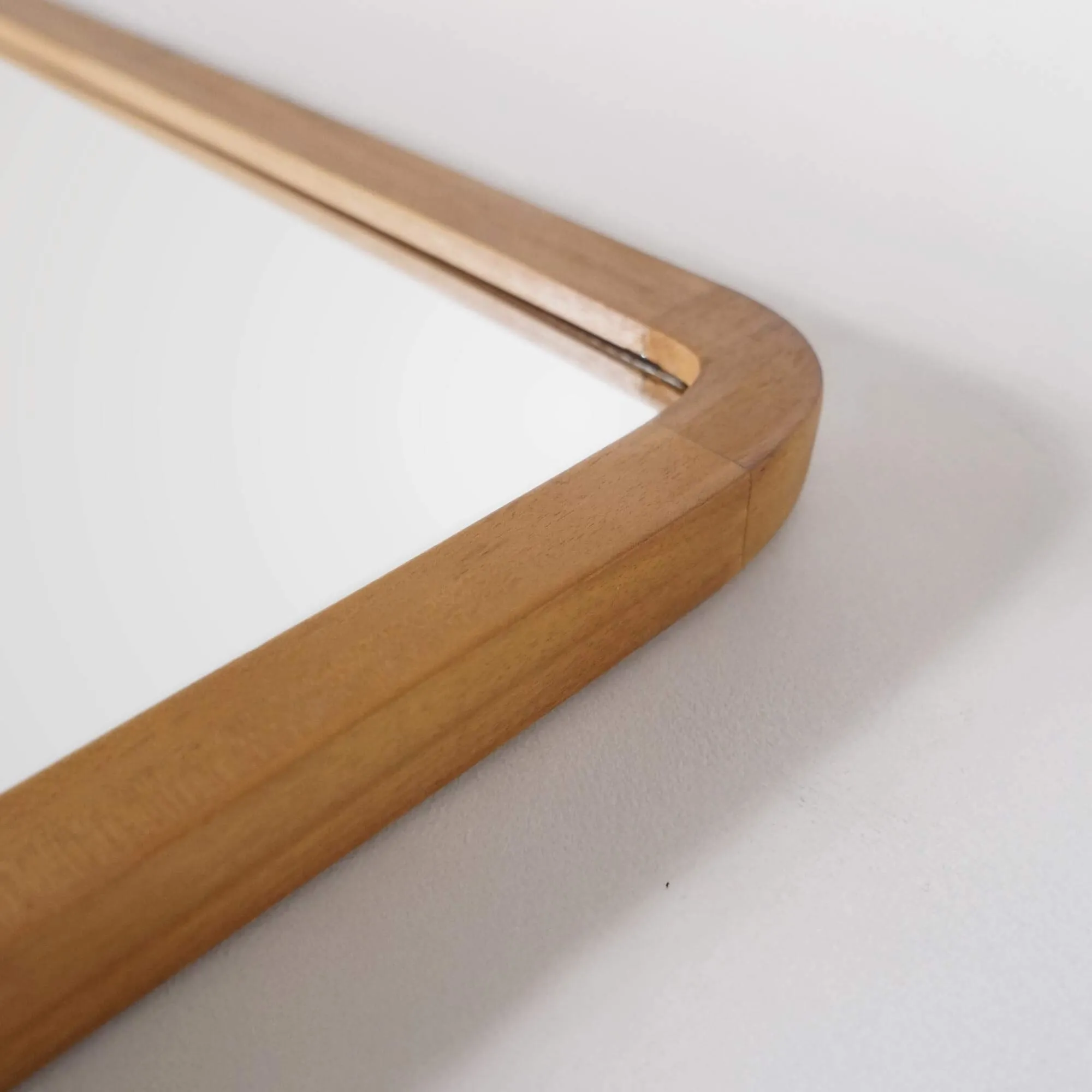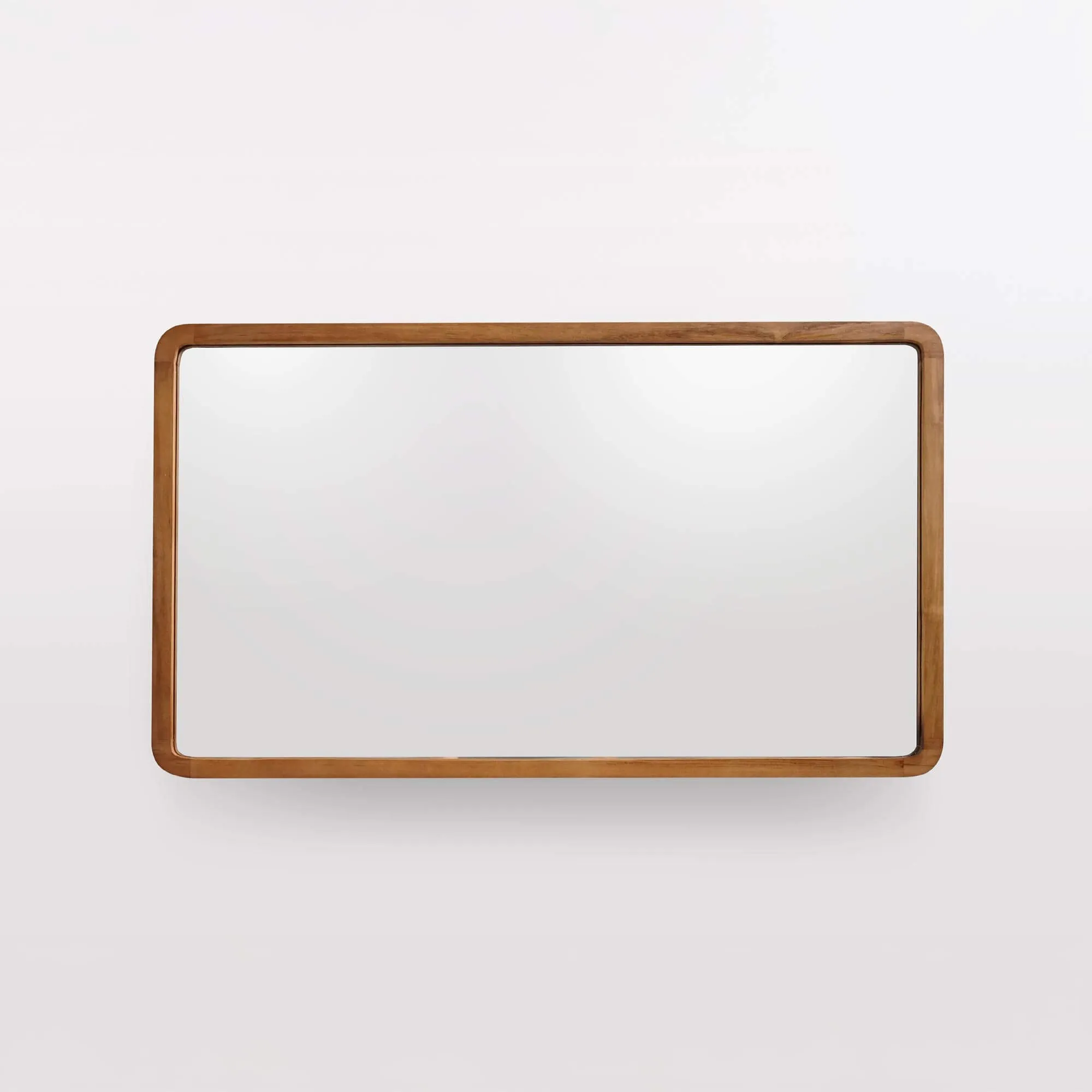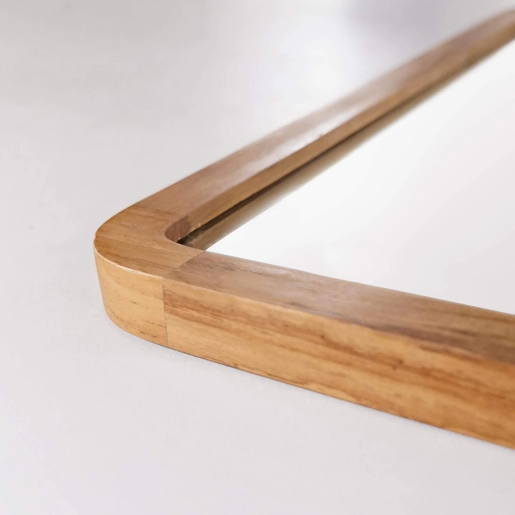 Les proportions — 120 cm de long pour 70 cm de haut et 3 cm d’épaisseur — de ce miroir de salle de bain avec bord en bois de teck ont été minutieusement étudiées pour offrir une belle surface réfléchissante (114 × 64 cm), idéale au-dessus d’un meuble double vasque. Les coins légèrement arrondis adoucissent sa silhouette et témoignent de notre attachement au détail : chaque arête est poncée à la main, chaque assemblage vérifié pour garantir une parfaite continuité du veinage du bois.