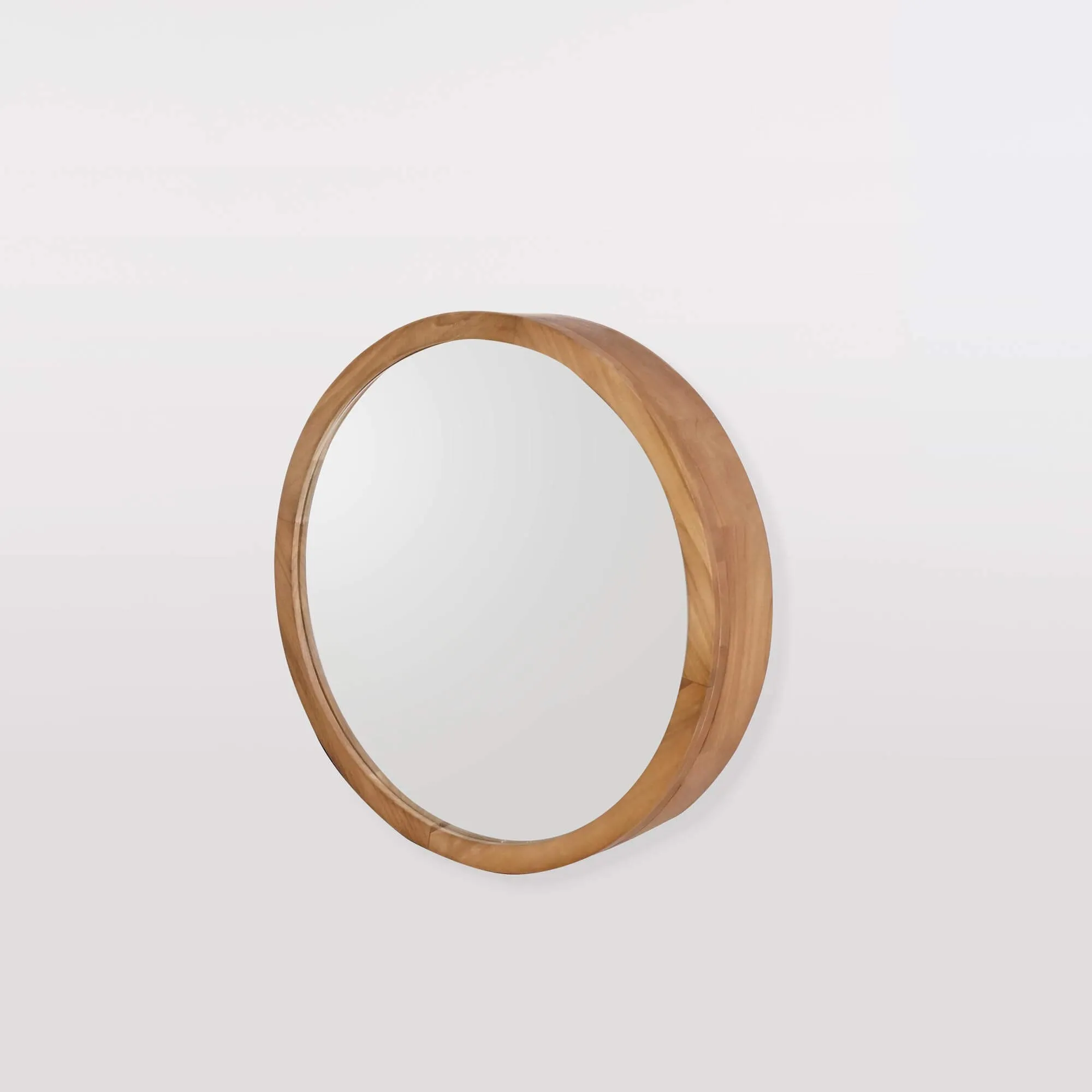 Nous avons conçu le miroir de salle de bain rond avec compartiment de rangement Devika comme une pièce à la fois décorative et ingénieuse, imaginée pour allier pureté visuelle et fonctionnalité discrète. Sous ses lignes épurées se cache un compartiment de rangement intégré, subtilement dissimulé derrière un cadre en bois massif de teck travaillé avec la précision et le sens du détail propres à nos ateliers.