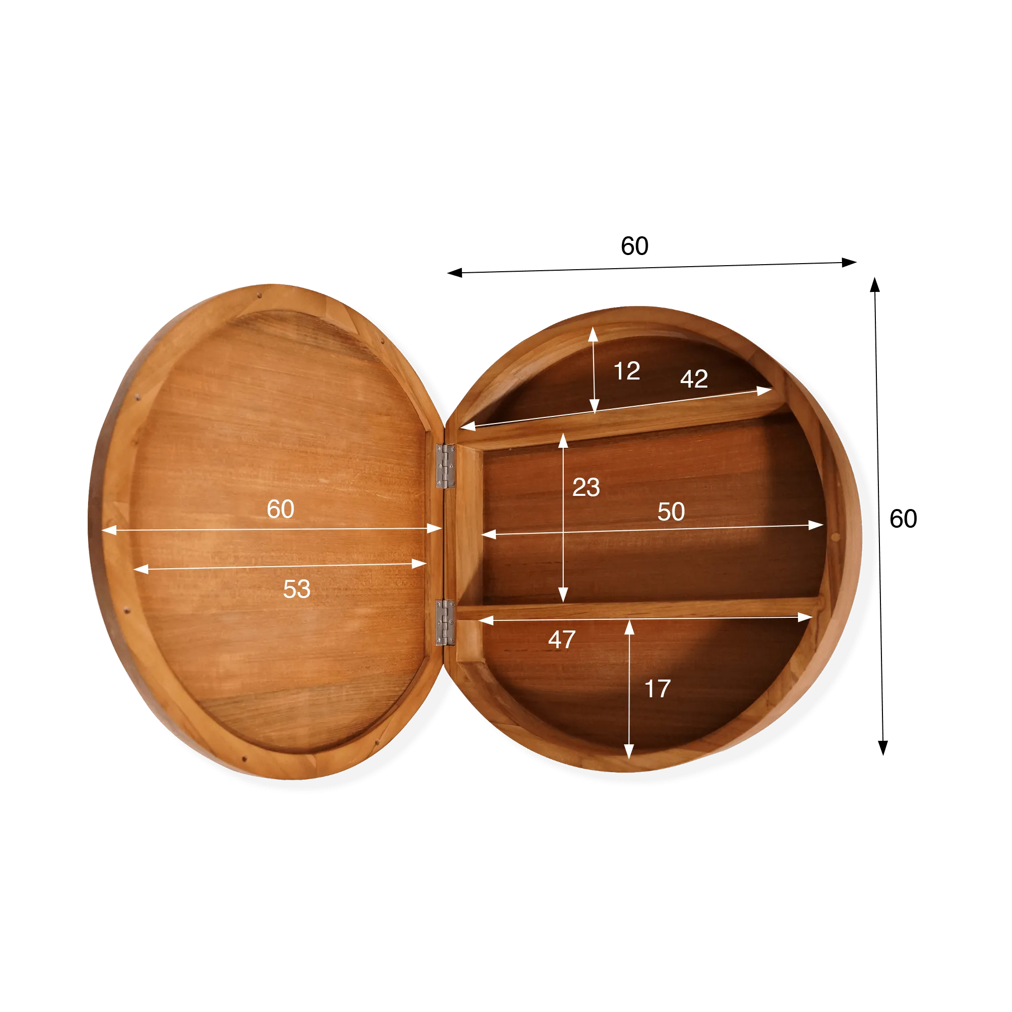 Le diamètre de 60 cm de ce miroir de salle de bain rond avec compartiment de rangement s’inscrit dans une géométrie parfaite, pensée pour s’adapter aussi bien aux petites qu’aux grandes salles de bain. À première vue, il séduit par la finesse de son cerclage et la chaleur naturelle du teck. Mais une fois ouvert, il révèle deux étagères intérieures – de 23 cm de hauteur pour l'espace central – permettant d’organiser les essentiels du quotidien : flacons, parfums ou produits de soin. Les charnières discrètes et la découpe soignée du cadre assurent une ouverture fluide et un maintien stable.