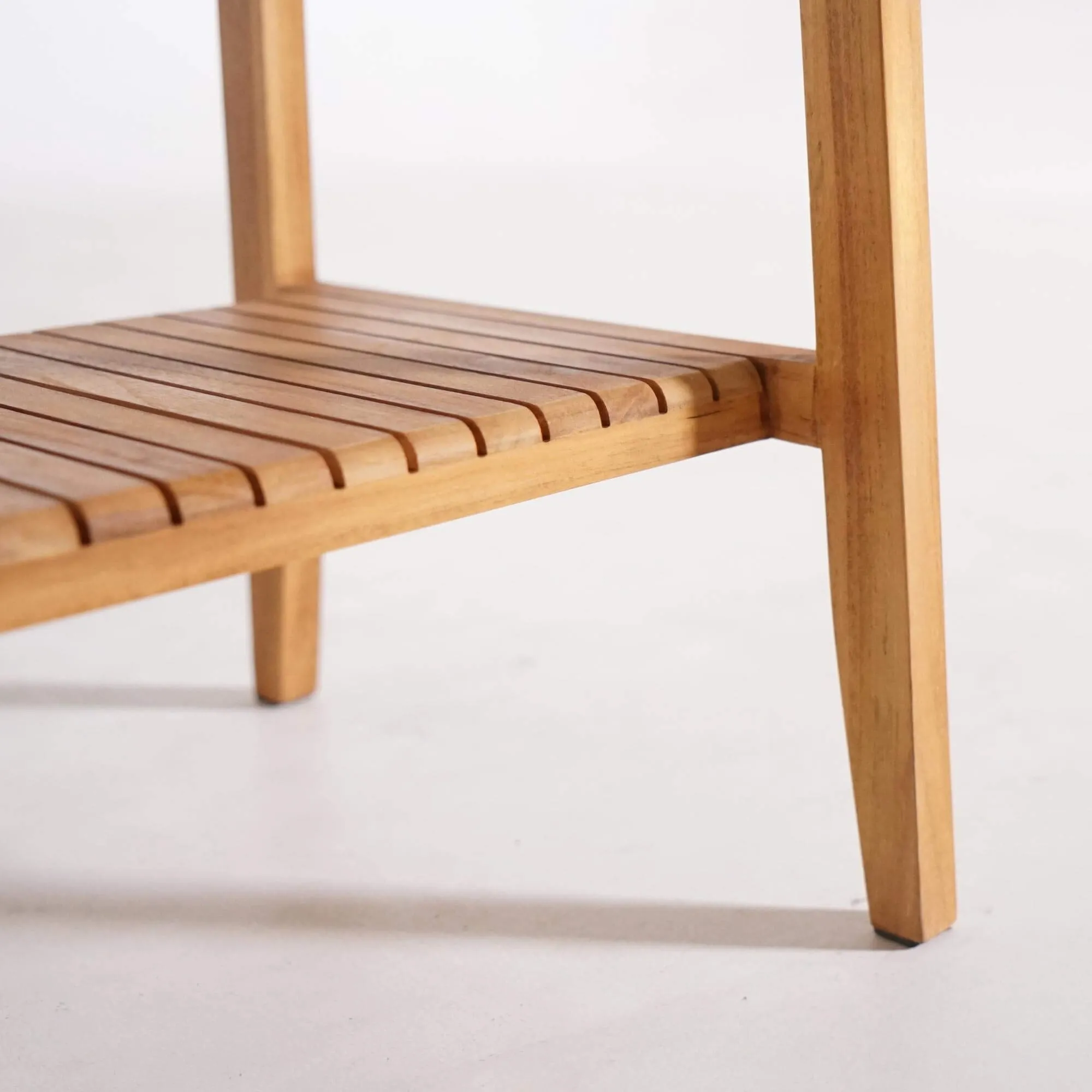 Chaque détail de notre porte serviettes de salle de bain en bois massif de teck Devika témoigne d’un savoir-faire artisanal : les angles adoucis, le ponçage manuel et la finition satinée révèlent la beauté naturelle du teck, un bois reconnu pour sa résistance à l’humidité et son toucher soyeux. Ce matériau, que nous avons choisi pour sa durabilité et sa patine chaleureuse, incarne l’authenticité et la simplicité qui nous tiennent à cœur.