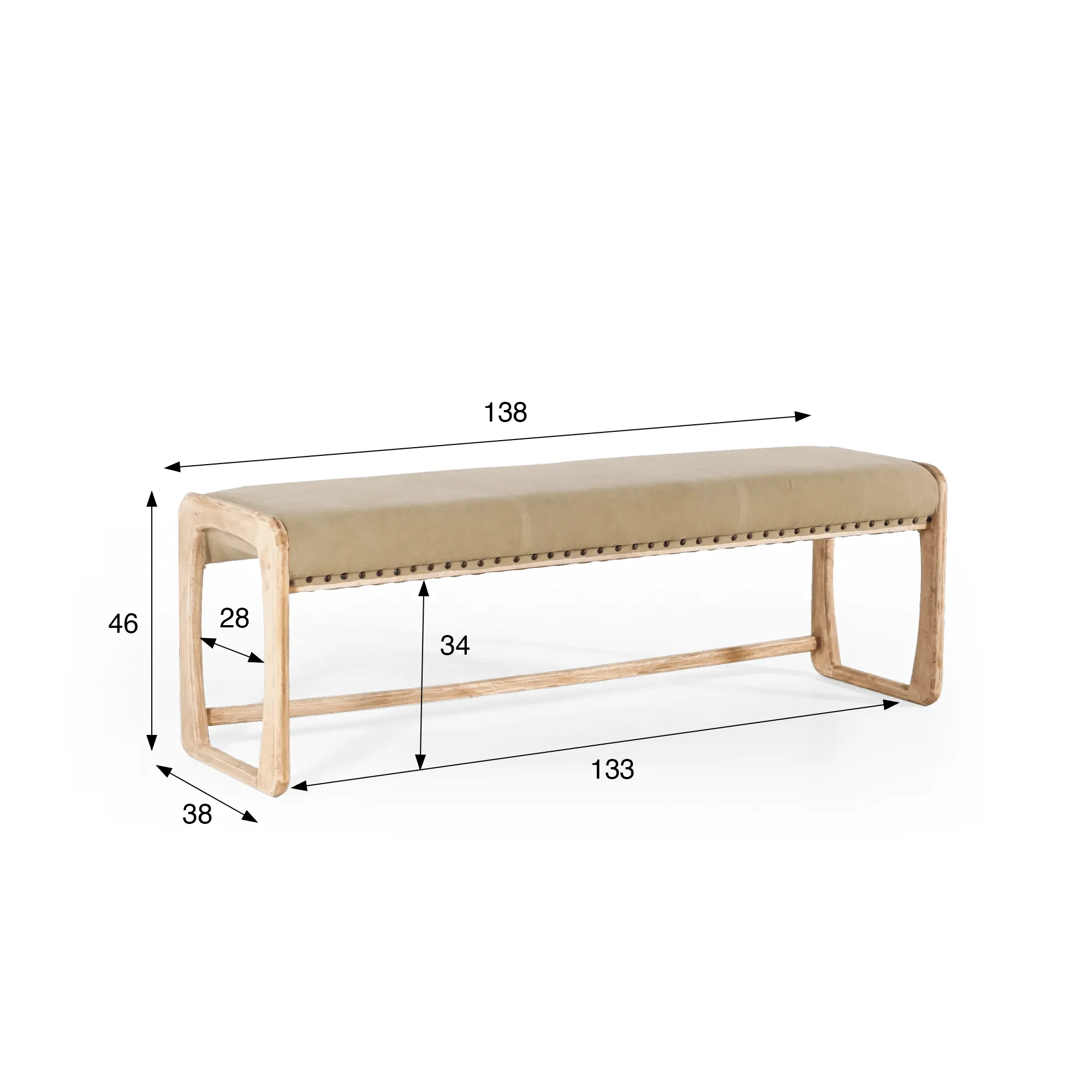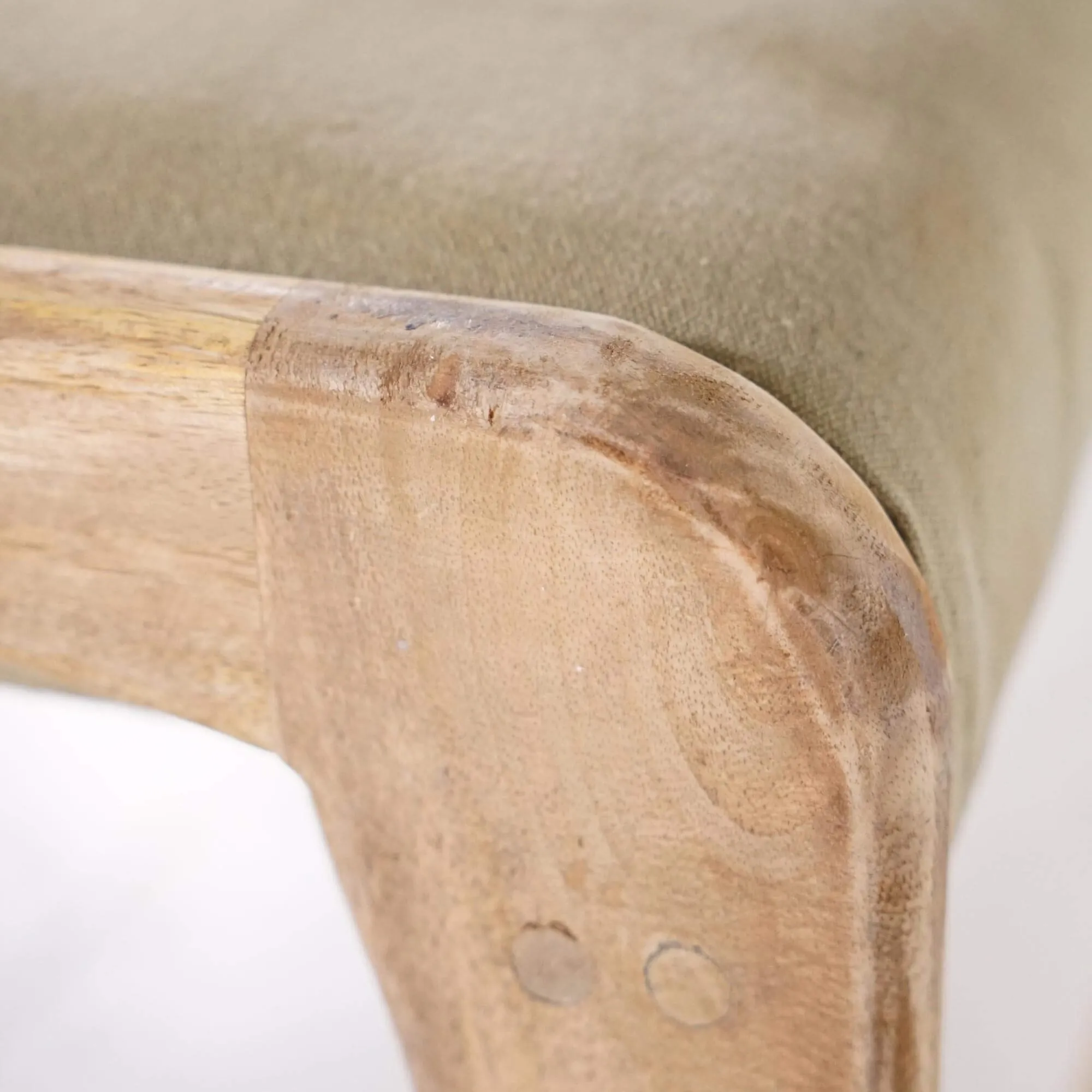 Fabriqué en bois de manguier massif, ce banc en bois massif et tissu kaki de 138 cm conjugue résistance et légèreté visuelle. Son piétement en forme de boucle, façonné dans un seul mouvement continu, révèle tout le savoir-faire artisanal mis en œuvre pour sa conception. Les lignes légèrement arrondies et la finition naturelle du bois laissent apparaître ses nuances et ses irrégularités, témoins d’un travail manuel soigné.