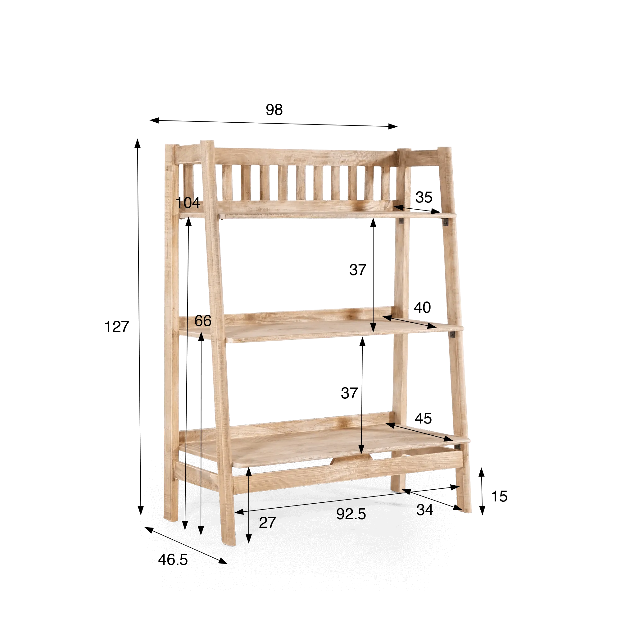 Les dimensions généreuses (98 × 46,5 × 127 cm) de cette étagère d’appoint en bois massif offrent trois niveaux de rangement espacés, avec 37 cm entre chaque tablette, permettant d’y disposer aussi bien de la vaisselle que des objets décoratifs, des livres ou des paniers. Les étagères légèrement inclinées vers l’arrière et les montants arrondis apportent une stabilité visuelle et une grande fluidité à l’ensemble. Le détail ajouré du panneau supérieur — alternance de lattes verticales en bois massif — confère une touche de légèreté et de raffinement, signature du savoir-faire BARAK 7.