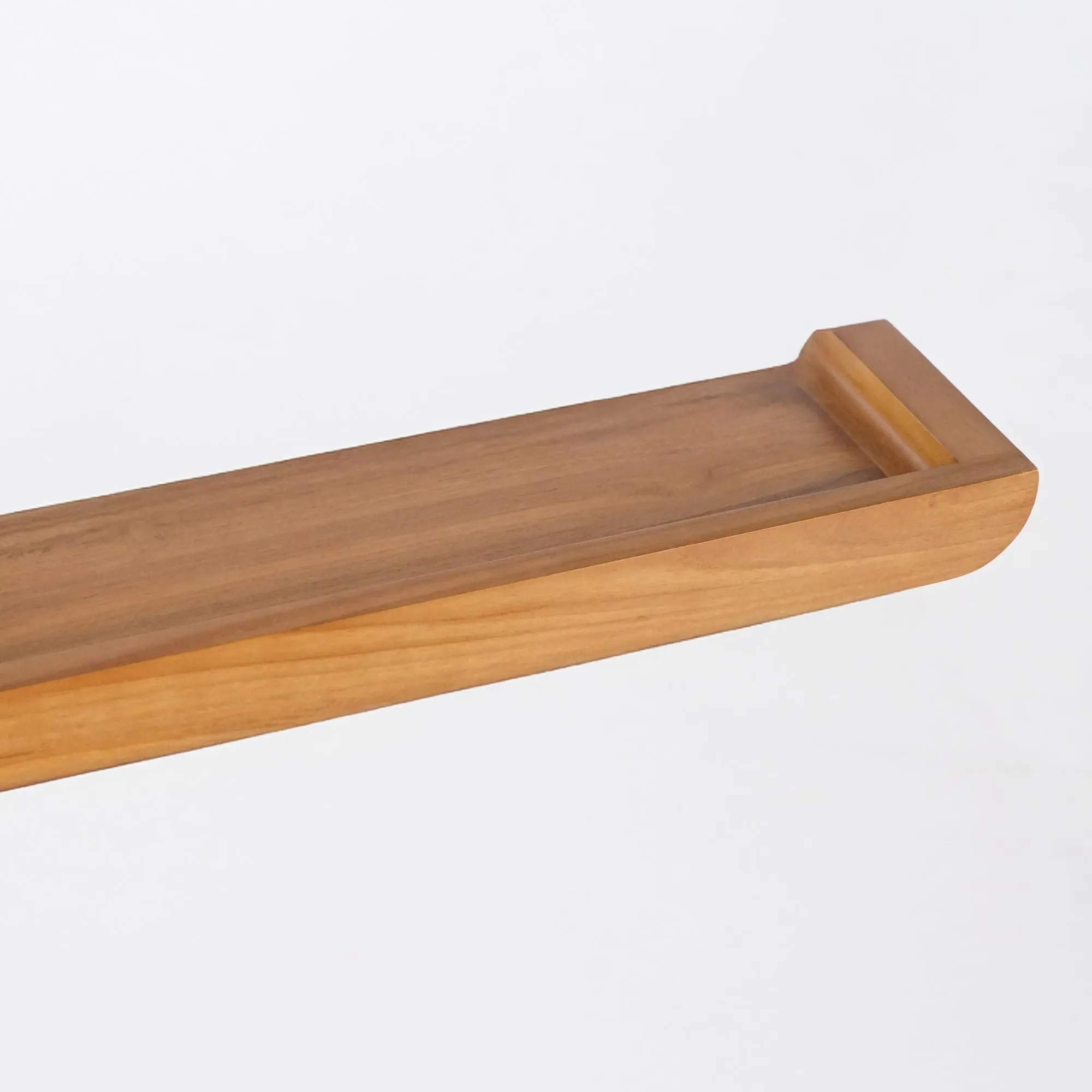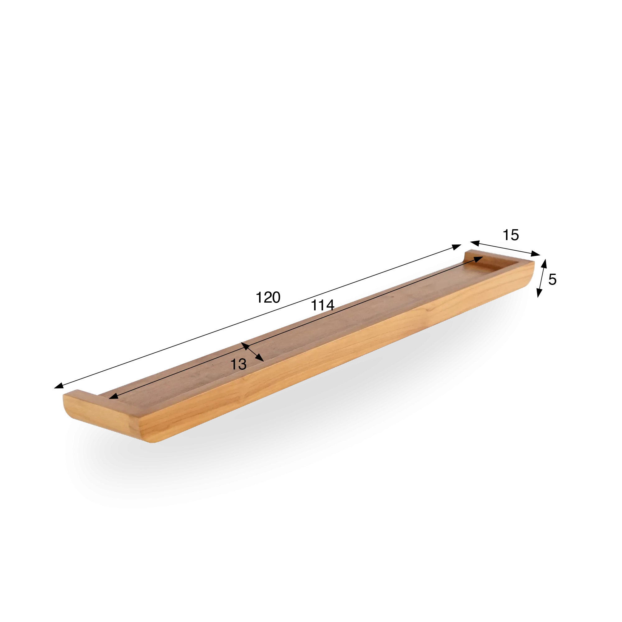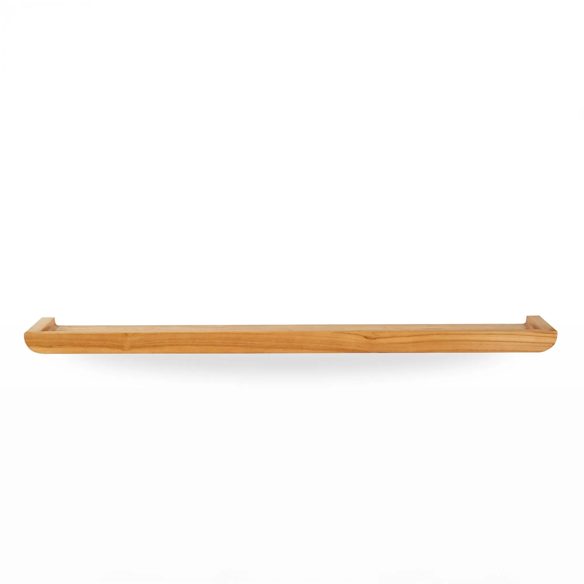Avec ses proportions équilibrées — 120 cm de long, 15 cm de profondeur et 5 cm de hauteur —, cette étagère murale en bois de teck massif offre un espace généreux pour accueillir des objets du quotidien : flacons, savons, bougies ou petites plantes décoratives. La bordure subtilement relevée maintient les éléments avec délicatesse, tout en dessinant une silhouette fluide.