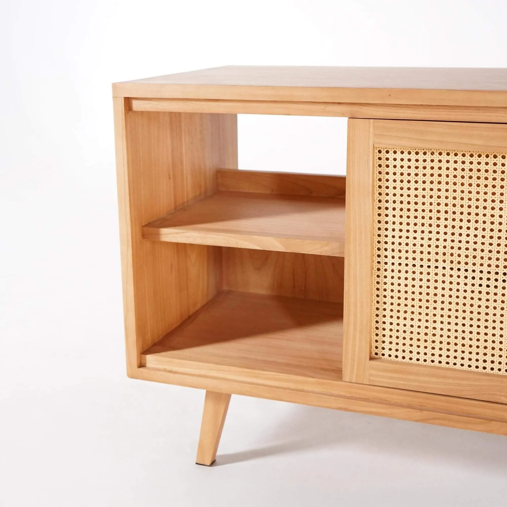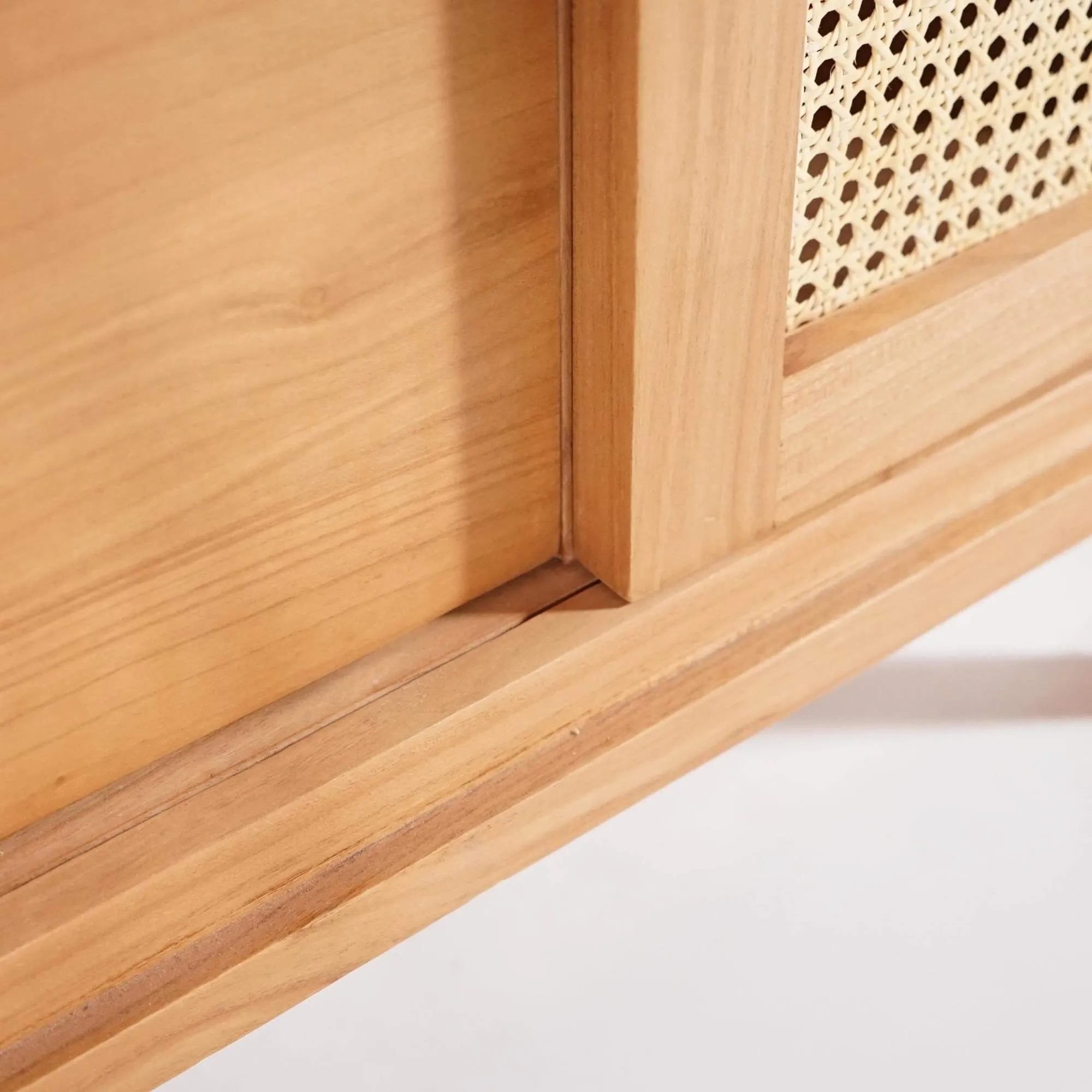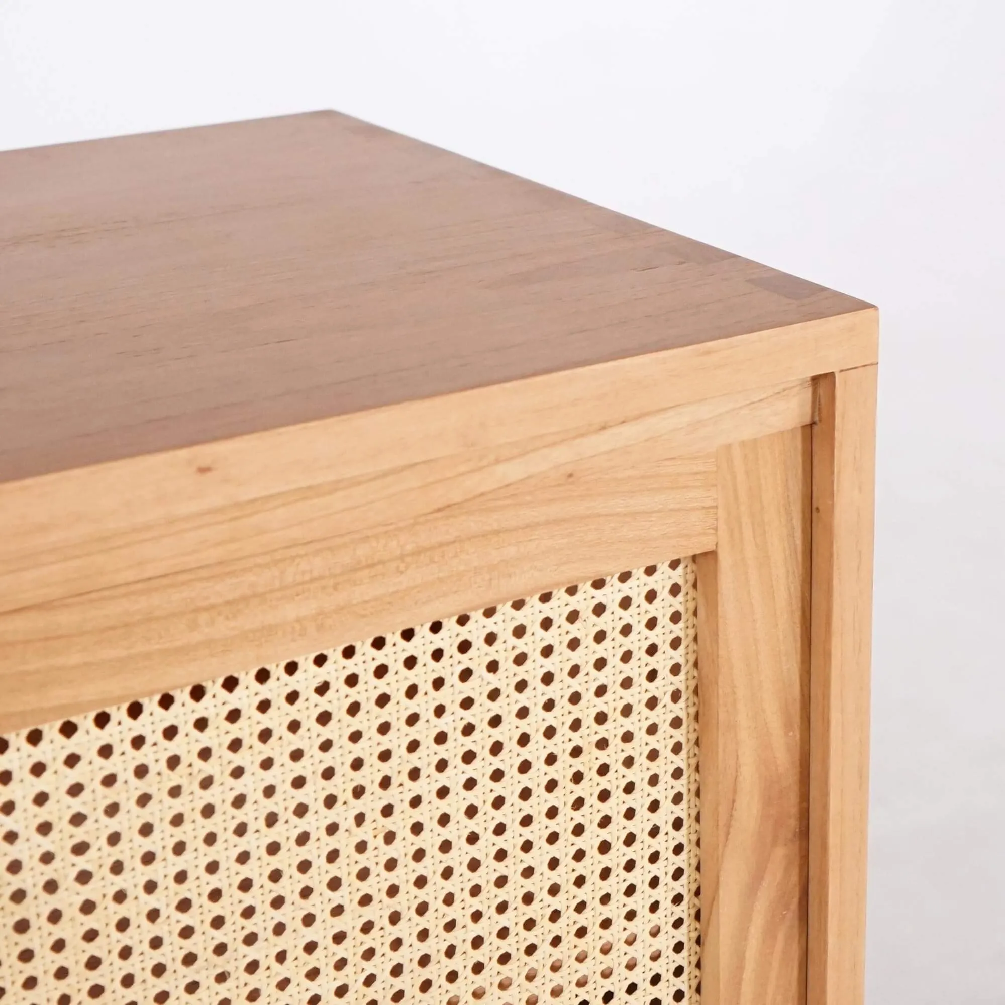 Conçu en bois massif de mindi, essence reconnue pour sa résistance naturelle à l’humidité et sa stabilité dans le temps, le meuble salle de bain en bois massif sur pieds Anaya allie robustesse et finesse. Le veinage du bois, laissé visible sous une finition satinée, offre un rendu chaleureux et vivant, unique à chaque pièce. Les portes coulissantes en façade intègrent un cannage naturel finement ajouré, tressé à la main, qui allège la silhouette du meuble tout en laissant respirer son contenu.