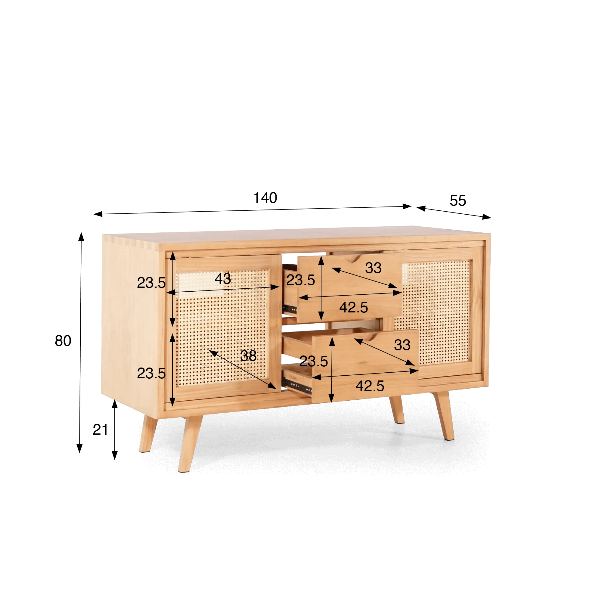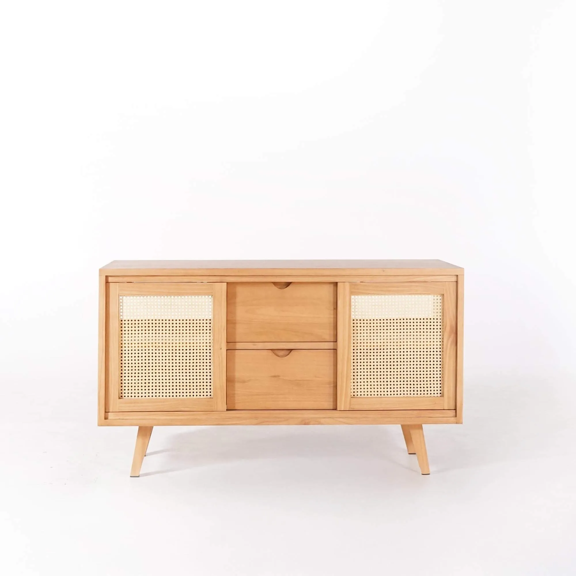 Derrière ces portes, un espace de rangement bien pensé accueille facilement les essentiels du quotidien. À cela s’ajoutent deux tiroirs centraux de 42,5 cm de largeur et 33 cm de hauteur, montés sur glissières métalliques à ouverture fluide, idéaux pour organiser les petits accessoires de toilette. De part et d’autre, les compartiments latéraux de ce meuble salle de bain en bois massif sur pieds mesurent 43 cm de largeur et 23,5 cm de hauteur d'étagère, permettant d’y ranger serviettes, paniers ou produits de soin. L’ensemble, porté par des pieds obliques en bois massif de 21 cm de haut, confère au meuble une allure aérienne et élégante, tout en facilitant le nettoyage du sol.