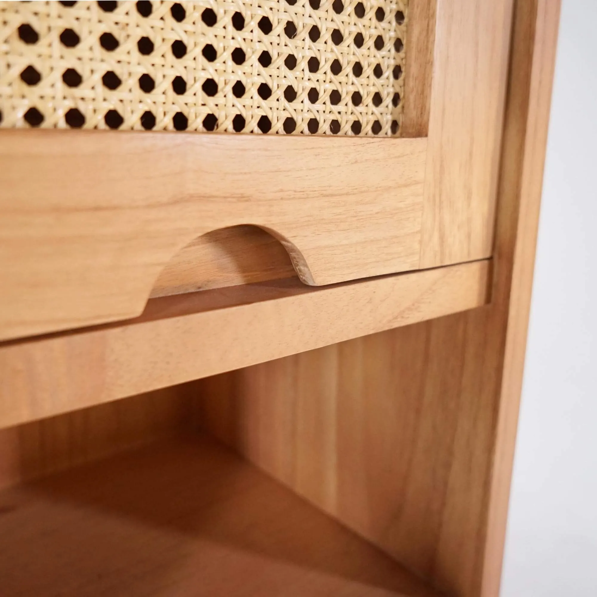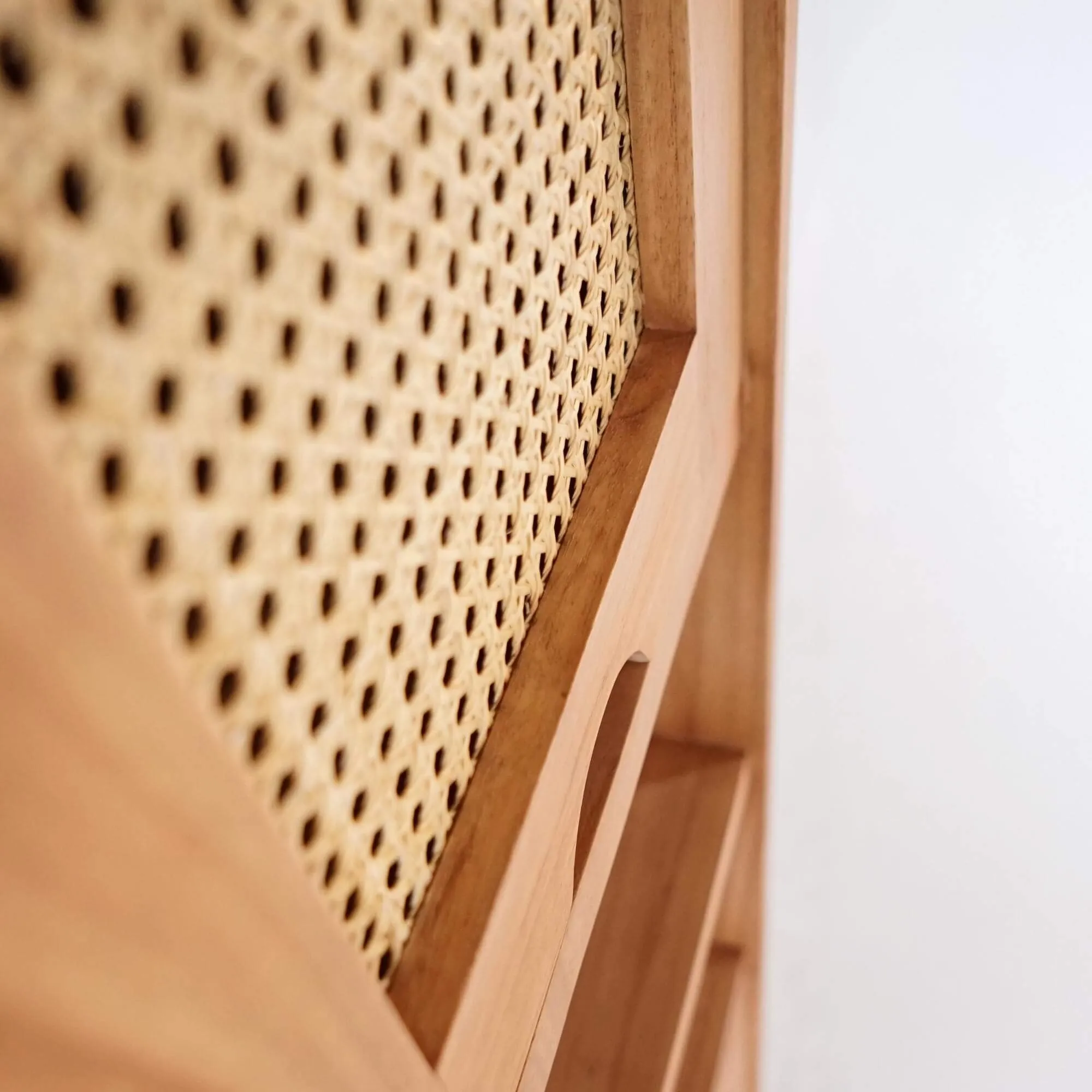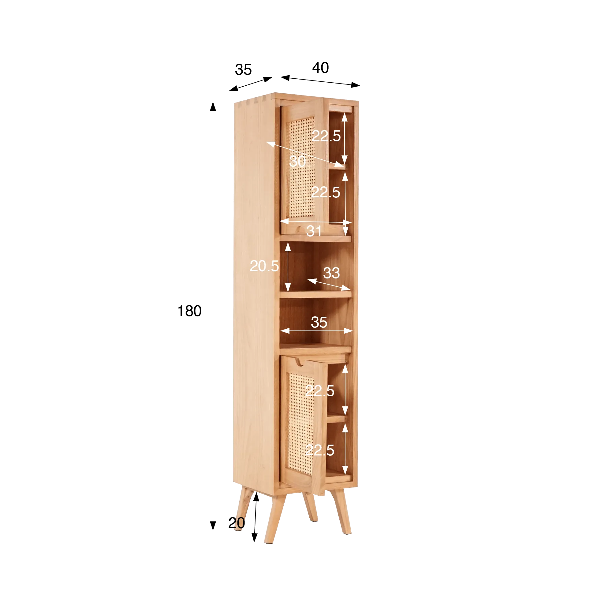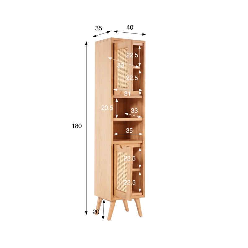 L’agencement intérieur de cette colonne de salle de bain en bois se compose de deux niches ouvertes et de deux compartiments fermés par des portes battantes en cannage tressé à la main. Les étagères, d’une profondeur de 35 cm et d’une hauteur de 22,5 cm, offrent un rangement modulable pour vos serviettes, produits de soin ou accessoires de bain. Les poignées discrètes creusées dans le bois participent à la pureté du dessin, tandis que les pieds inclinés, à fixer facilement, élancent la structure et assurent une parfaite stabilité.