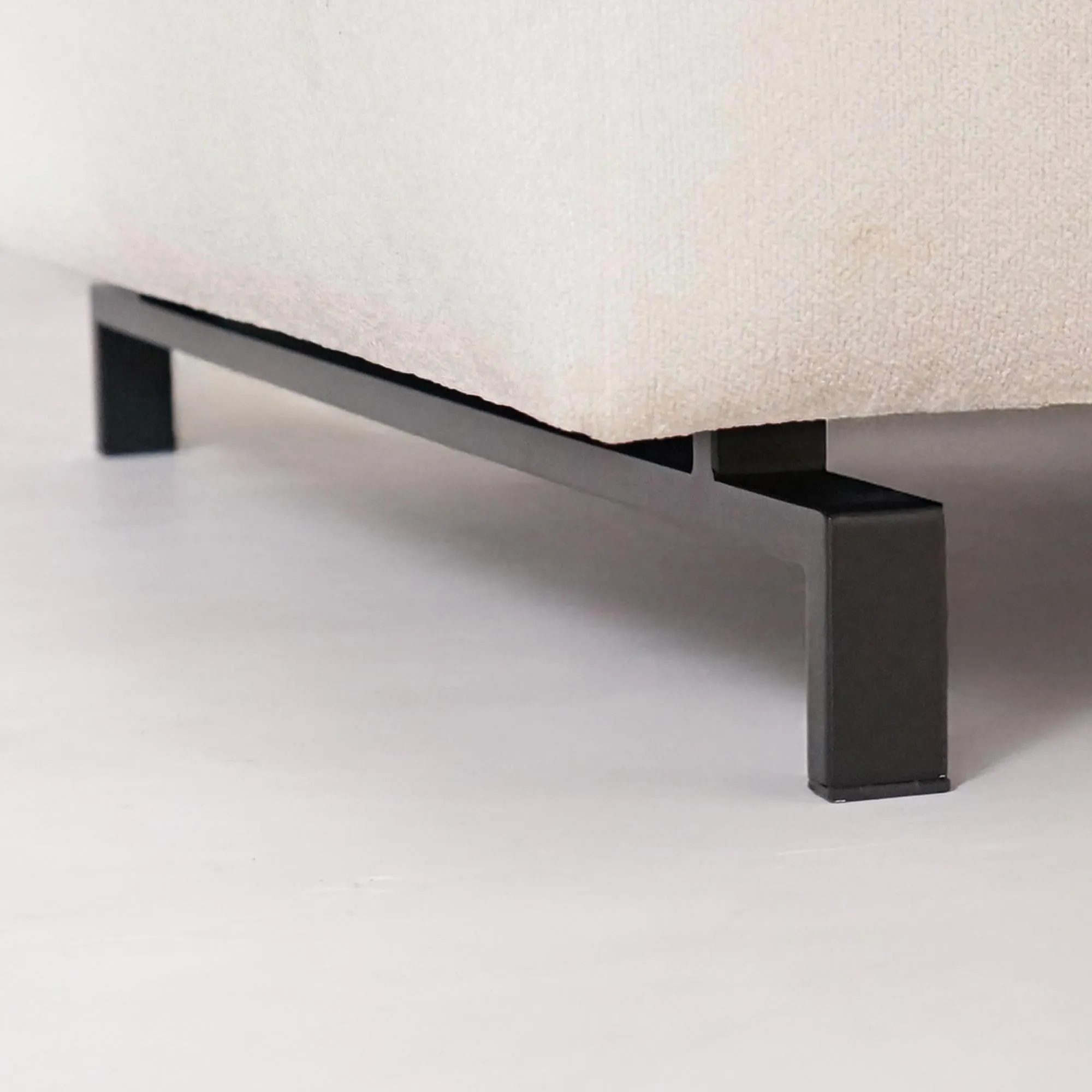 Les pieds en métal noir, fins et géométriques, soulèvent la structure pour lui apporter légèreté et modernité. Leur discrétion met en valeur la pureté du volume et souligne le contraste avec le revêtement clair.