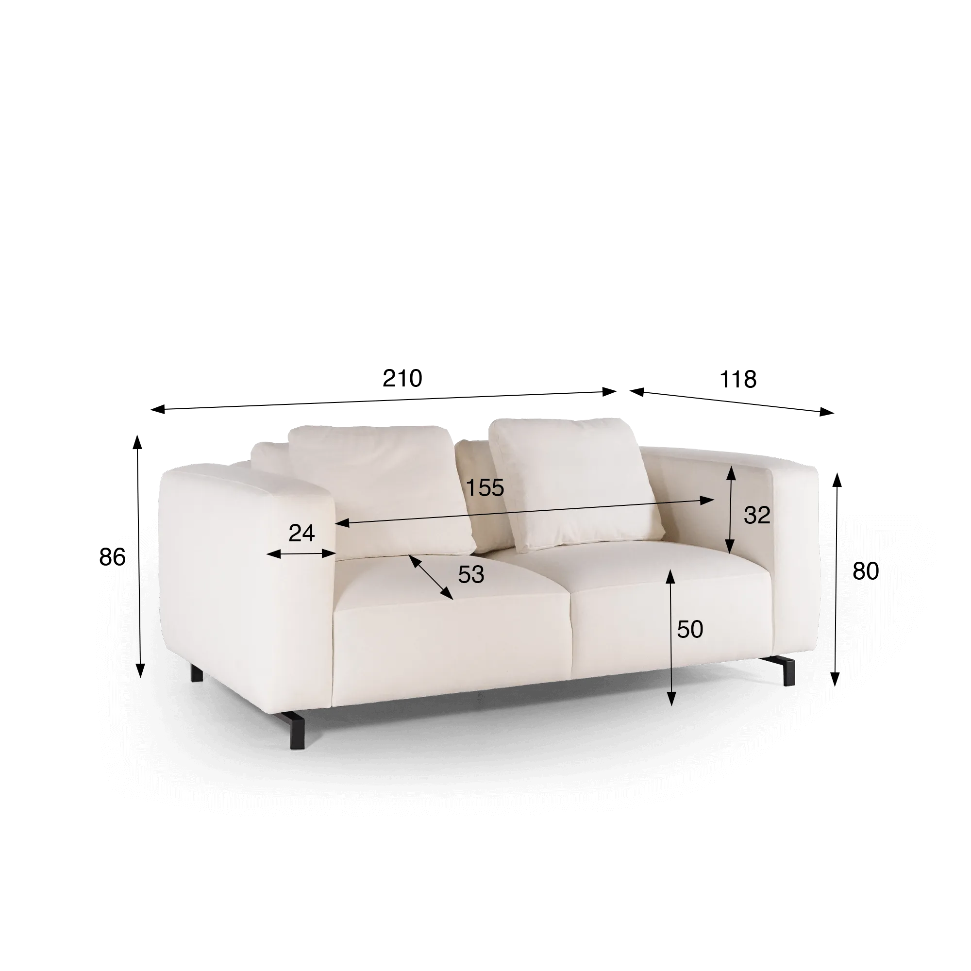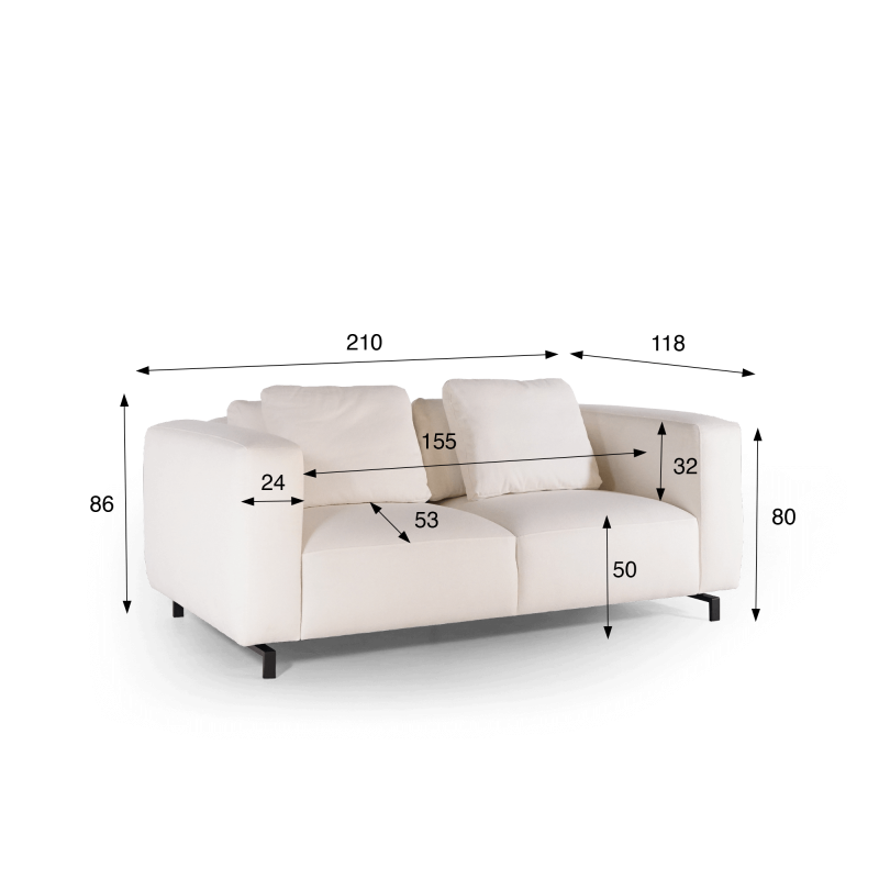 Conçu dans une structure alliant bois de pin, hêtre et contreplaqué, le canapé moderne 3 places Miro offre une base solide et durable. Le garnissage, réalisé de manière artisanale, associe une mousse haute résilience et une suspension à sangles croisées pour un confort d’assise idéal. Les coussins de dossier, amovibles et moelleux, renforcent cette impression d’accueil et de douceur. Avec ses 210 cm de long, 118 cm de profondeur et 86 cm de hauteur, il offre un espace généreux, parfaitement proportionné pour trois personnes.