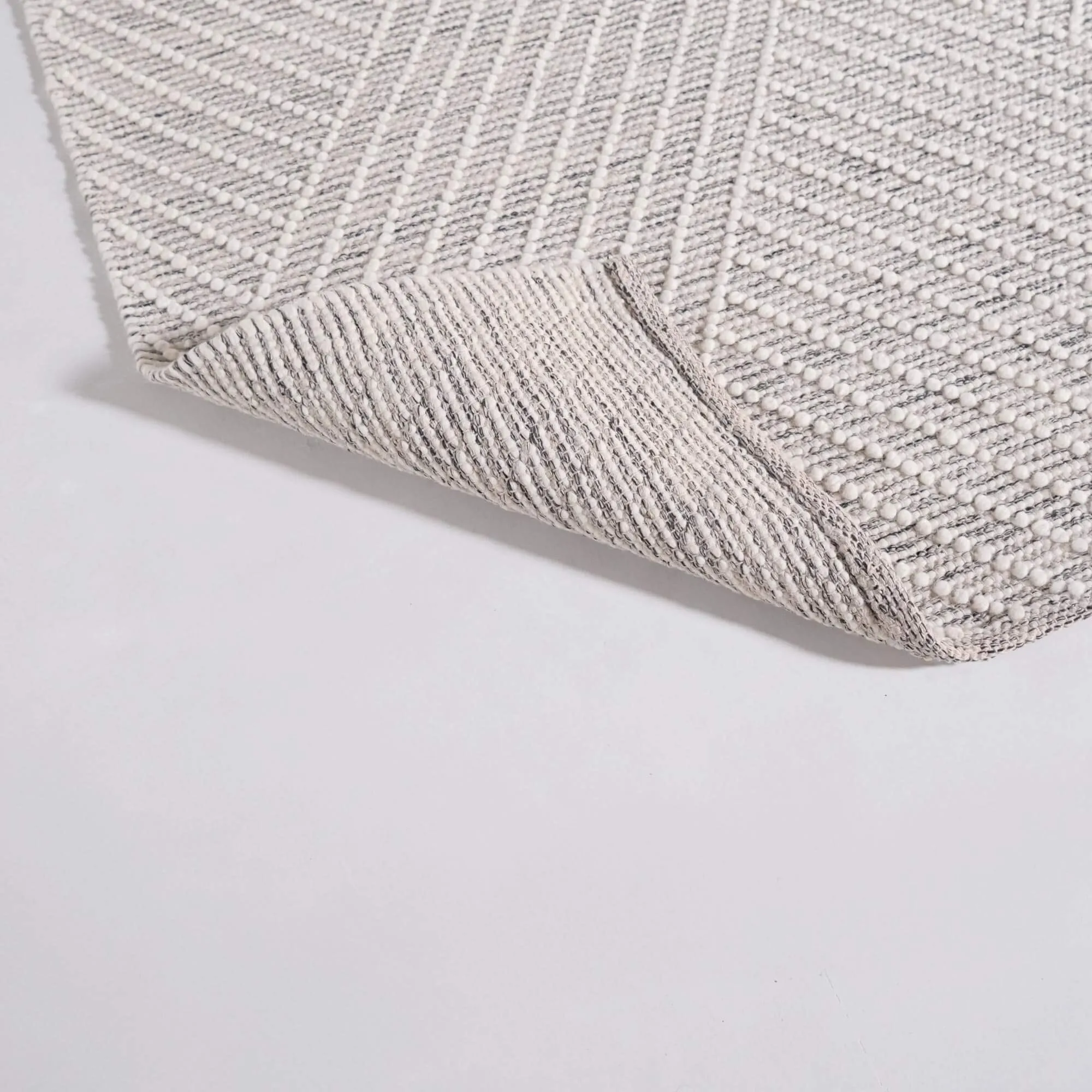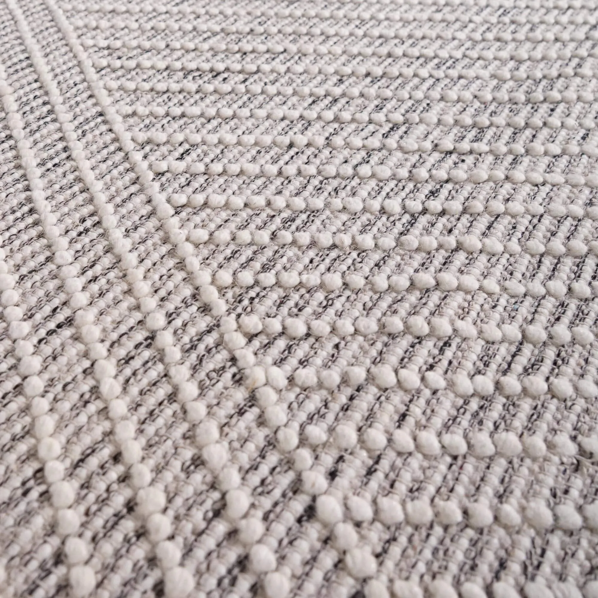 Entièrement confectionné à la main, le tapis en laine Arvo est réalisé en laine 100 % naturelle. Ce choix s’est imposé pour sa douceur immédiate, mais aussi pour sa résistance dans le temps. Sous les pieds, le toucher est souple, légèrement texturé, avec ce relief délicat qui accroche la lumière et fait vibrer les nuances de blanc et de noir. L’épaisseur d’environ 4 mm a été volontairement pensée pour offrir un confort agréable sans créer de surépaisseur, ce qui permet de glisser facilement le tapis sous une table basse ou au pied d’un fauteuil.