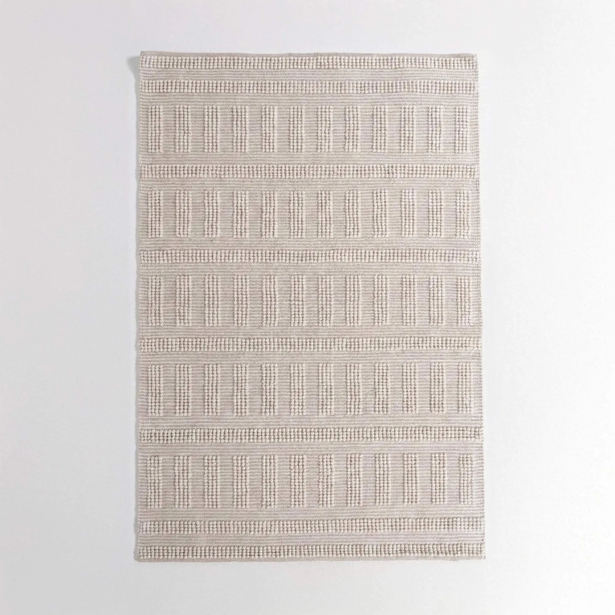 Le dessin du tapis en laine Vela repose sur un jeu de reliefs rythmé, structuré en bandes régulières ponctuées de motifs en laine bouclée. Ce travail de texture apporte une lecture graphique discrète, inspirée de l’artisanat ethnique, tout en restant parfaitement adaptée à des intérieurs contemporains. Les motifs, légèrement surélevés, créent un contraste tactile délicat avec la trame plus lisse du fond, invitant naturellement au toucher.