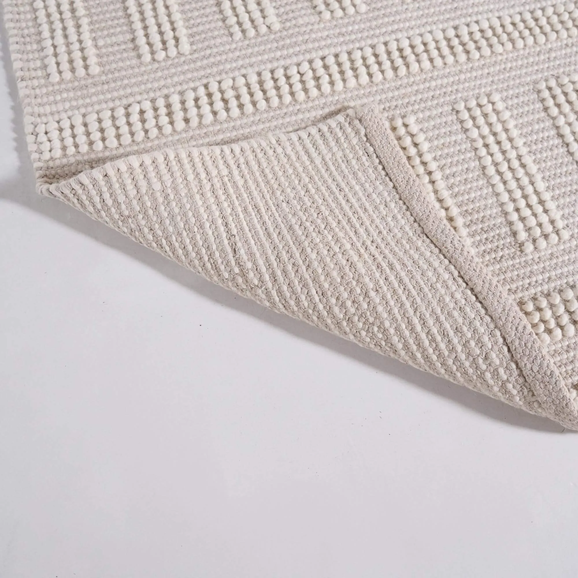 Entièrement réalisé à la main, le tapis en laine Vela est confectionné en laine 100 % naturelle. Cette matière, que nous avons choisie pour sa robustesse autant que pour son confort, offre un toucher souple et chaleureux, agréable sous les pieds. Avec une épaisseur d’environ 4 mm, ce tapis en laine conserve une belle tenue tout en restant facile à intégrer sous un fauteuil, une table basse ou dans un espace de passage. La laine révèle ici toute sa richesse : elle capte la lumière de manière subtile, nuance le blanc beige et crée une profondeur visuelle qui évolue au fil de la journée.
