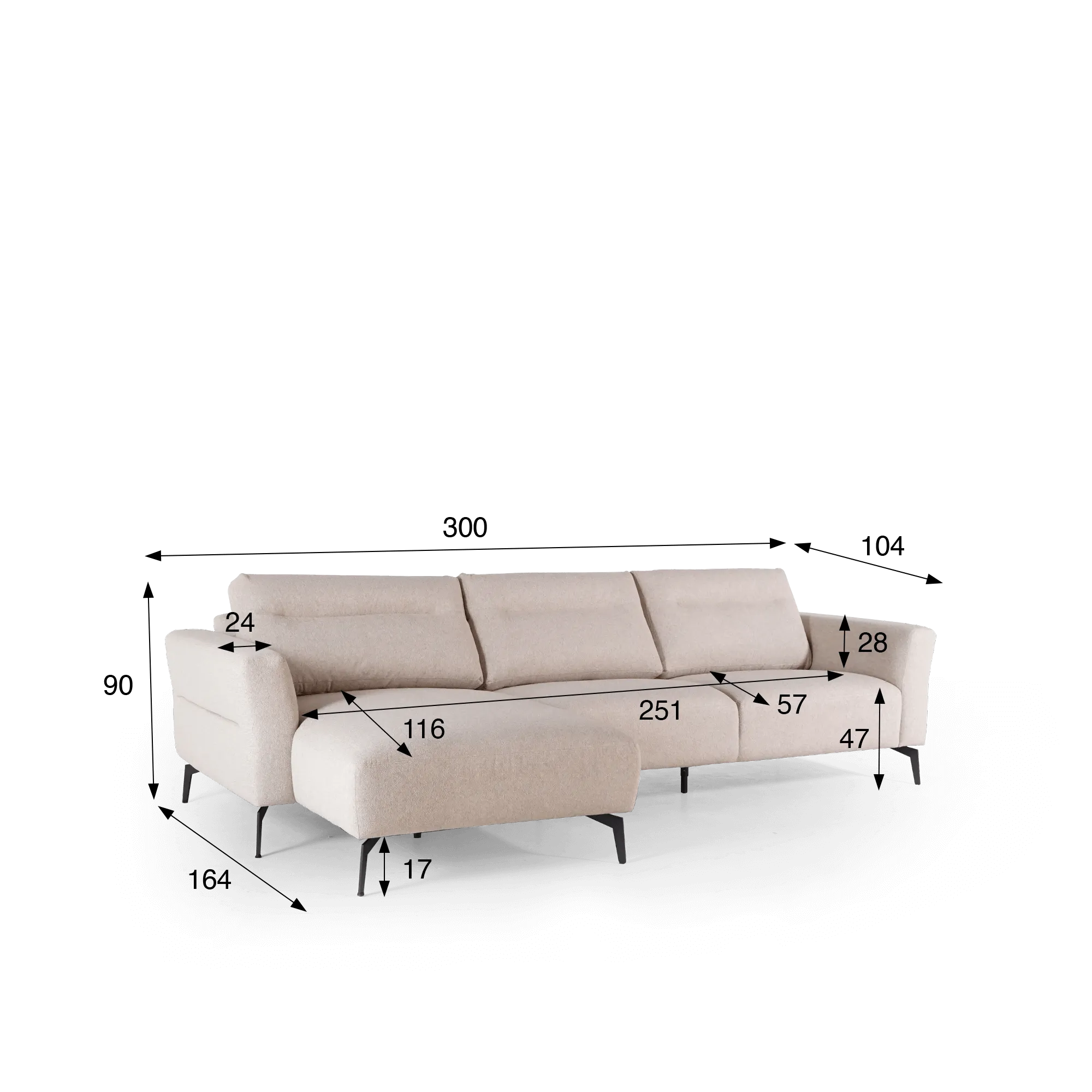 Les assises de ce canapé d'angle 4 places avec méridienne gauche, généreusement rembourrées, associent plusieurs densités de mousse et ressorts ensachés pour un confort équilibré, tandis que les dossiers légèrement inclinés et les accoudoirs larges offrent un soutien agréable. L’assise est positionnée à 47 cm de hauteur, un niveau pensé pour conjuguer ergonomie et aisance. Ses pieds en métal noir de 17 cm, fins et légèrement inclinés, apportent une touche contemporaine tout en donnant de la légèreté à l’ensemble.