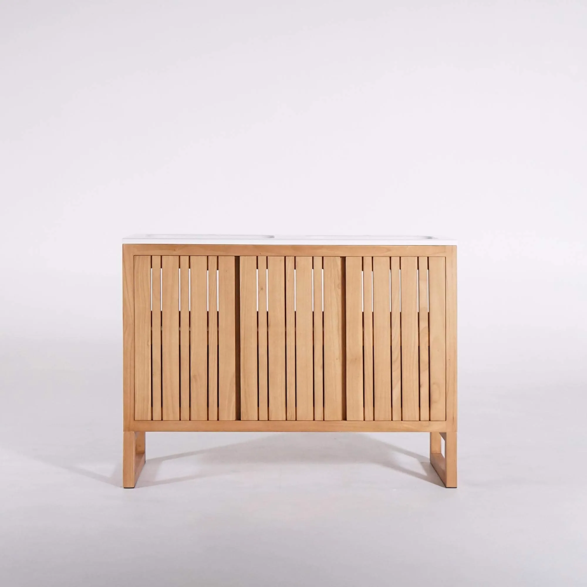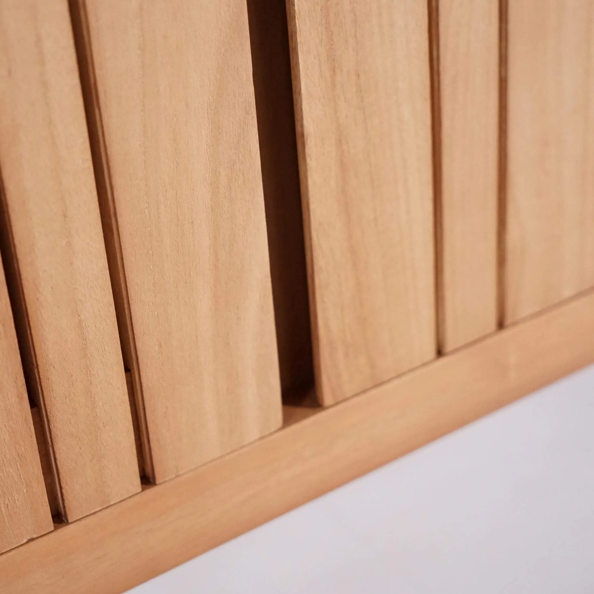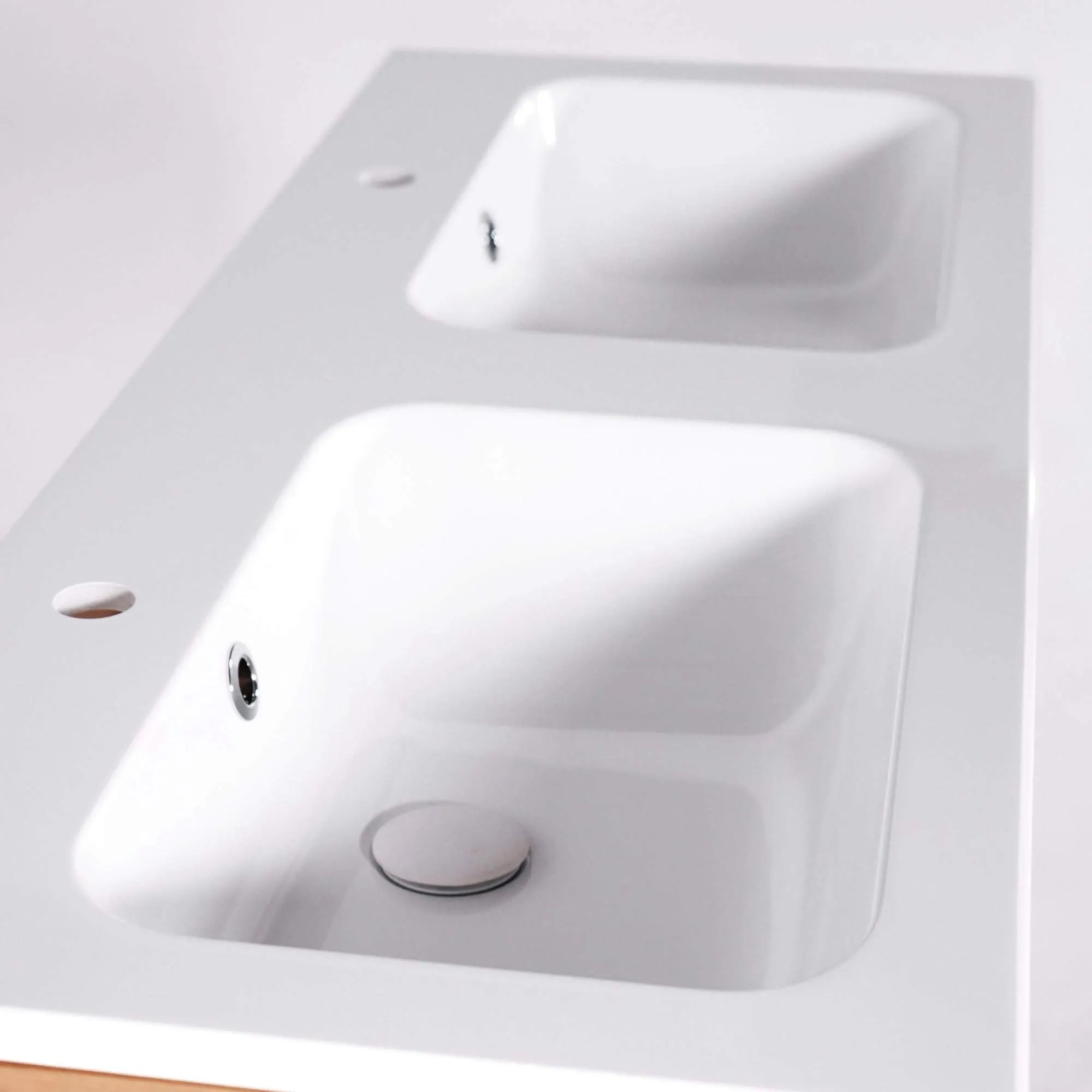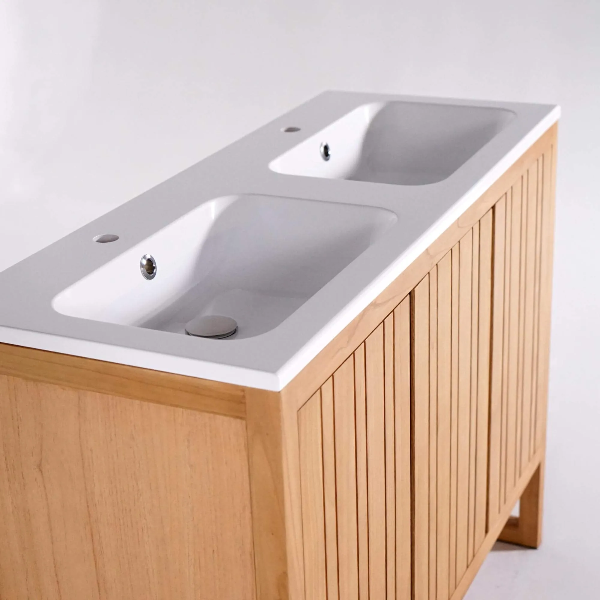 Le bois de mindi offre à ce meuble de salle de bain avec vasque encastrée une teinte claire et une texture subtilement nervurée, révélée par une finition soignée. Sa surface délicatement mate s’associe naturellement au plan à double vasque en résine minérale, traité pour résister aux usages quotidiens. Les bords légèrement adoucis, la surface lisse et le toucher soyeux de la double vasque encastrée créent un contraste visuel harmonieux avec le veinage du bois. Ce plan avec double vasque encastrée, large et confortable, facilite l’usage à deux sans encombrement et s’intègre avec précision dans la structure.