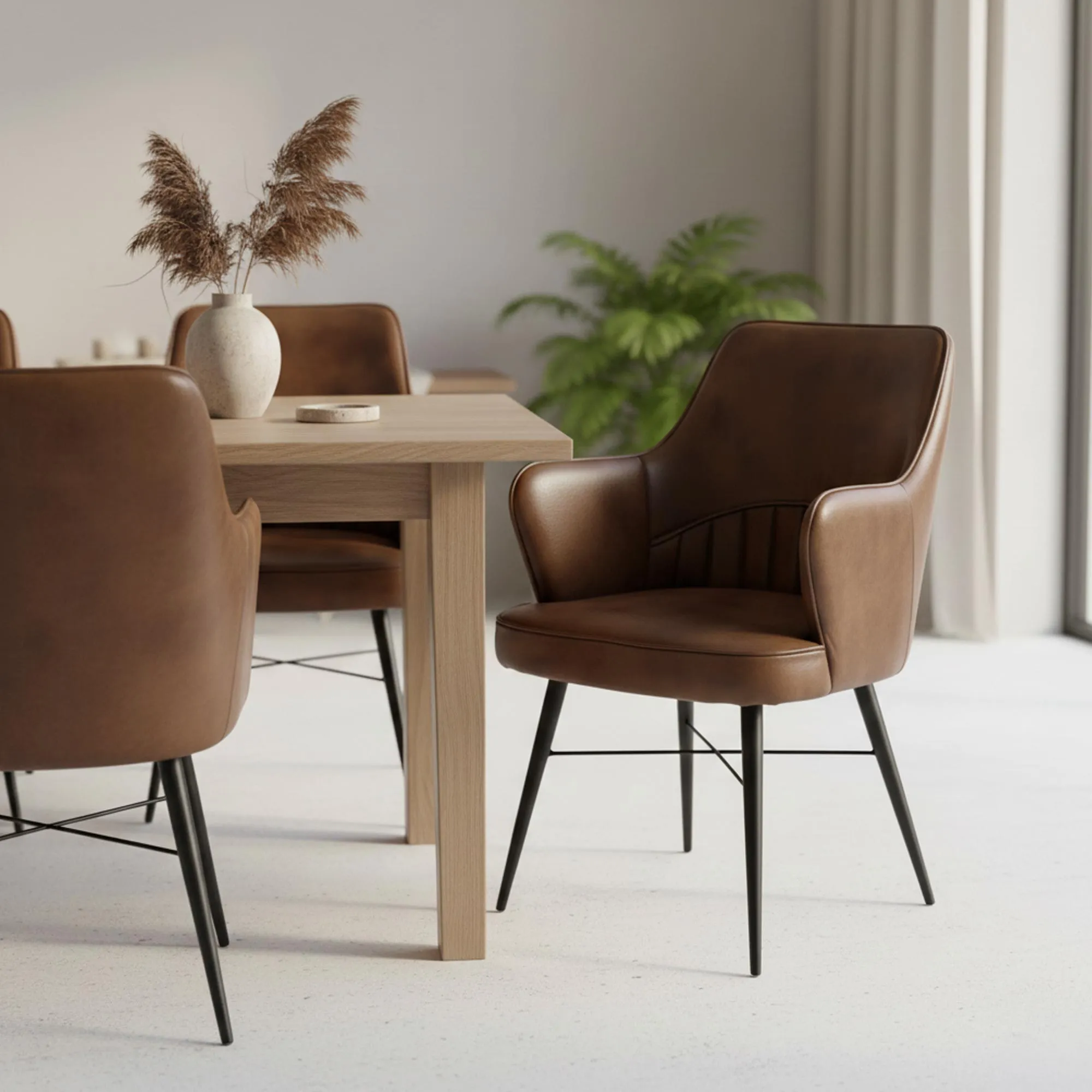 Nous avons imaginé cette chaise vintage en cuir avec accoudoirs comme un point d’équilibre entre caractère et confort. Associée à nos tables à manger en bois massif, elle compose un ensemble harmonieux où les matières naturelles dialoguent avec cohérence et authenticité.