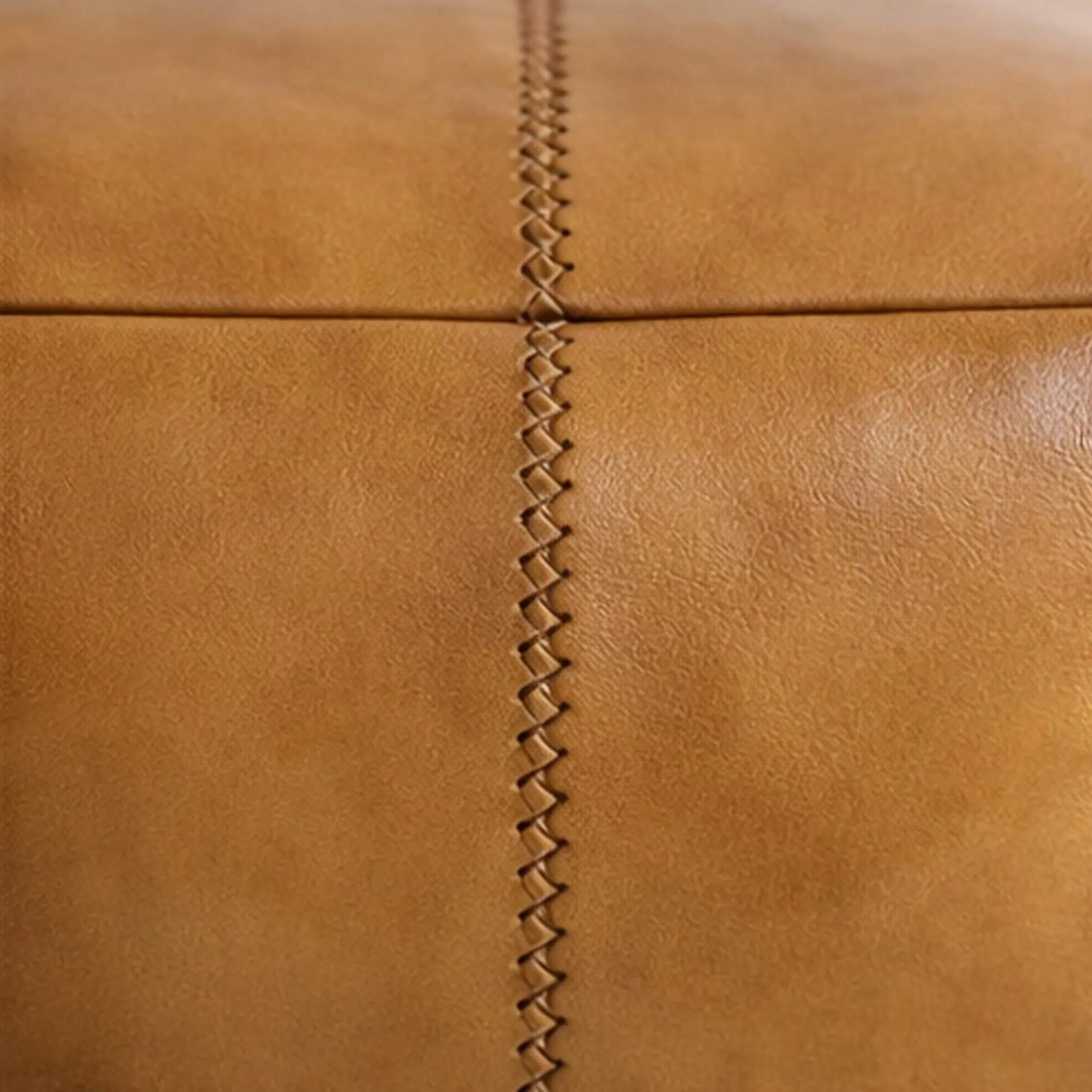 Pour réaliser ce pouf en cuir carré, nous avons choisi un cuir pleine fleur dont la main révèle un grain subtil, avec de légers reflets sous la lumière et cette patine naturelle qui s’adoucira au fil des années. Les peaux sont assemblées à la manière d’un travail de maroquinerie, avec des coutures croisées apparentes qui donnent du rythme à la surface. Cette finition était essentielle pour nous : elle apporte à ce pouf en cuir carré du relief et évite l’effet trop lisse que l’on retrouve sur certains poufs contemporains.