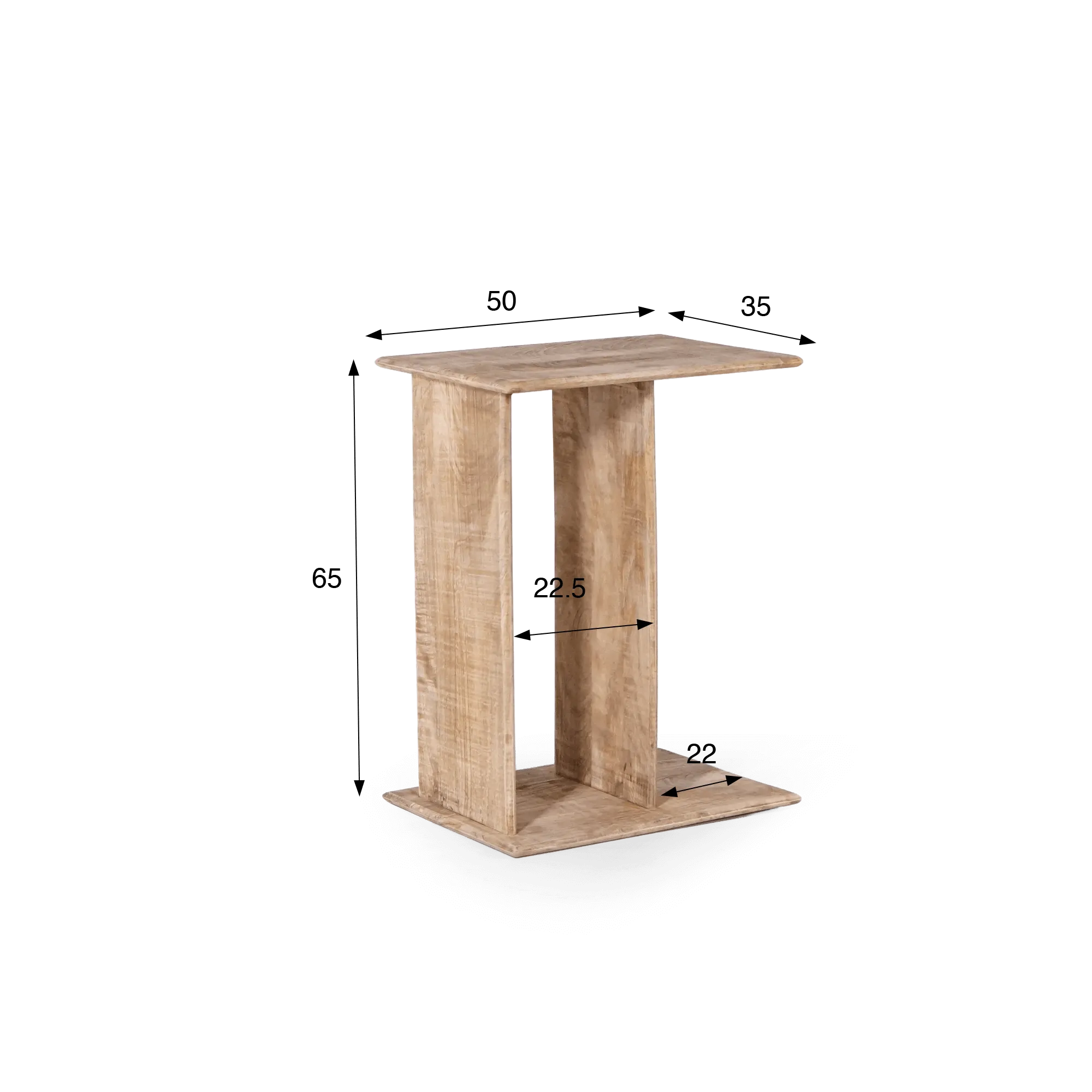 Nous voulions que ce bout de canapé en bois massif s’intègre sans effort près d’un canapé ou d’un fauteuil, sans s’imposer, tout en offrant une réelle surface d’usage. Son plateau de 50 × 35 cm accueille un livre, une tasse ou un objet décoratif, tandis que le plateau inférieur permet d’organiser quelques éléments supplémentaires verticalement comme des magazines. L’espacement de 22,5 cm entre les deux plans a été étudié pour conserver un geste fluide et éviter la sensation d’encombrement, même dans les salons les plus compacts.