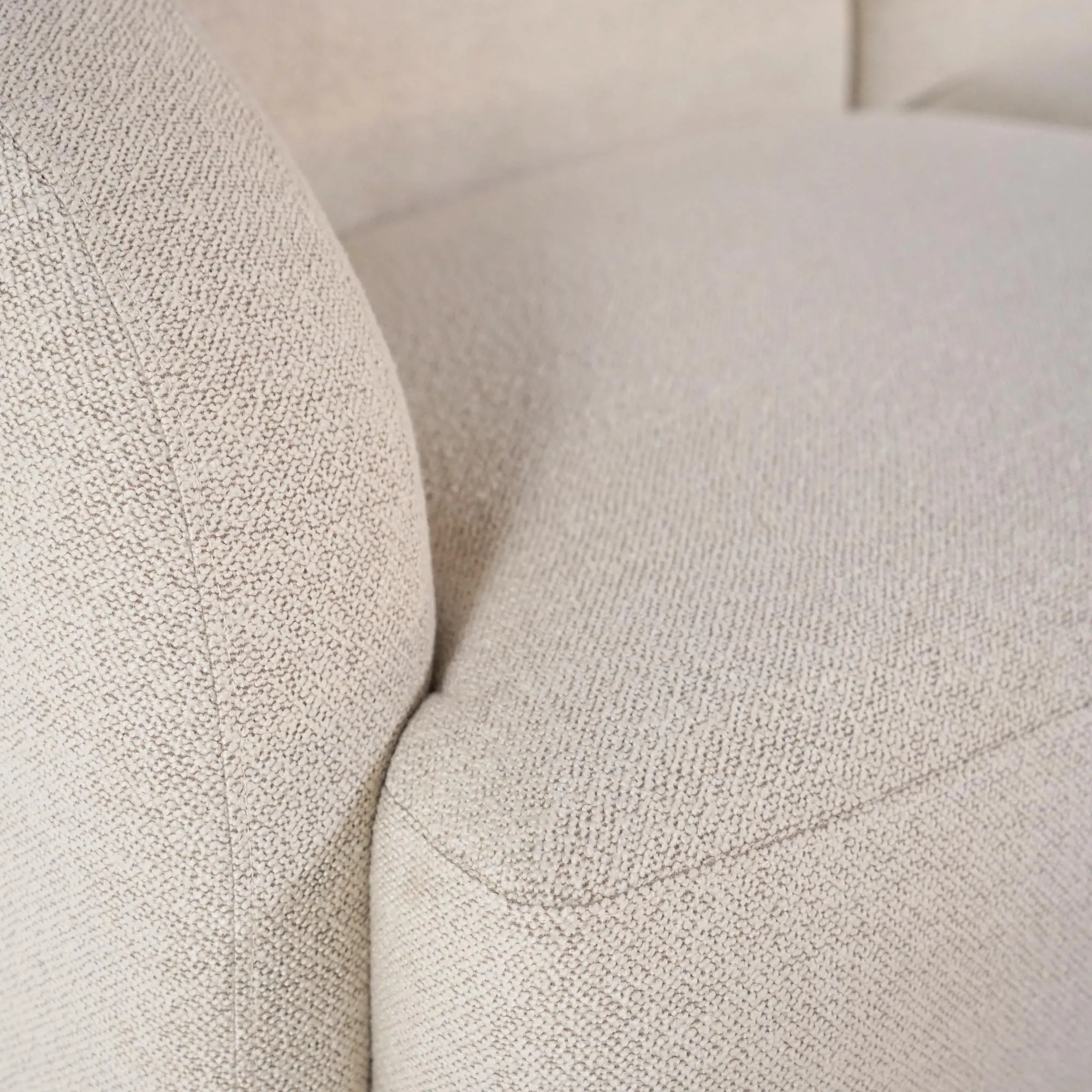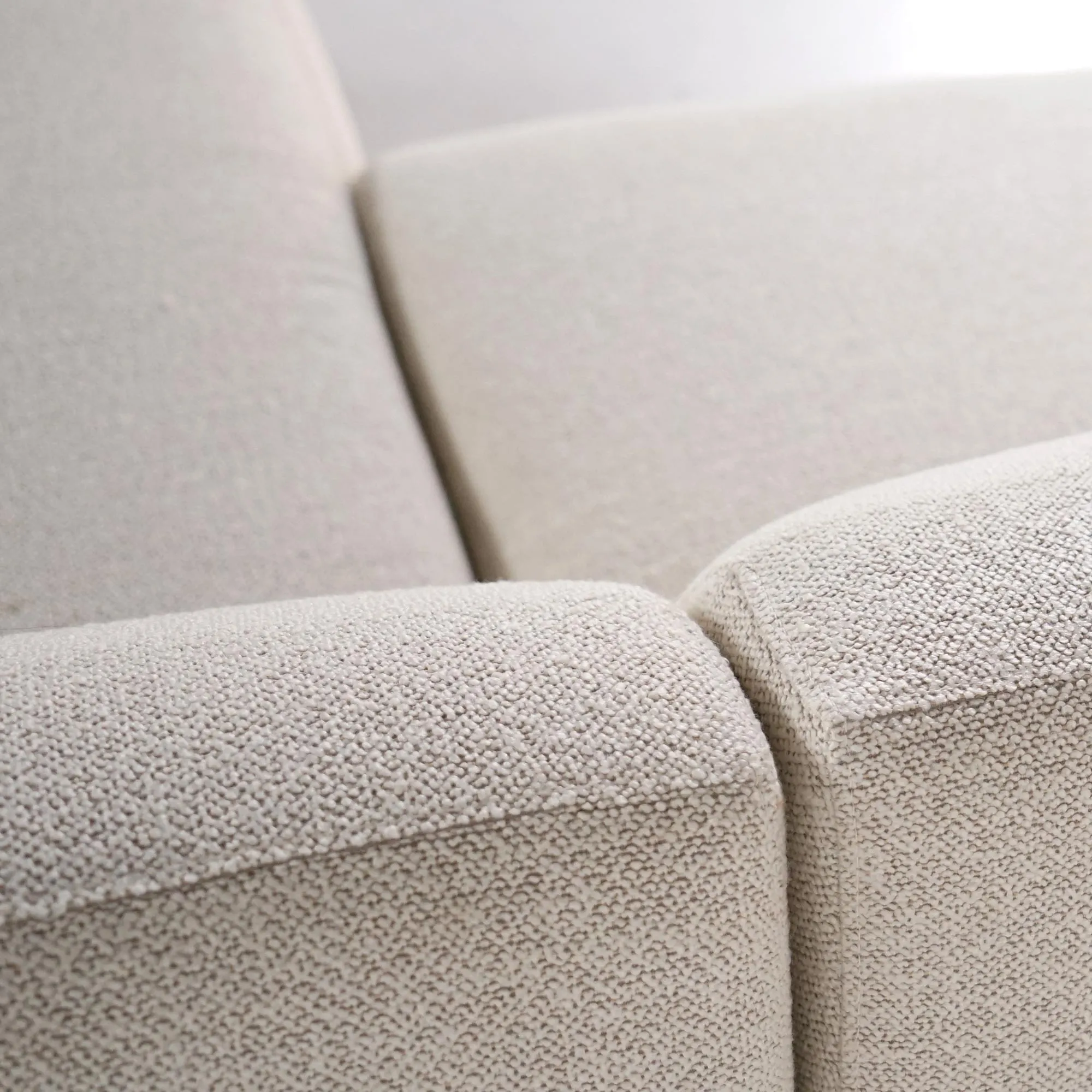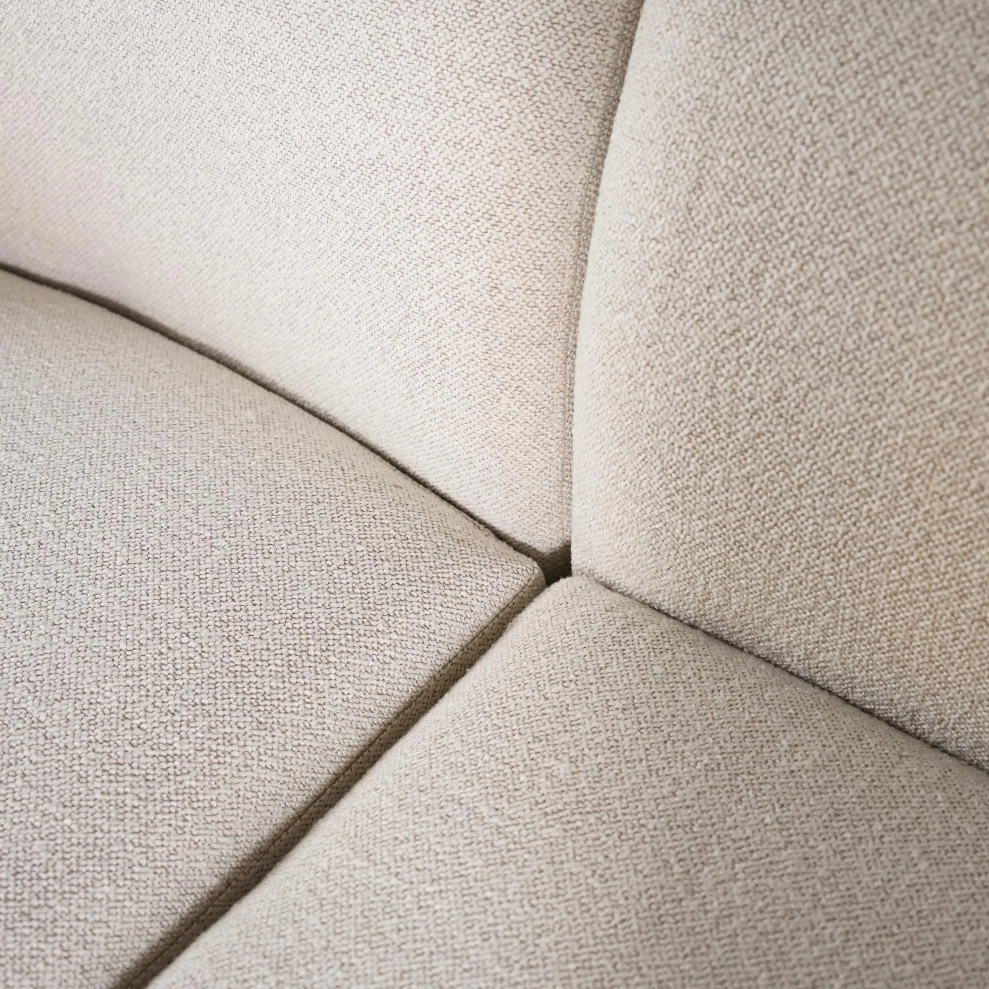Pour ce canapé d'angle 3 places avec méridienne droite, nous avons choisi un tissu bouclé certifié Oeko-Tex®, dont le toucher texturé met en valeur la forme enveloppante de l’assise. Ce revêtement, au tissage dense et résistant, allie confort au quotidien et durabilité. La structure interne marie mousse HR de haute résilience, ressorts ensachés et mousse PU multicouches pour offrir une assise à la fois souple et ergonomique, garantissant le même confort au fil des années. Les pieds discrets en plastique, presque invisibles, renforcent la légèreté visuelle de l’ensemble et permettent au canapé de s’intégrer aisément dans différents univers décoratifs.