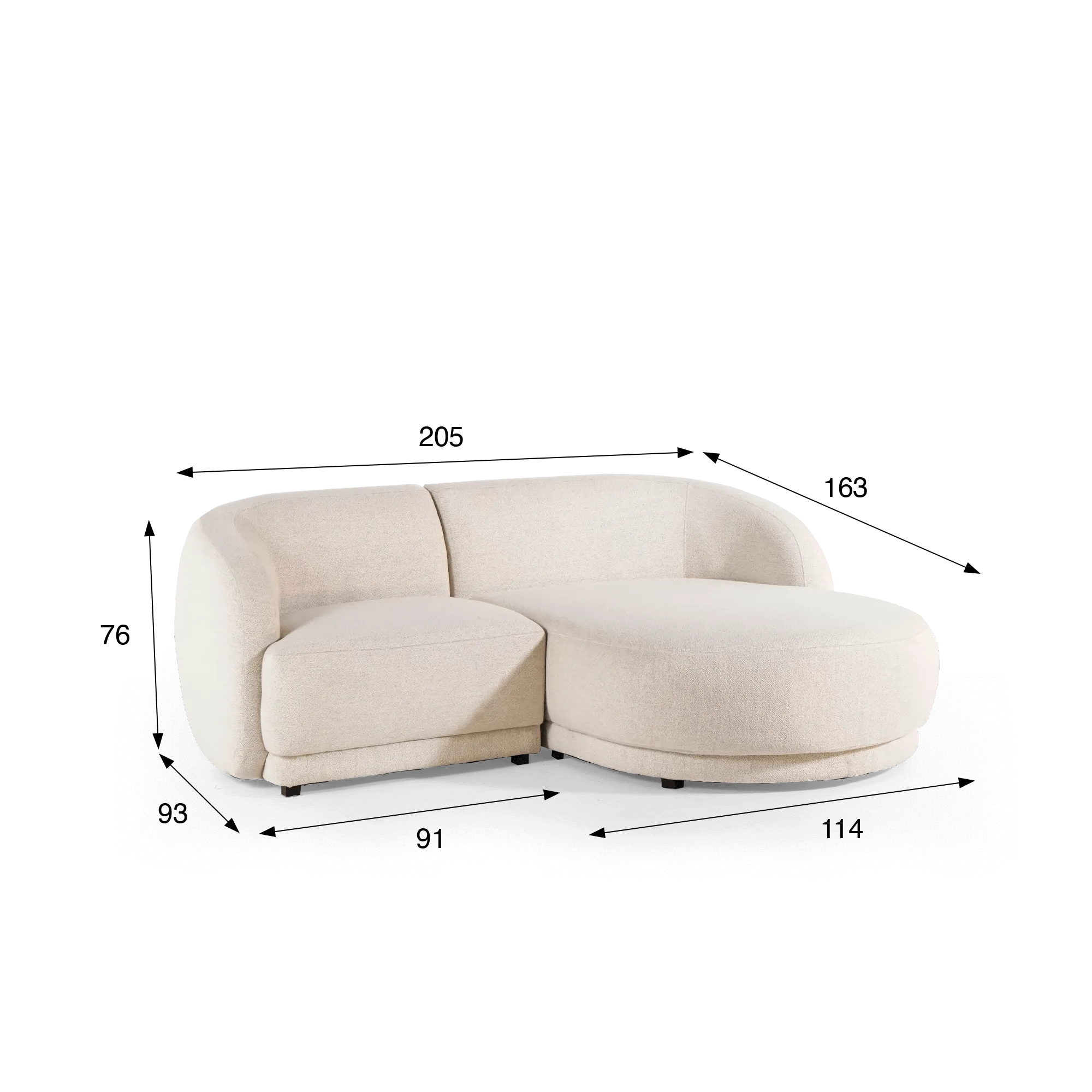 Conçu par nos designers dans la collection Elora, ce canapé d'angle 3 places avec méridienne droite conjugue lignes organiques et minimalisme raffiné. Sa silhouette douce et arrondie crée une invitation naturelle à la détente, tandis que ses proportions bien étudiées de 205 cm de largeur, 163 cm de profondeur et 76 cm de hauteur en font une pièce idéale pour structurer un salon moderne.