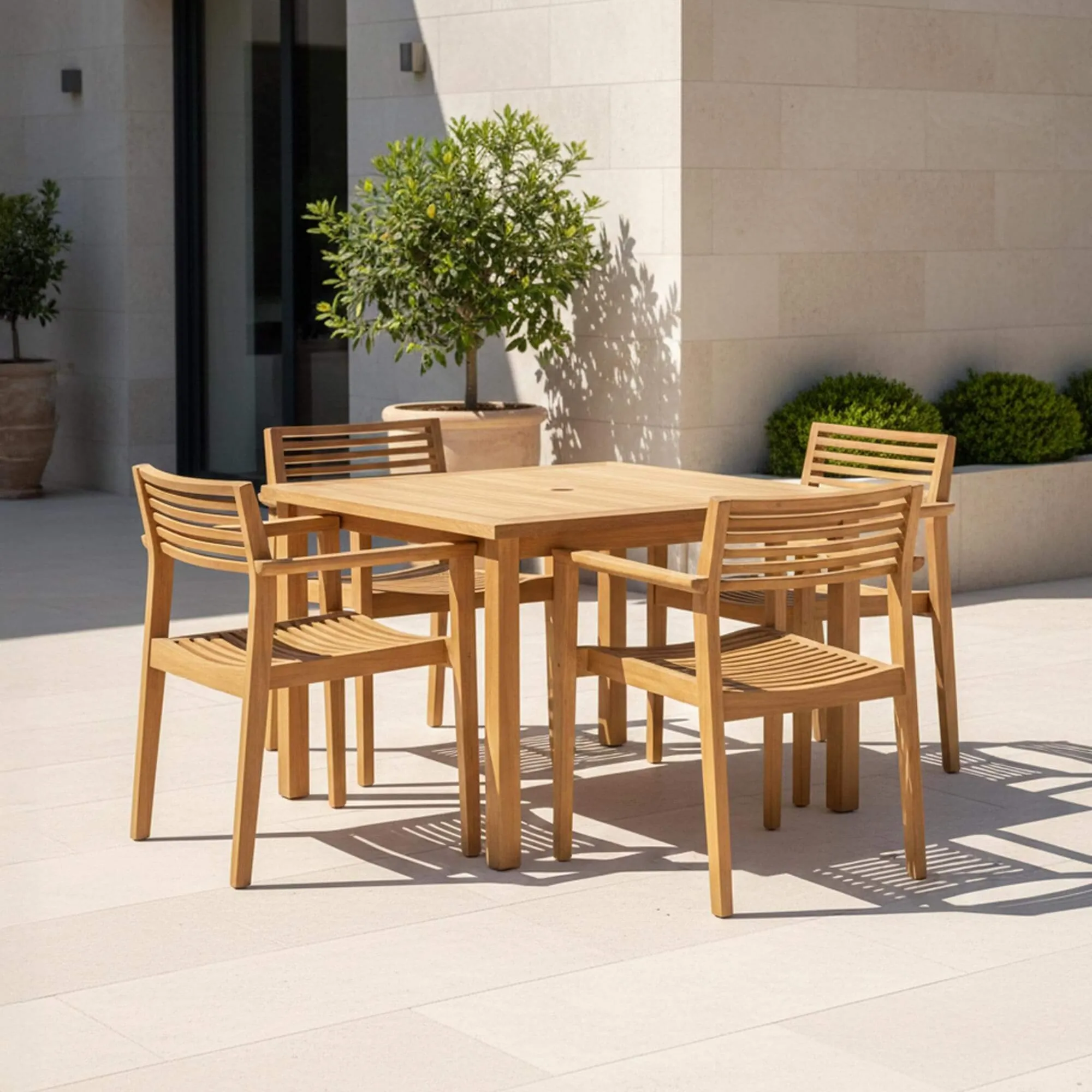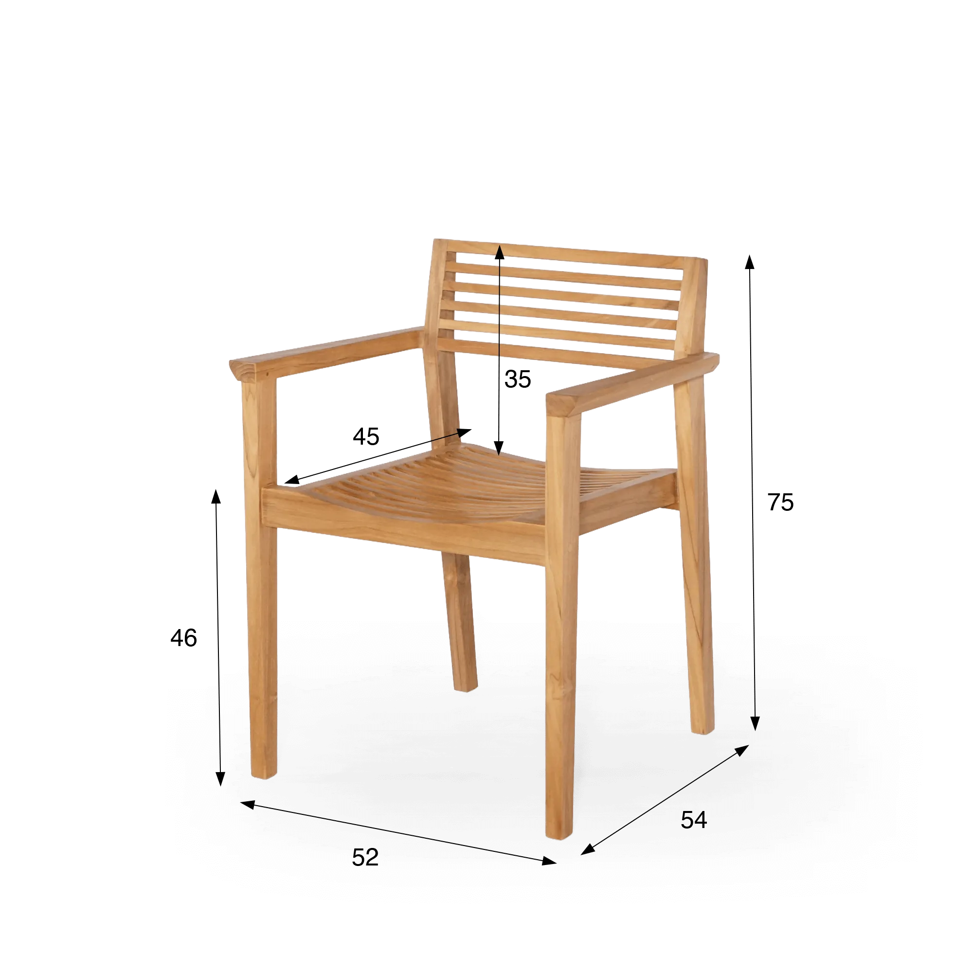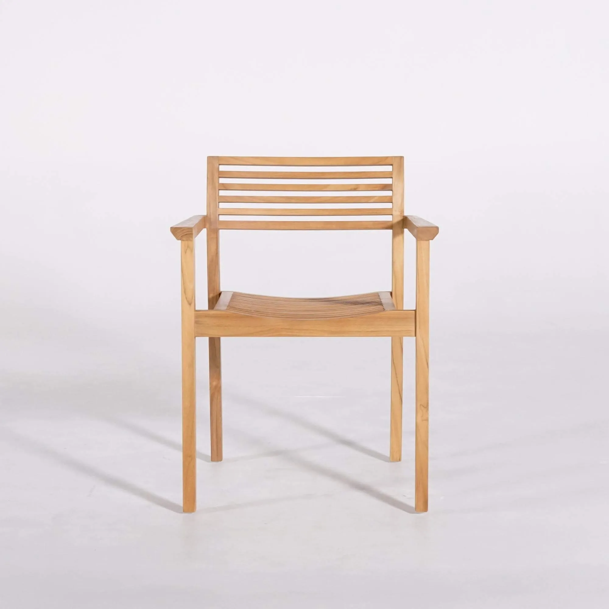 L’assise de la chaise de jardin en bois de teck Naito a été dessinée avec une légère courbure composée de lattes de teck finement travaillées. Cette forme épouse naturellement la position du corps et offre un confort appréciable lors des repas prolongés en extérieur. Le dossier, structuré par des lattes horizontales élégamment espacées, soutient le dos tout en conservant une impression de légèreté visuelle. Les accoudoirs viennent prolonger cette recherche de confort et permettent de s’installer à table avec aisance.