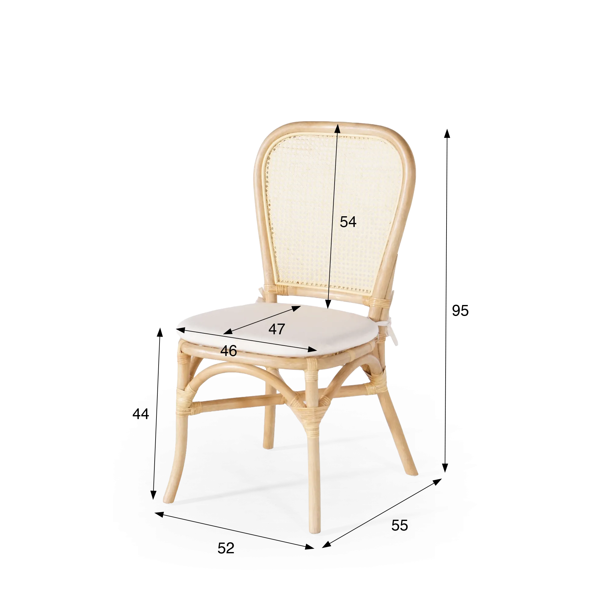 Avec ses dimensions harmonieuses d’environ 95 cm de hauteur, 52 cm de largeur et 55 cm de profondeur, la chaise en rotin naturel et coussin beige Louna trouve naturellement sa place autour d’une table de repas, dans un espace lumineux ou dans une ambiance plus intimiste. Déjà montée, elle est prête à accompagner immédiatement votre quotidien.