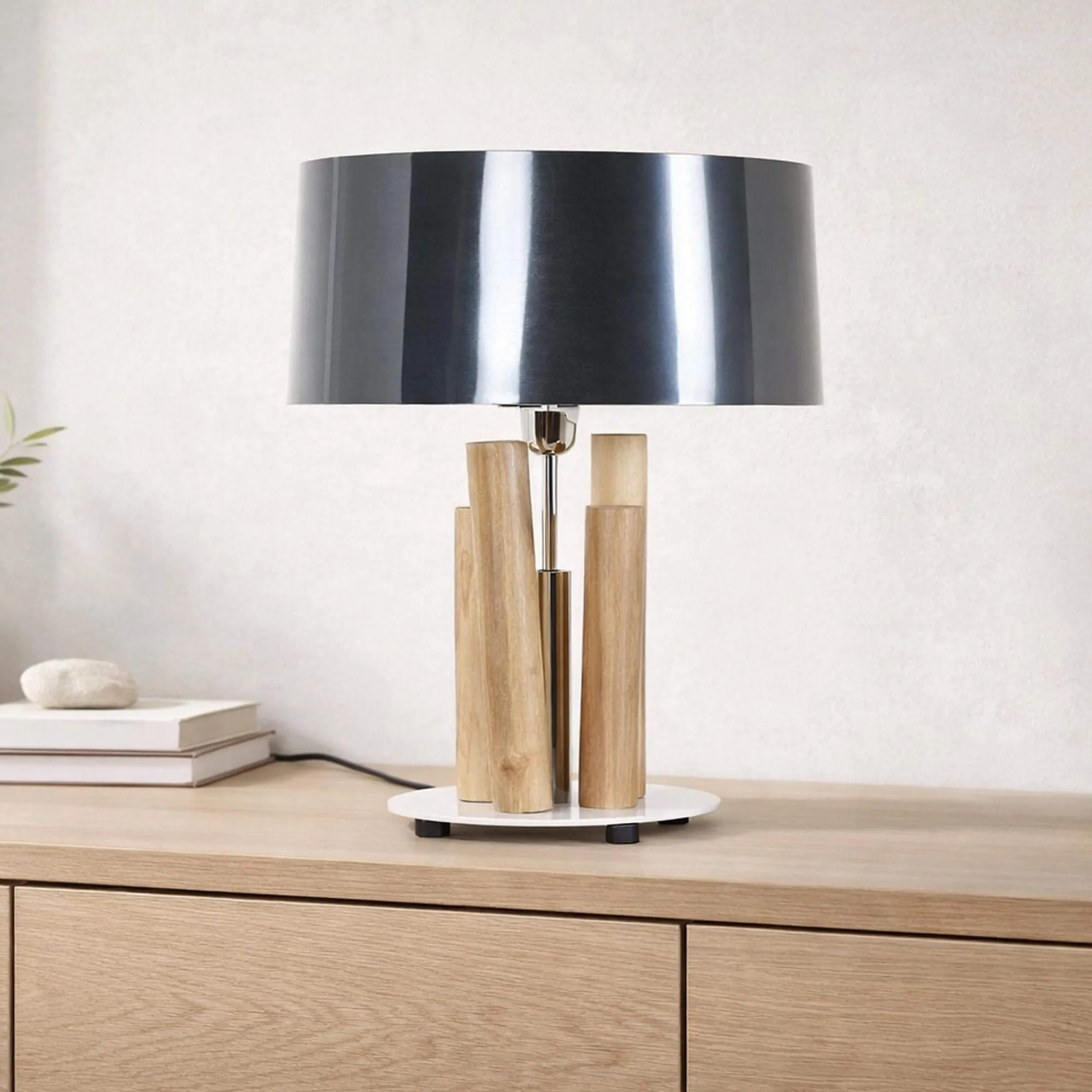 Au-dessus, l’abat-jour attire immédiatement le regard. Sa surface lisse capte la lumière et reflète subtilement l’environnement qui l’entoure. Ce contraste entre la chaleur du bois et l’éclat métallique apporte une dimension contemporaine au luminaire tout en conservant une sensation naturelle très agréable. La lumière diffusée par l’ampoule (non incluse) se répand avec douceur dans la pièce et crée une ambiance accueillante, idéale pour un salon, une console d’entrée ou un buffet.