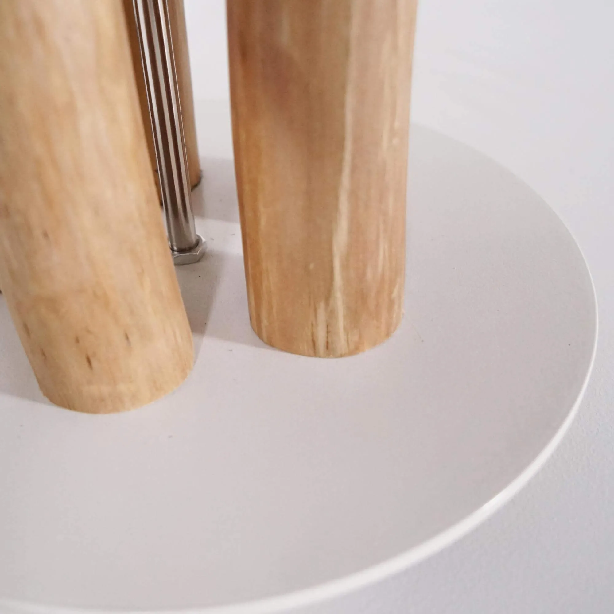 Le socle de la lampe de chevet en bois design Petrea repose sur une base circulaire stable qui accueille plusieurs cylindres de bois massif disposés verticalement autour de la tige centrale. Chaque pièce de bois révèle son veinage, ses nuances et ses petites irrégularités naturelles, que nous avons choisi de préserver pour conserver toute l’authenticité du matériau. Cette composition crée un relief visuel intéressant, presque architectural, dont nous sommes particulièrement fiers. Elle évoque une petite forêt de troncs stylisés qui soutient l’ensemble avec équilibre.