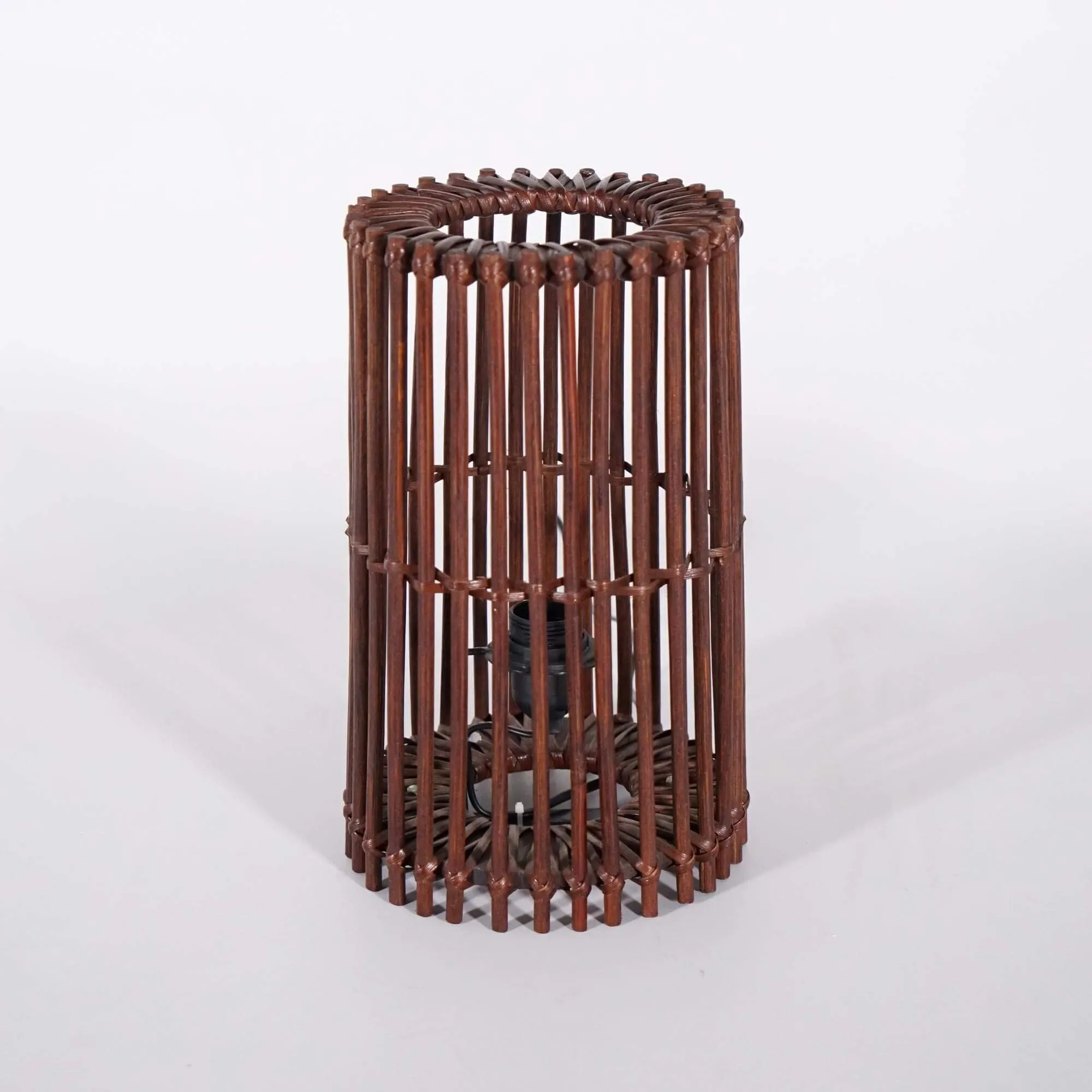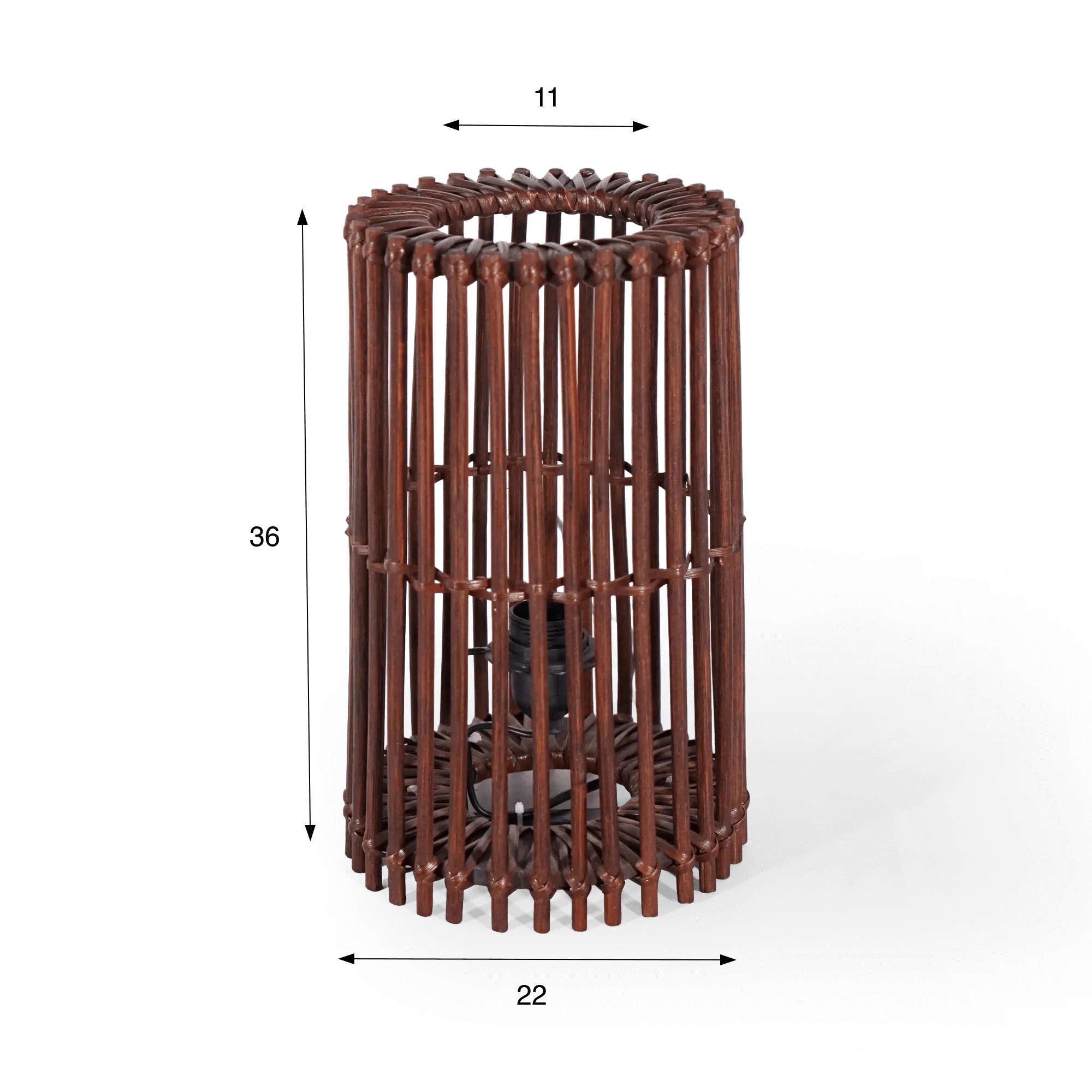 La structure cylindrique de la lampe de table en rotin naturel Rihu, d’environ 38 cm de hauteur pour 22 cm de diamètre, est composée de fines tiges de rotin soigneusement assemblées à la main. Ce travail minutieux crée une architecture légère et ajourée qui laisse apparaître l’ampoule (non incluse) en son centre. Lorsque la lampe est allumée, la lumière traverse les interstices du rotin et dessine autour d’elle un jeu d’ombres délicat, projeté sur le meuble ou le mur voisin. Nous aimons particulièrement cet effet lumineux qui transforme l’éclairage en véritable élément d’ambiance.