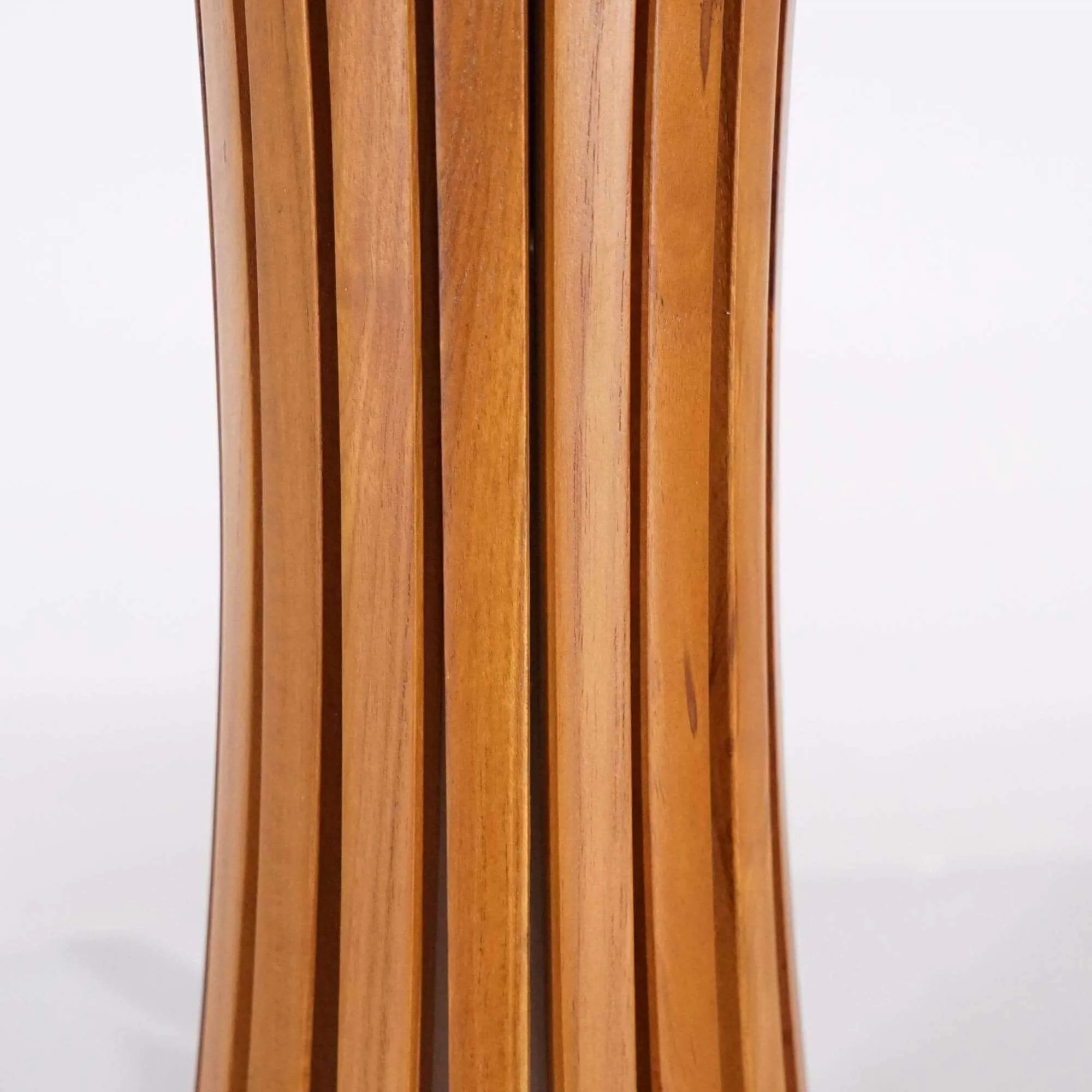 Avec la lampe sur pied en bois de teck Liven, nous avons imaginé une lampe capable d’apporter une présence lumineuse à la fois discrète et affirmée. Sa silhouette élancée de 120 cm attire le regard par l’équilibre de ses proportions et par la finesse du travail du bois. Chaque latte de teck a été soigneusement façonnée puis assemblée pour créer une structure ajourée qui diffuse la lumière de manière douce et enveloppante. Ce jeu de verticalité laisse apparaître une source lumineuse subtilement filtrée, produisant une atmosphère chaleureuse propice à la détente.