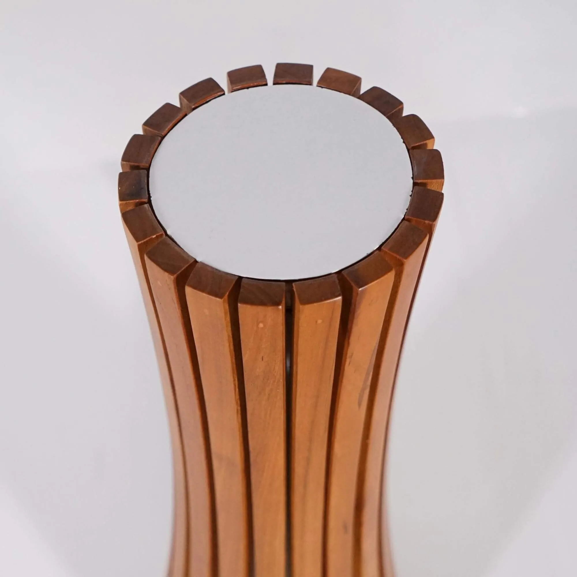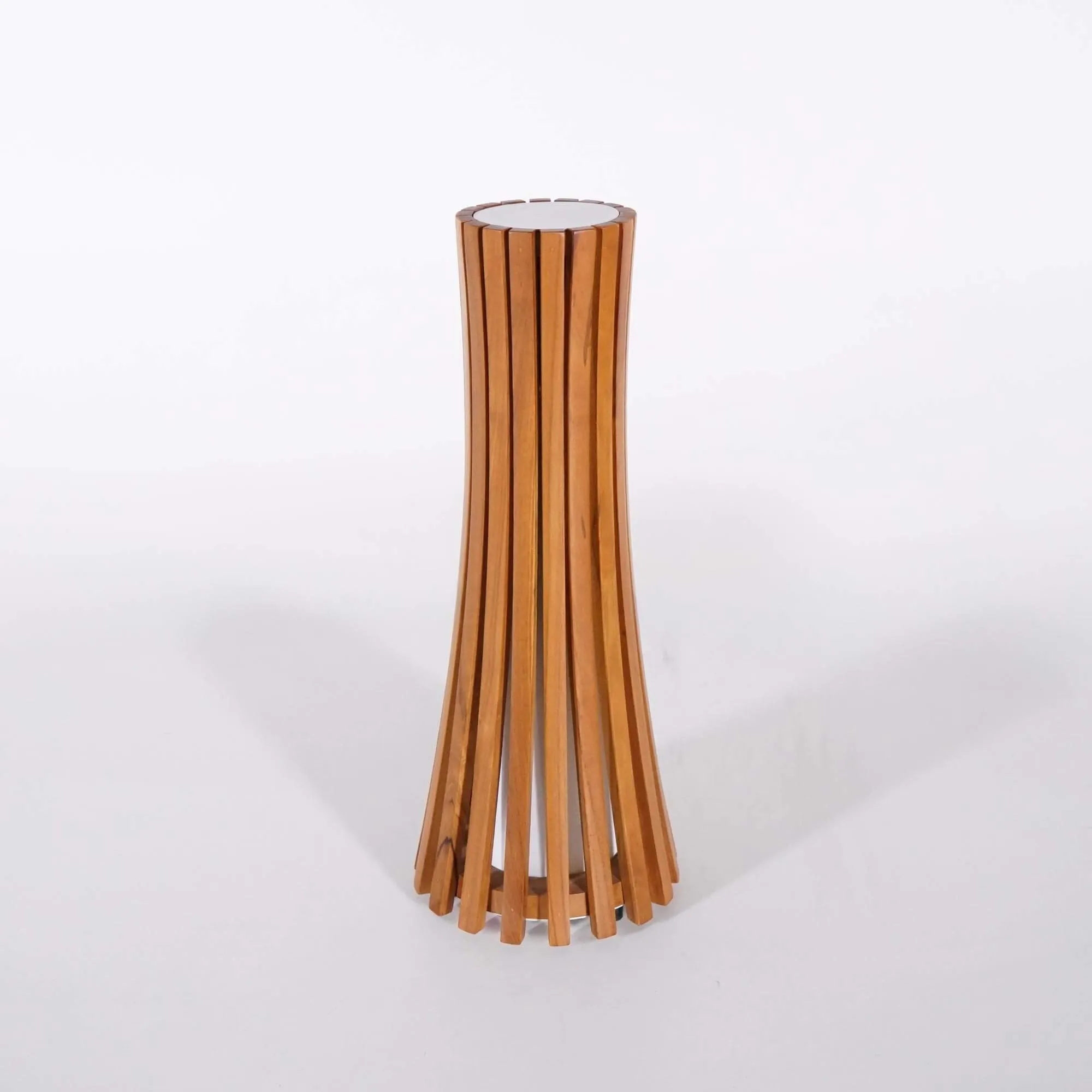 Lorsque nous avons imaginé la lampe d’extérieur en bois de teck Liven, notre objectif était de créer un luminaire capable d’apporter une présence chaleureuse et graphique dans un jardin ou sur une terrasse, tout en mettant en valeur la beauté naturelle du bois massif. Nous avons travaillé autour d’une silhouette élancée d’environ 52 cm de hauteur, dont les lignes verticales dessinent une forme subtilement resserrée en son centre. Cette construction donne à la lampe une allure dynamique et équilibrée, qui attire naturellement le regard tout en restant harmonieuse dans un environnement extérieur.