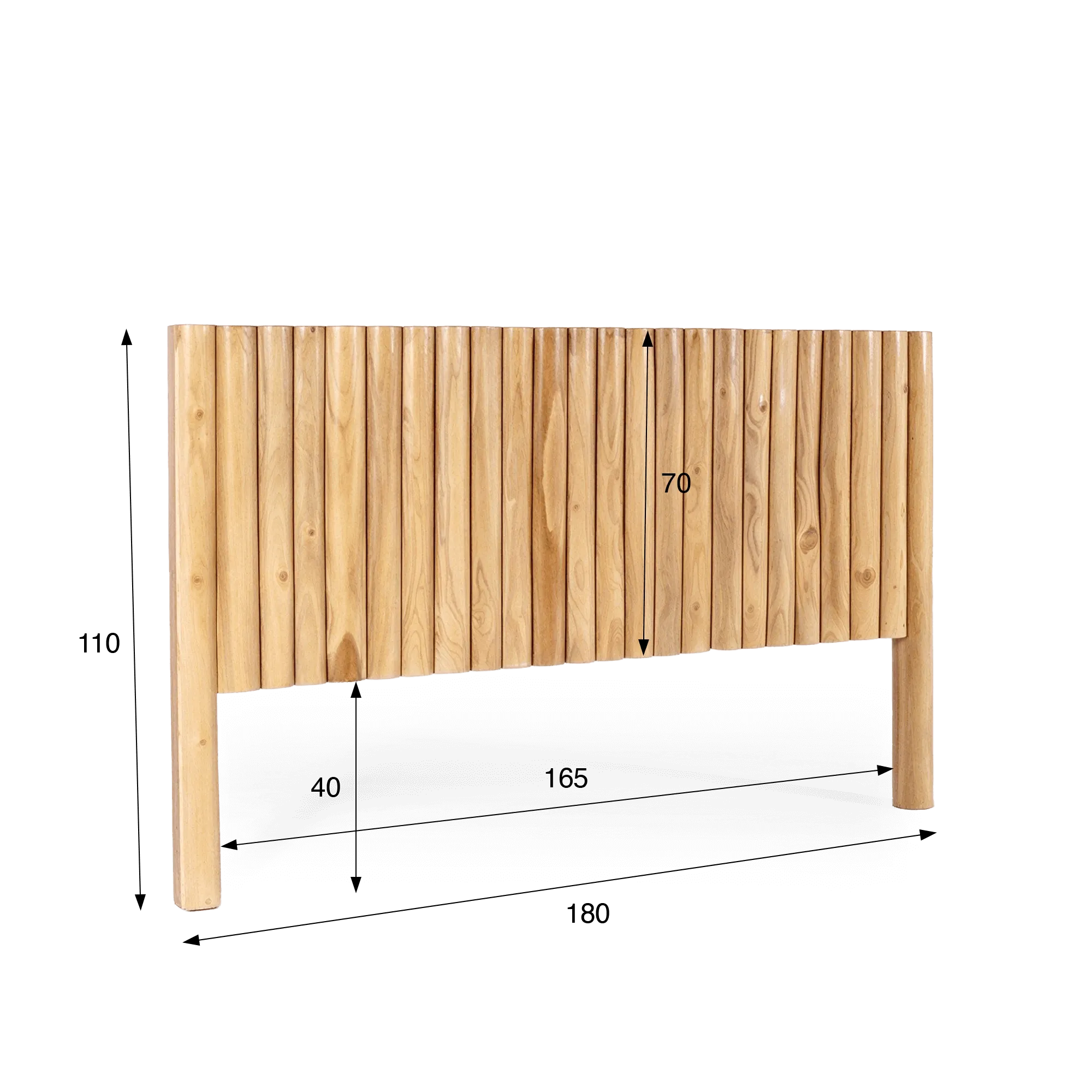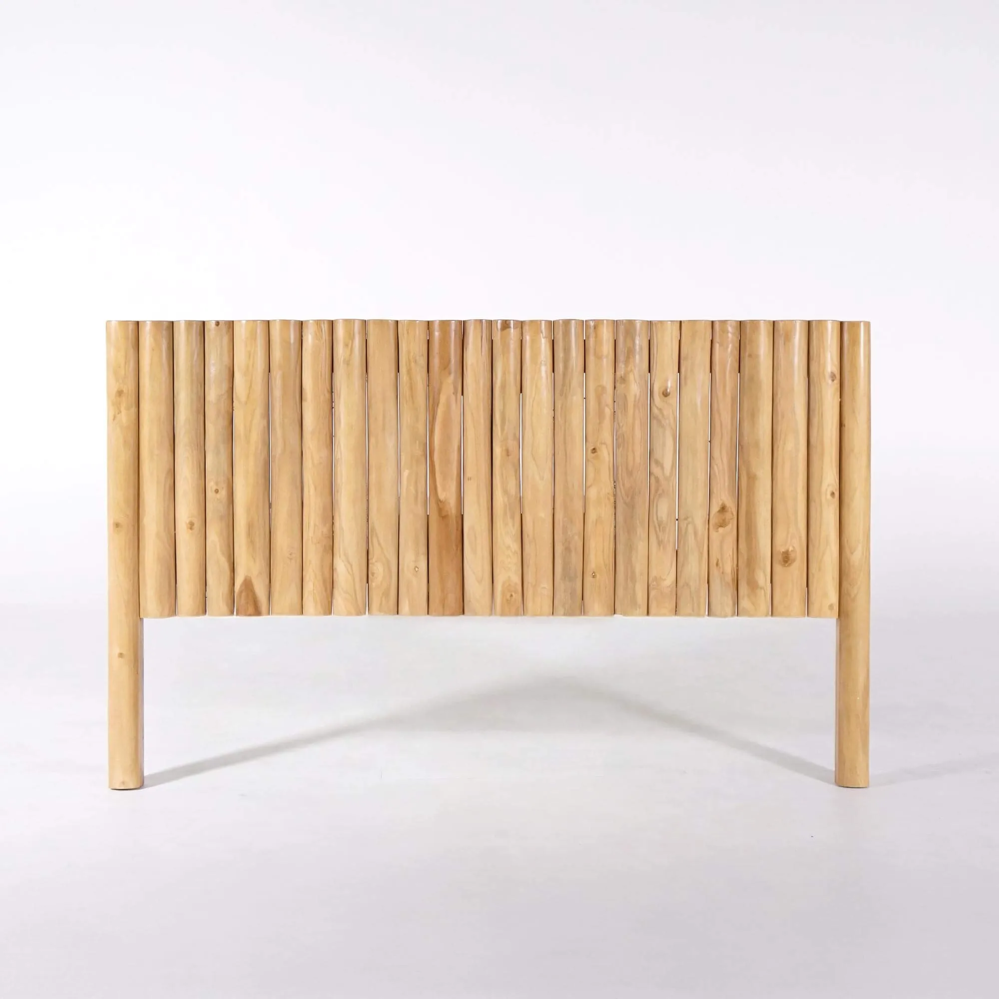 Nos designers ont imaginé la tête de lit en bois Naya comme un élément fort, capable d’habiller une chambre en un geste, tout en conservant une vraie douceur visuelle. Travaillée en bois massif de teck, cette tête de lit en bois offre un rythme vertical de sections arrondies qui capte la lumière de manière subtile et met en valeur les nuances chaudes de cette essence. Ce jeu de volumes donne de la présence au lit sans lourdeur, et instaure une atmosphère naturelle, apaisée et contemporaine.