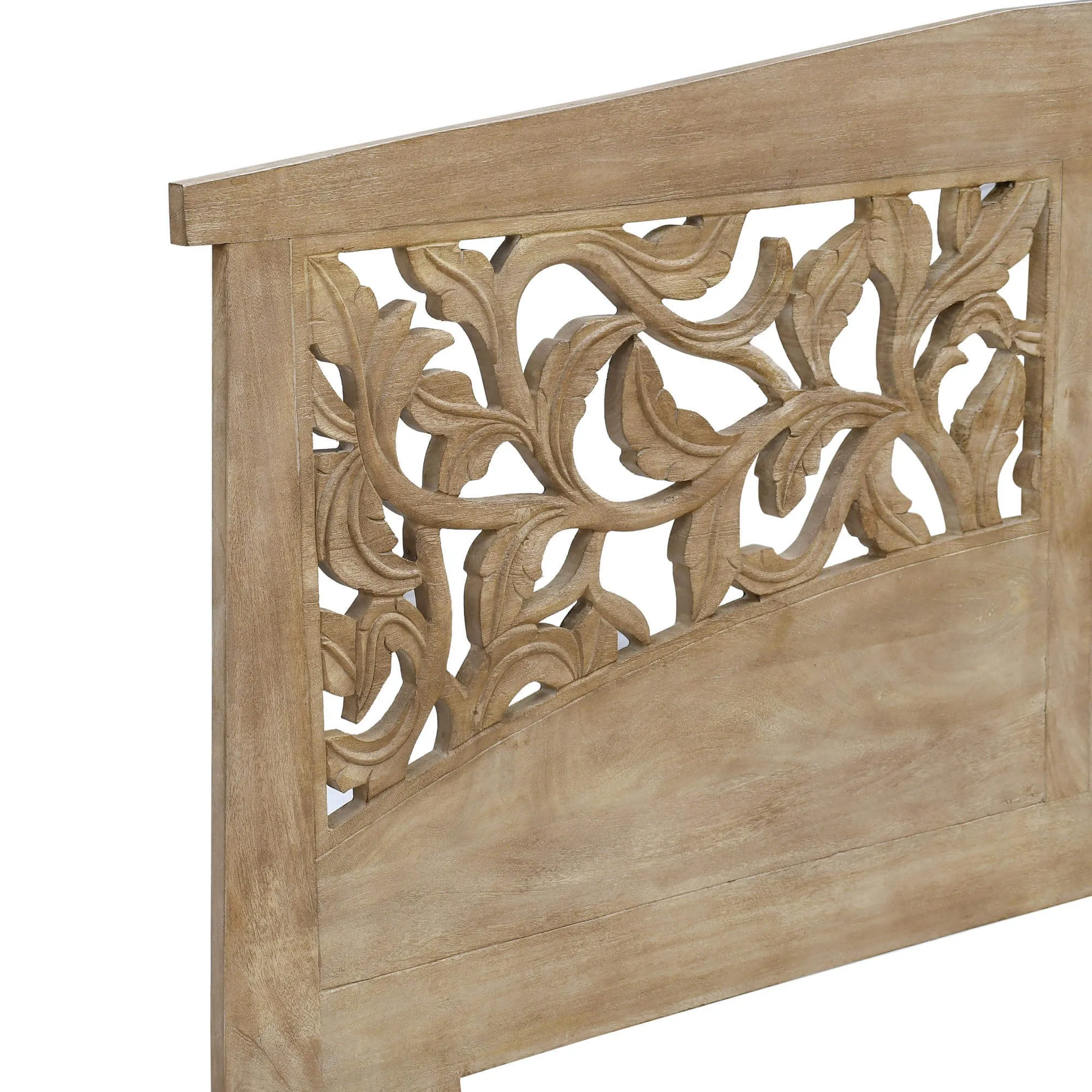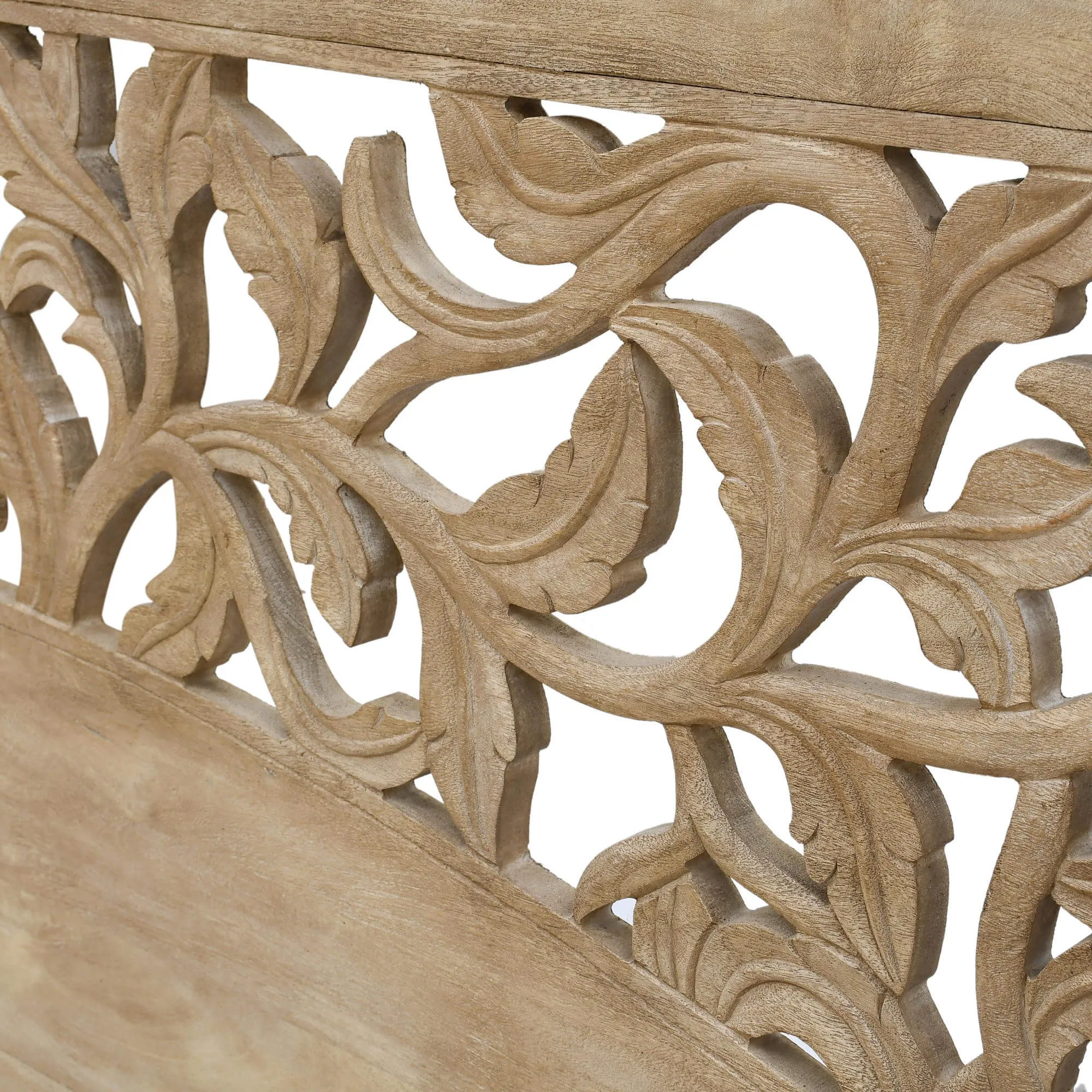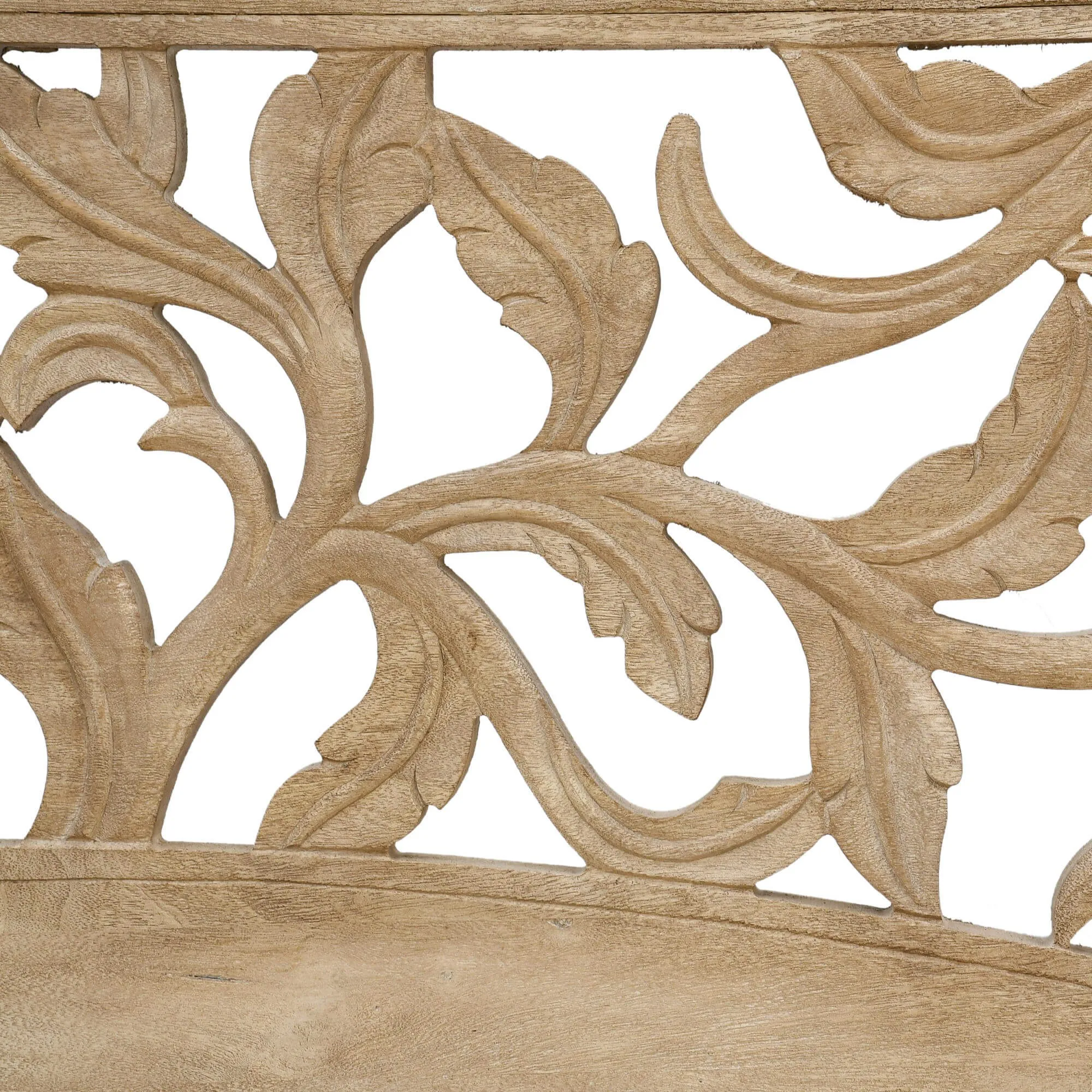 Fabriquée en manguier, la tête de lit en bois massif sculpté Galea révèle un veinage naturellement nuancé qui confère à chaque pièce une identité singulière. Nous avons particulièrement veillé à préserver la richesse de la matière afin que le toucher reste authentique et que la finition mette en valeur la profondeur du relief. Le travail de sculpture à la main souligne la précision du geste artisanal et témoigne du soin apporté à chaque détail, depuis la courbe du motif jusqu’à l’équilibre des proportions.