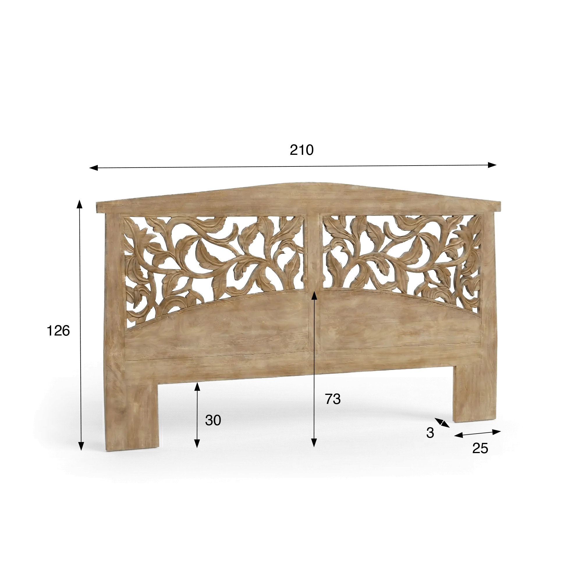 La largeur généreuse de cette tête de lit en bois massif sculpté permet d’encadrer confortablement un lit double, tandis que la hauteur étudiée offre un appui agréable pour prolonger les moments de lecture ou de repos. Déjà montée, elle s’intègre facilement dans la chambre à coucher et transforme instantanément l’atmosphère en apportant une présence naturelle, à la fois décorative et fonctionnelle. Nous avons souhaité créer un élément capable de s’harmoniser avec des univers variés, du décor épuré aux ambiances plus enveloppantes.