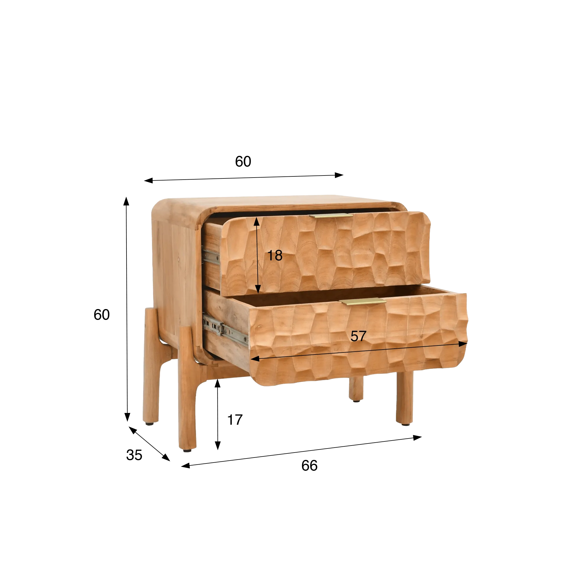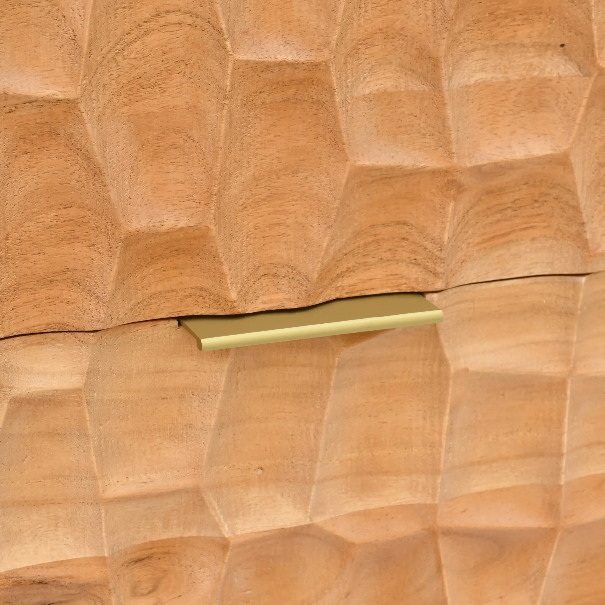 Fabriquée en acacia, cette table de chevet moderne en bois massif révèle un veinage naturellement nuancé qui apporte profondeur et authenticité à la matière. Nous avons choisi cette essence pour sa résistance et pour la richesse de ses variations de teinte, qui évoluent subtilement selon la lumière ambiante. Les façades de tiroirs ont été façonnées avec un travail en relief artisanal, dont la texture délicatement irrégulière capte la lumière et souligne le caractère vivant du bois. Ce jeu de surface confère au meuble une dimension sensible, presque tactile, dont nous sommes particulièrement fiers.