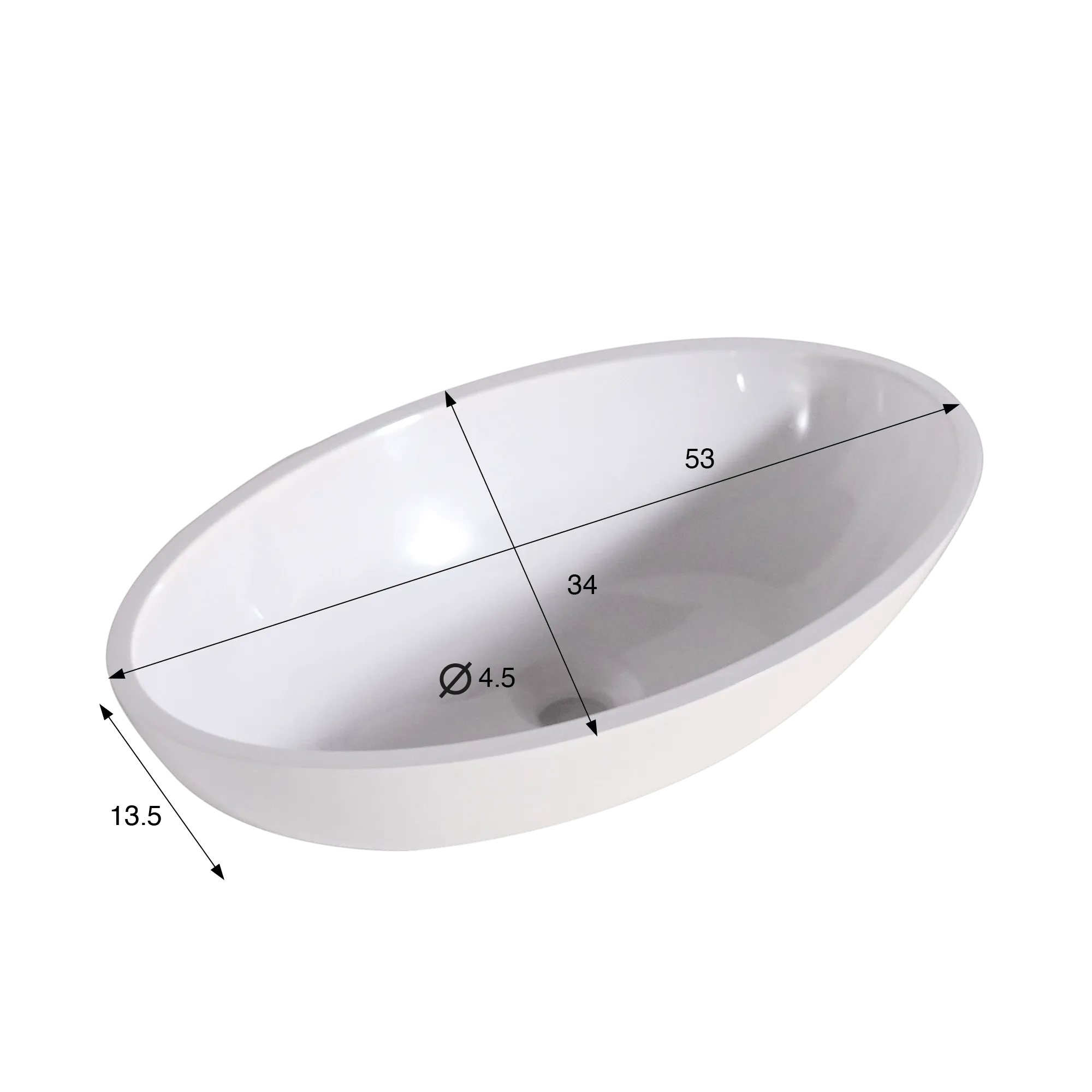Sa silhouette ovale, aux proportions généreuses, invite au geste fluide. Avec une longueur d’environ 53 cm pour une largeur de 34 cm, cette vasque à poser en céramique ovale, blanc brillant, offre une surface confortable, tandis que sa hauteur de 13,5 cm assure une prise en main agréable au quotidien. Le bassin intérieur, subtilement creusé, accompagne l’écoulement de l’eau vers une bonde centrale de 4,5 cm de diamètre, pensée pour un usage simple et efficace.