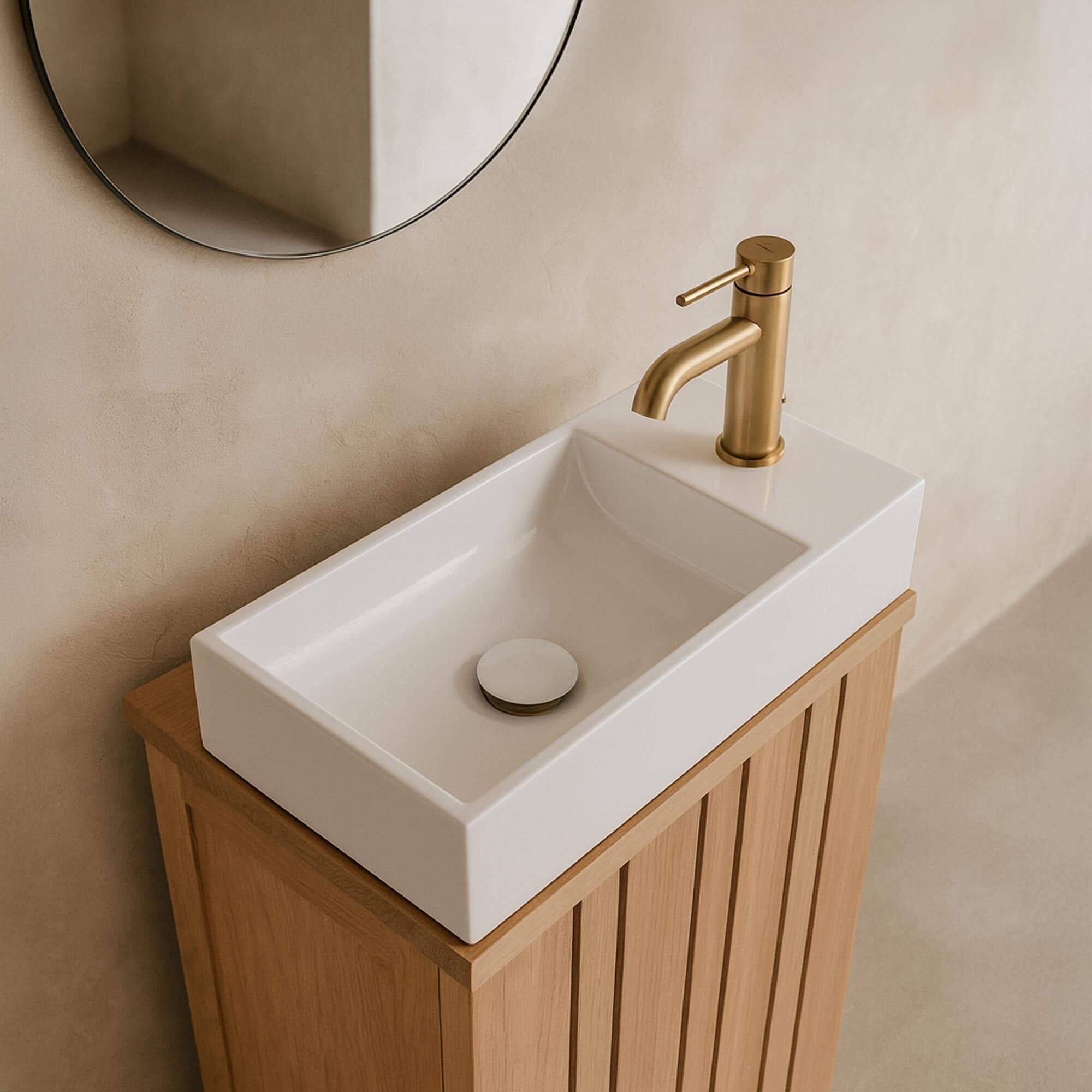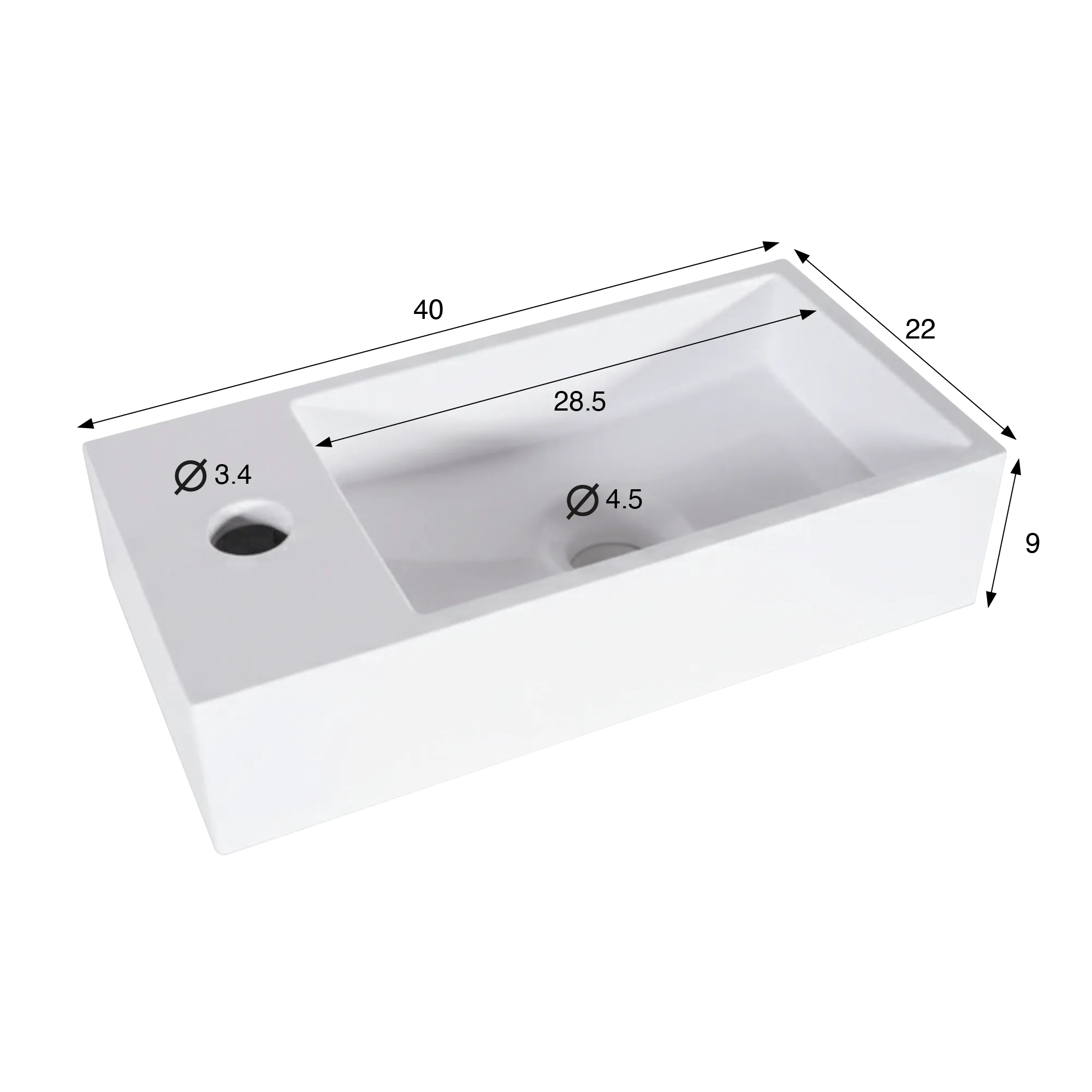 Avec ses dimensions contenues, la vasque en céramique à poser, blanc brillant, Klepsy s’adresse aussi bien aux salles de bain compactes qu’en guise de lave-mains. Sa largeur de 40 cm et sa profondeur de 22 cm permettent une intégration fluide sur un meuble sous vasque ou un plan épuré, sans compromis sur l’ergonomie. Le bassin intérieur, pensé pour un usage confortable, offre une longueur utile d’environ 28,5 cm et une profondeur agréable, tandis que la hauteur totale de 9 cm assure une présence visuelle affirmée sans excès. L’orifice pour robinetterie, discrètement intégré, participe à la lisibilité de l’ensemble et simplifie l’installation.