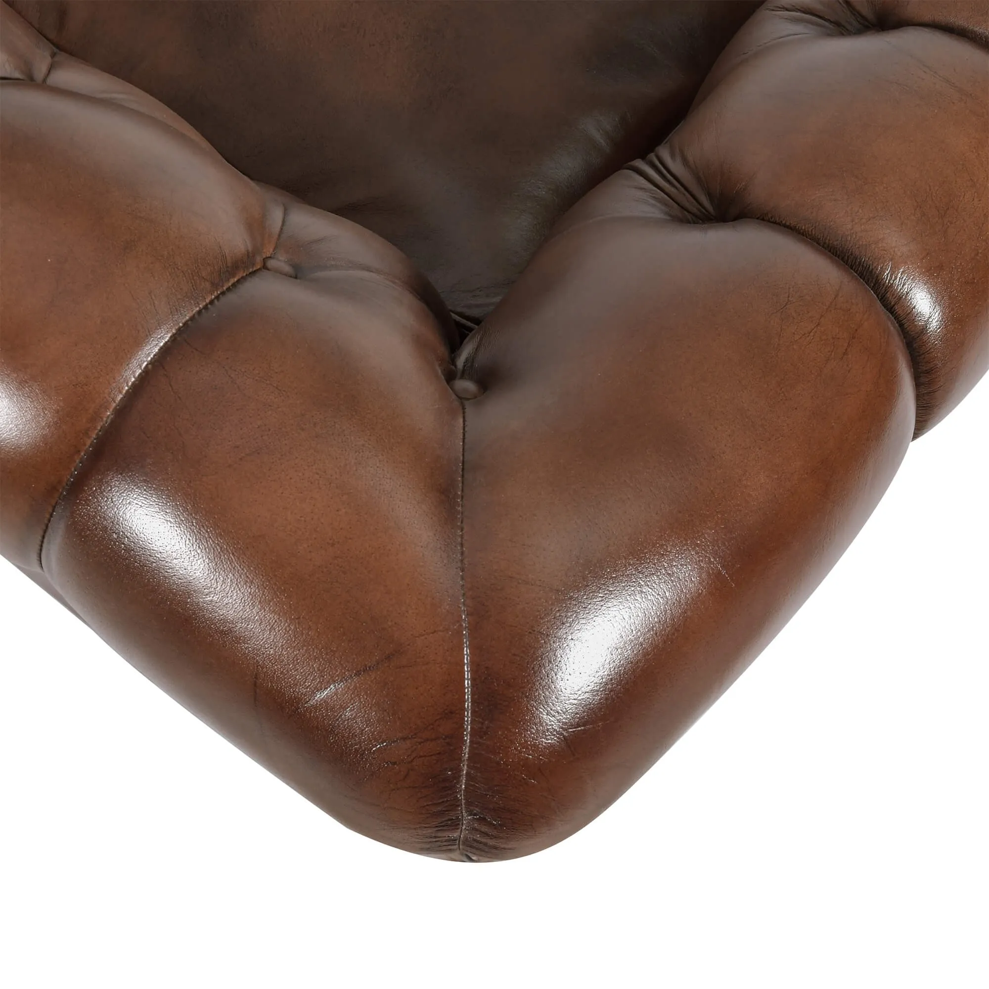 Le travail de capitonnage, réalisé à la main, dessine un relief généreux sur le dossier et les accoudoirs enveloppants. Les boutons délicatement intégrés rythment la surface et soulignent le savoir-faire artisanal que nous avons souhaité mettre en avant dans cette collection Harold. Les clous décoratifs, posés un à un, viennent structurer les lignes de ce fauteuil Chesterfield en cuir véritable et renforcer son caractère affirmé.