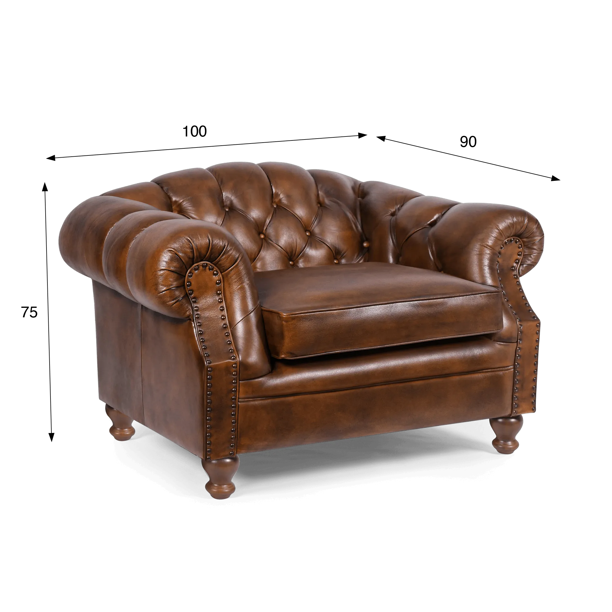 Pensé pour offrir un confort accueillant, le fauteuil Chesterfield en cuir véritable Harold propose une assise profonde d’environ 100 cm de largeur pour 90 cm de profondeur, idéale pour s’y installer longuement. Le coussin d’assise, épais et moelleux, repose sur une structure stable qui assure un bon maintien. La hauteur totale avoisine les 75 cm, offrant un équilibre agréable entre maintien du dos et détente.