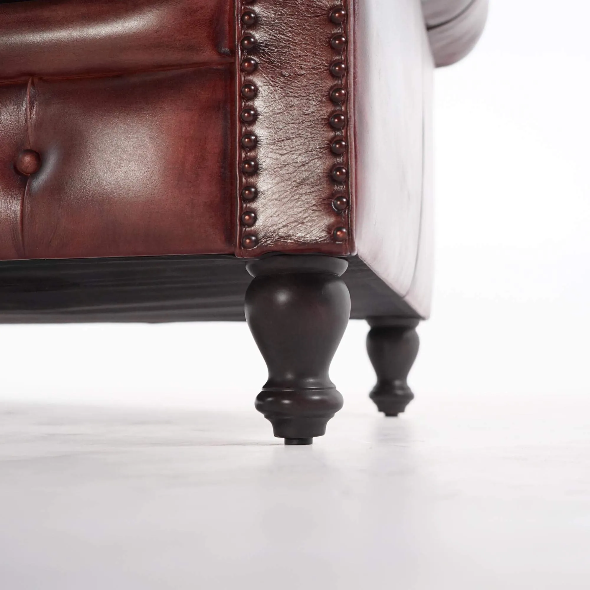 La structure de notre canapé Chesterfield en cuir véritable bordeaux 3 places Edward repose sur un bois massif de manguier robuste, choisi pour sa durabilité et sa stabilité. Les pieds en bois, à fixer simplement, assurent une bonne assise au canapé tout en allégeant visuellement l’ensemble grâce à leur ligne légèrement galbée. Les clous tapissiers, discrets mais présents, viennent souligner les contours avec précision.
