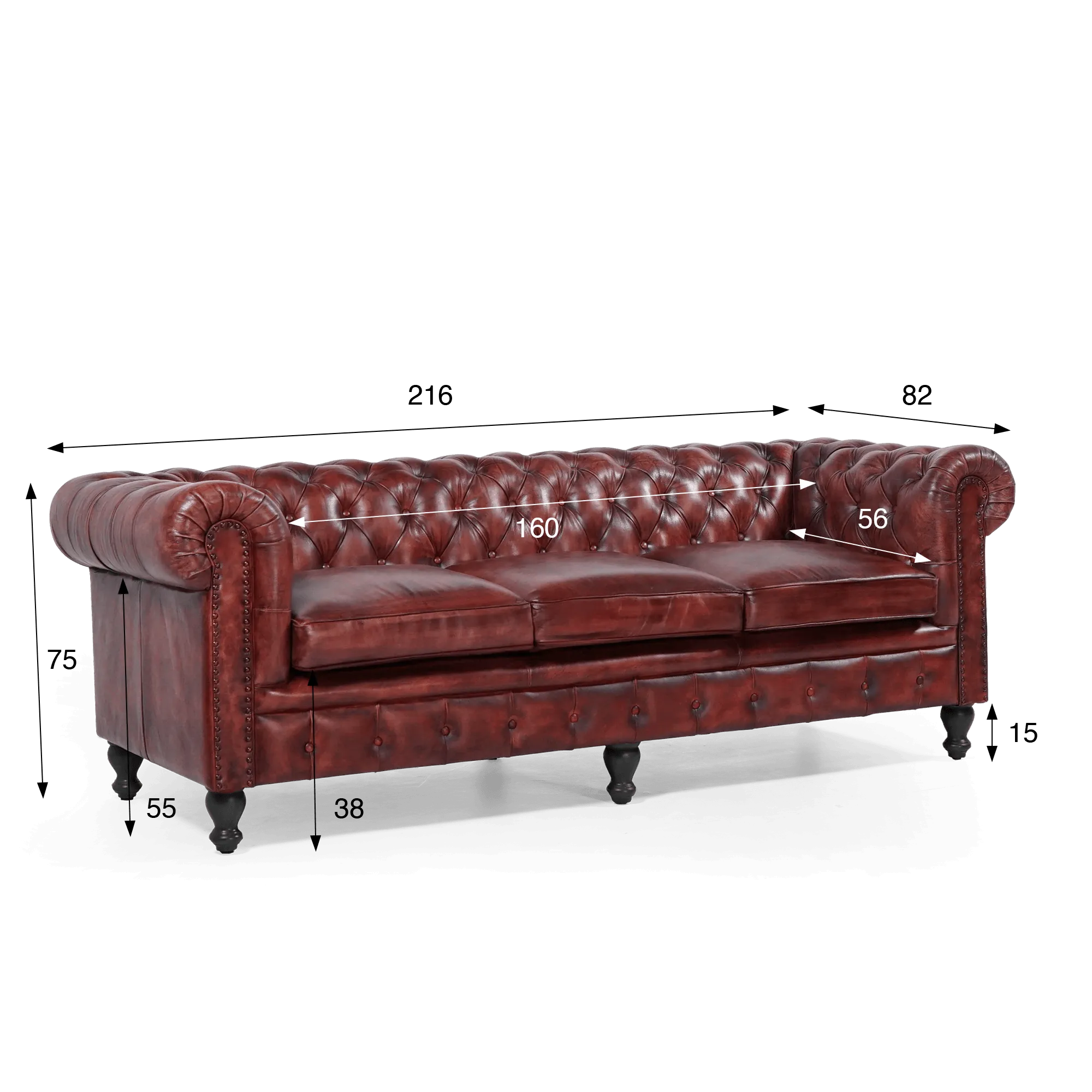 Sa longueur d’assise d’environ 160 cm permet d’accueillir trois personnes avec aisance, tandis que la profondeur de 56 cm offre un maintien agréable, propice à la détente sans compromettre le soutien. Le dossier capitonné de ce canapé Chesterfield en cuir véritable bordeaux 3 places, légèrement enveloppant, prolonge naturellement la ligne des accoudoirs roulés et crée une silhouette continue, immédiatement reconnaissable.