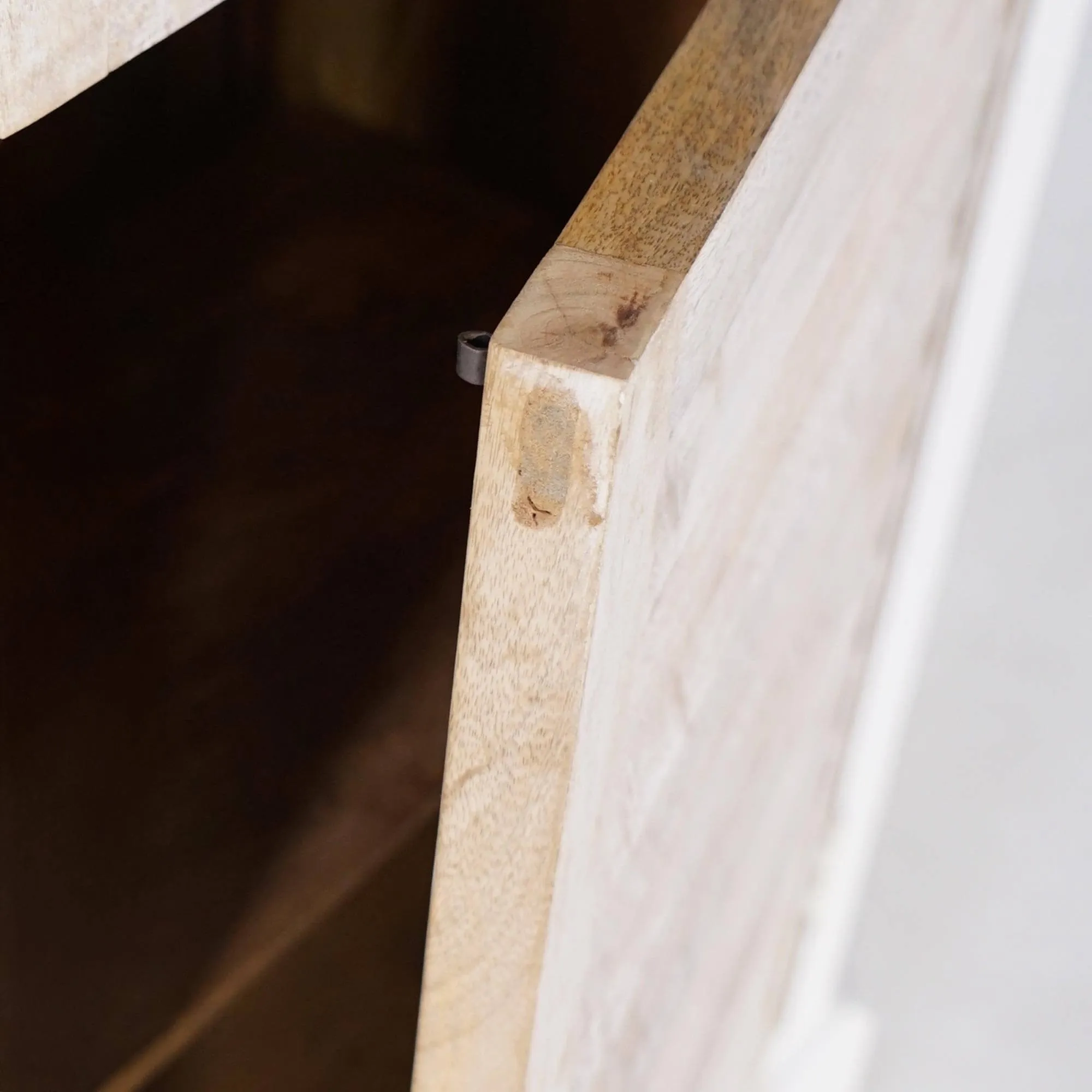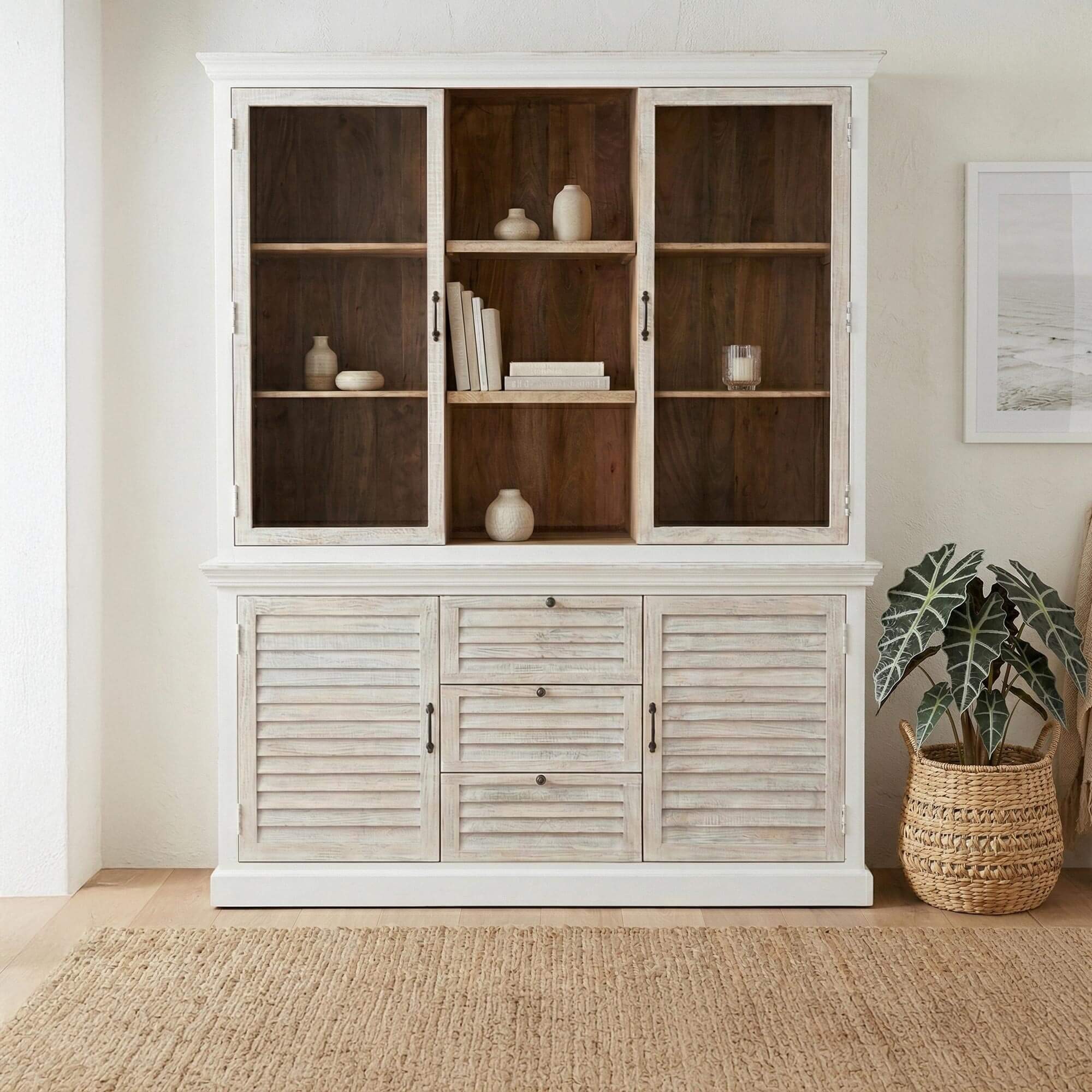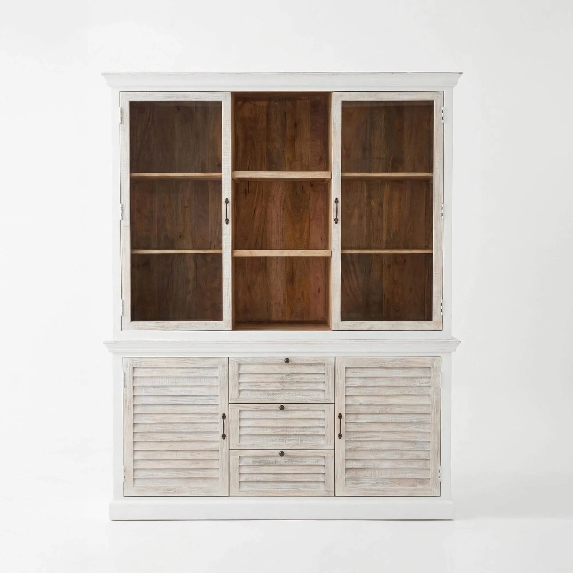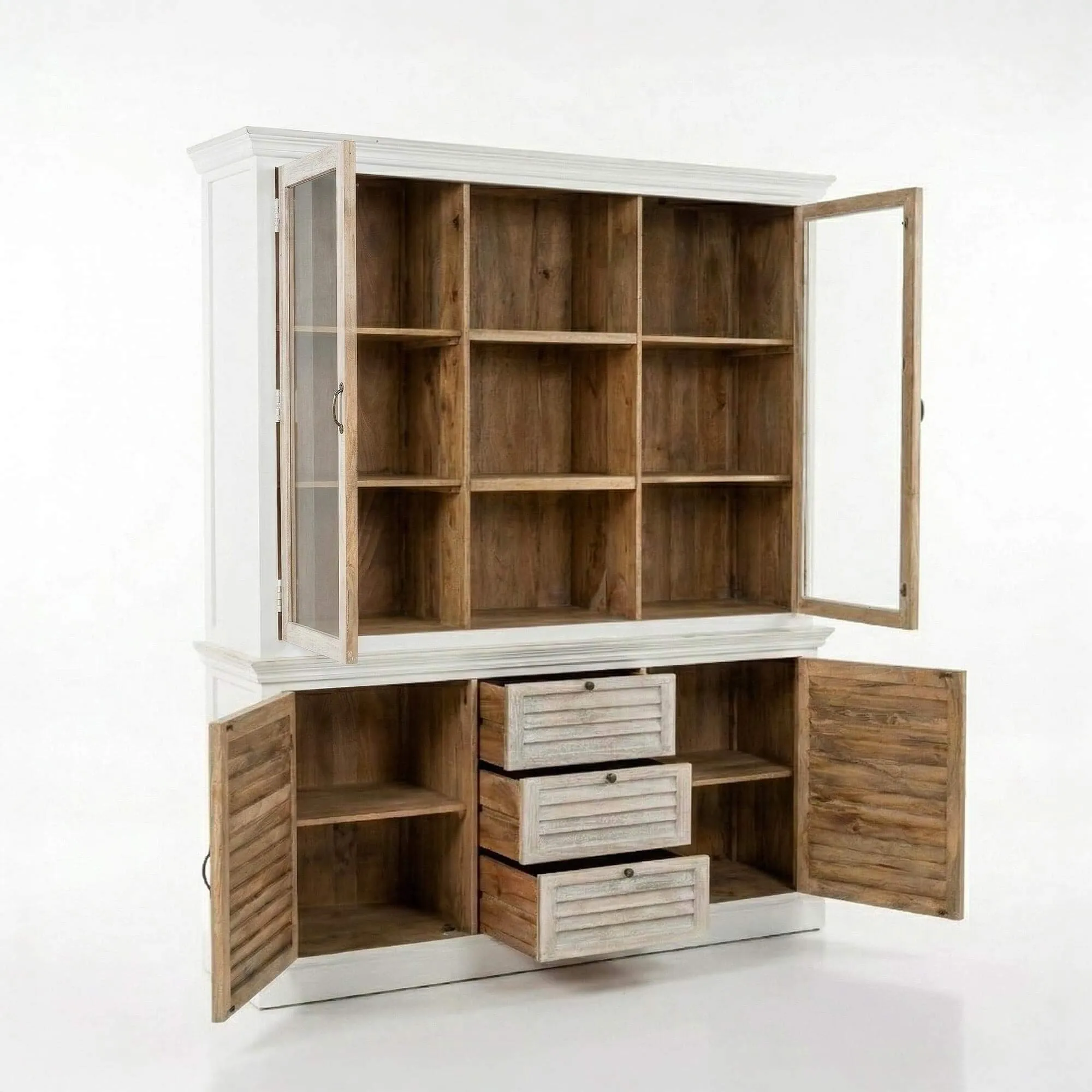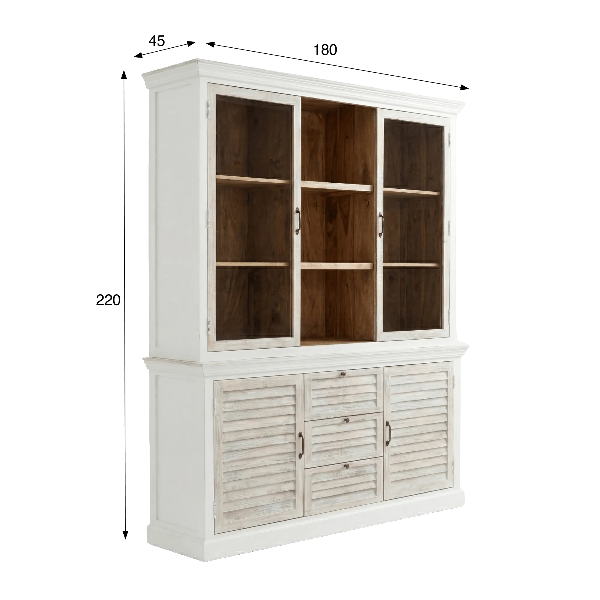 La structure en bois de manguier de ce buffet vaisselier en bois blanchi révèle un veinage délicatement nuancé, dont la texture vivante capte la lumière et apporte une sensation de profondeur. Nous avons choisi une finition légèrement patinée pour accentuer cet effet de matière, donnant au meuble une allure empreinte de sérénité. Derrière les portes vitrées de la partie supérieure, les étagères offrent un espace idéal pour exposer vaisselle, livres ou objets décoratifs, tout en conservant une impression de légèreté visuelle. Les proportions généreuses de l’ensemble, avec une largeur d’environ 180 cm et une hauteur d’environ 220 cm, permettent d’organiser harmonieusement les volumes sans alourdir l’espace.