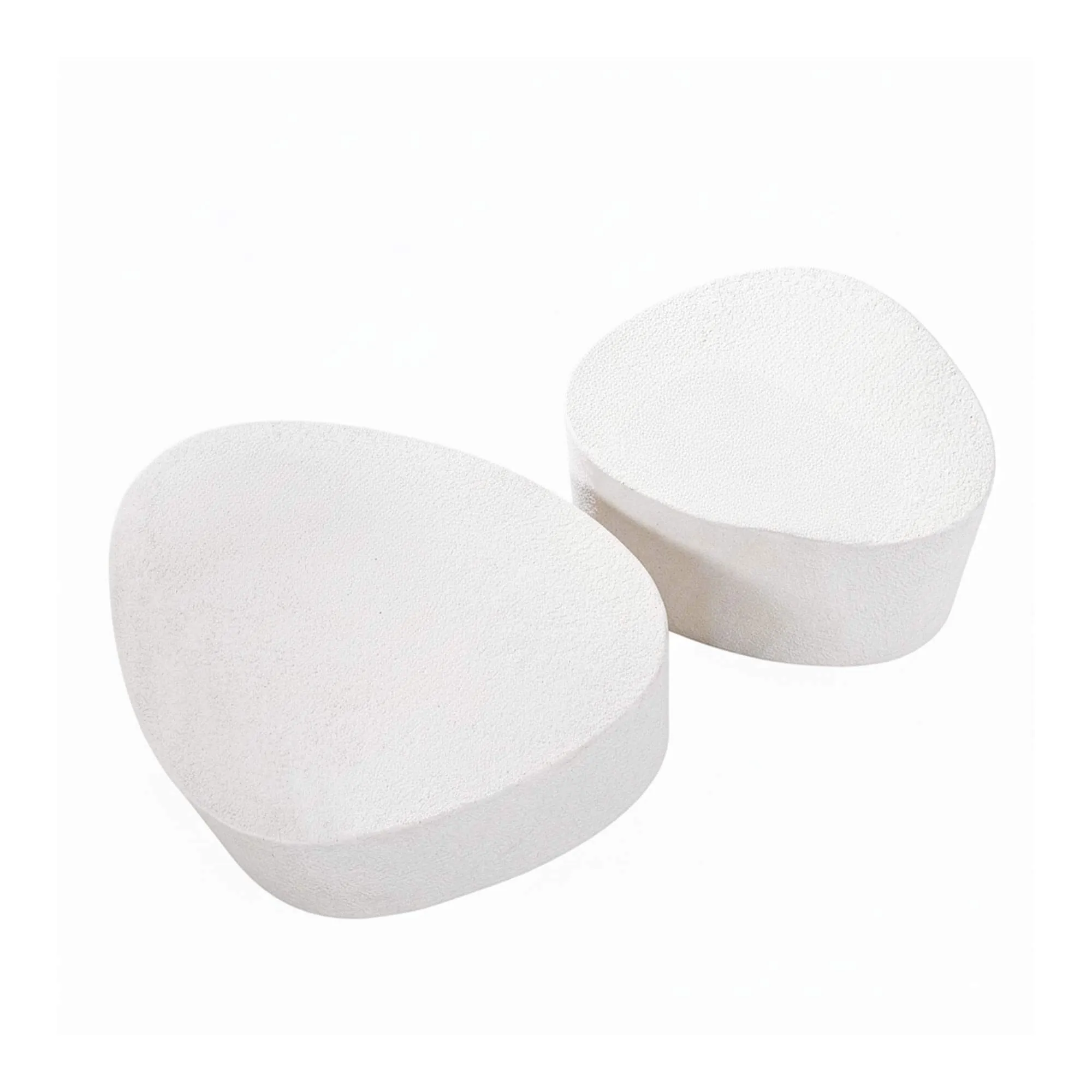 Réalisées en marbre composite, cette table basse design blanche adopte une texture minérale mate qui capte délicatement la lumière. Cette matière, choisie pour sa solidité et sa stabilité, offre un toucher subtilement granuleux qui rappelle les pierres polies par le temps. La grande table mesure 81 × 60 cm pour une hauteur de 30 cm ; la plus petite, pensée comme son pendant naturel, affiche 49 × 60 cm pour une hauteur de 35 cm. Leur duo crée un jeu de niveaux harmonieux qui structure l’espace sans l’alourdir.
