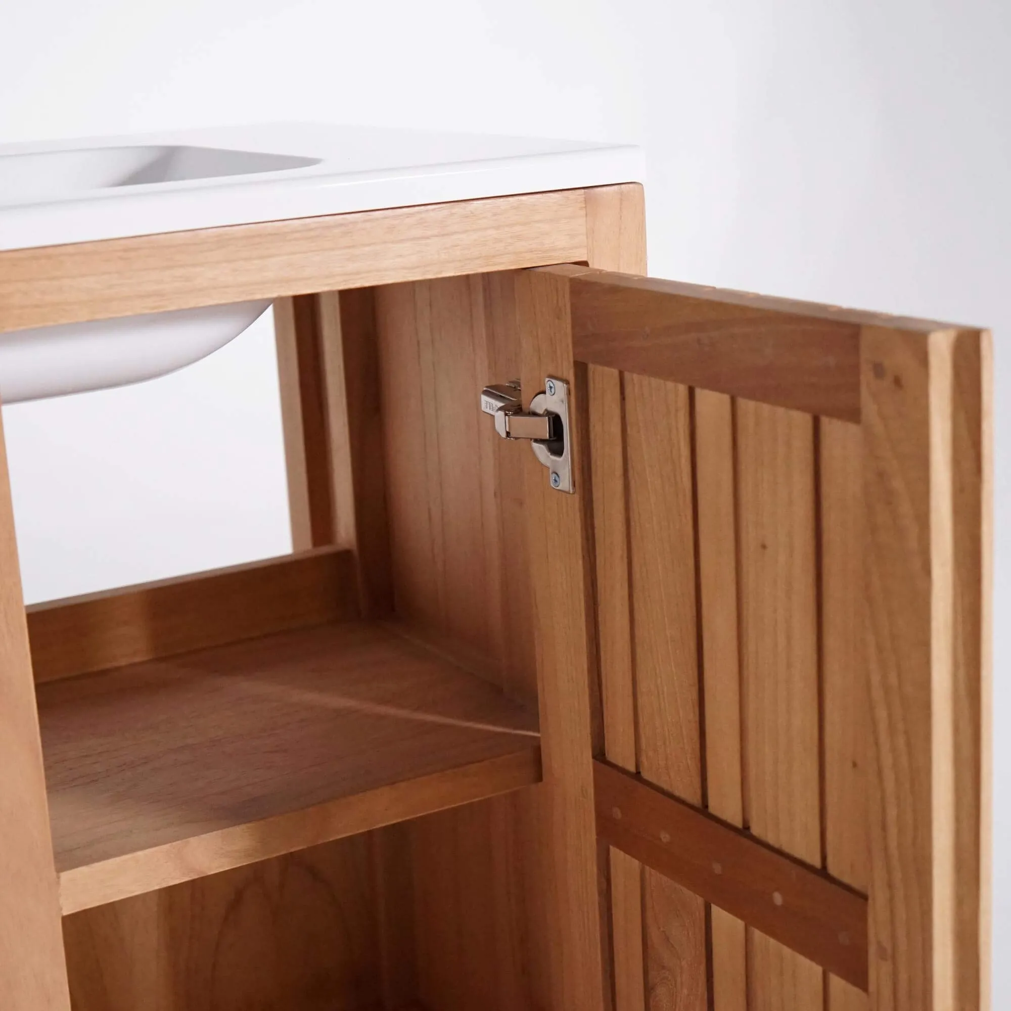Le plateau de notre meuble de salle de bain avec vasque encastrée Satya accueille une vasque en céramique, sélectionnée pour son rendu brillant et soyeux au toucher. Elle s’intègre parfaitement dans l’ensemble et crée un contraste délicat avec le bois massif, renforçant cette impression d’harmonie qui nous tenait tant à cœur lors de la conception. Avec une largeur totale de 80 cm et une hauteur de 91 cm, le meuble trouve facilement sa place dans une salle de bain lumineuse, qu’elle soit d’inspiration naturelle, contemporaine ou minimaliste.