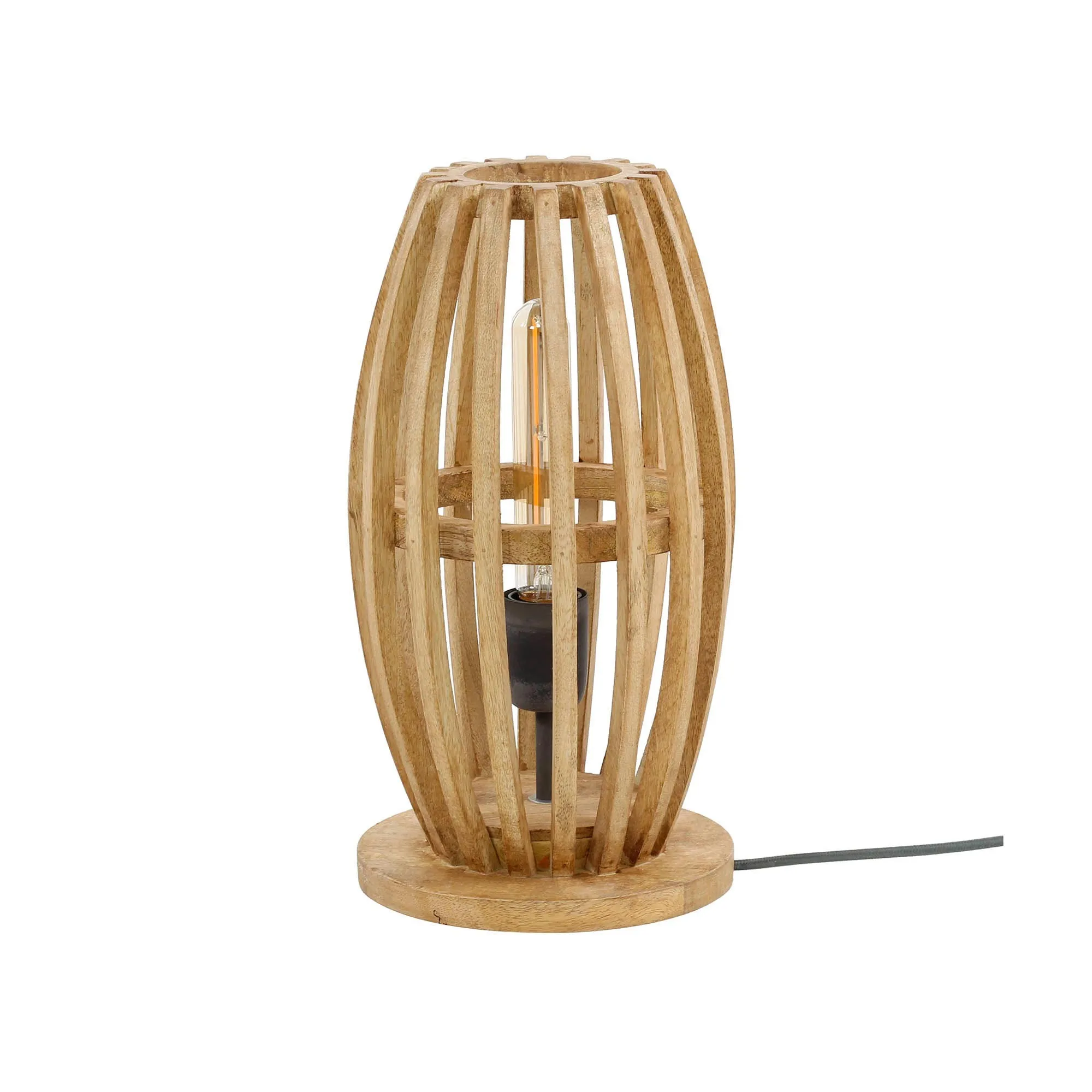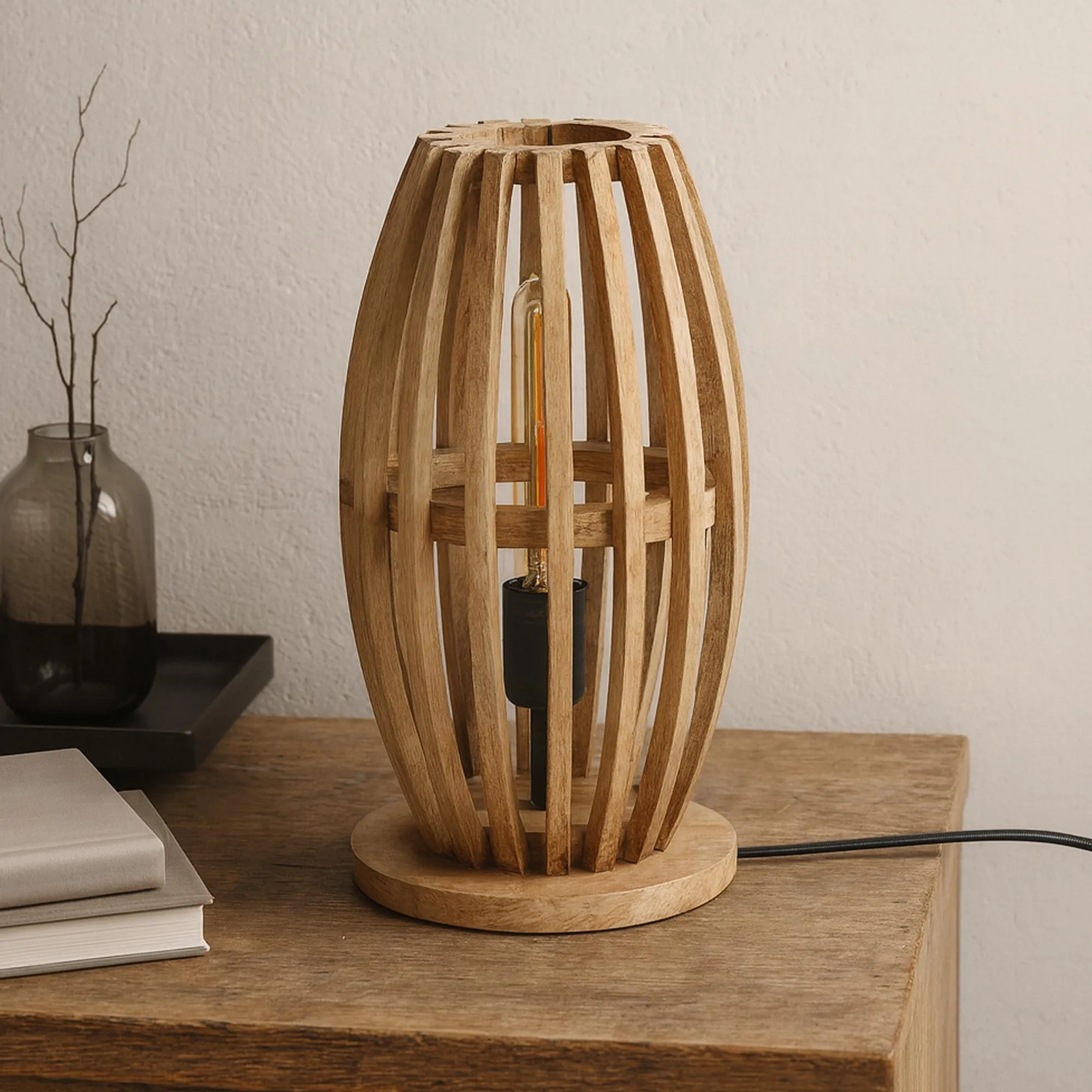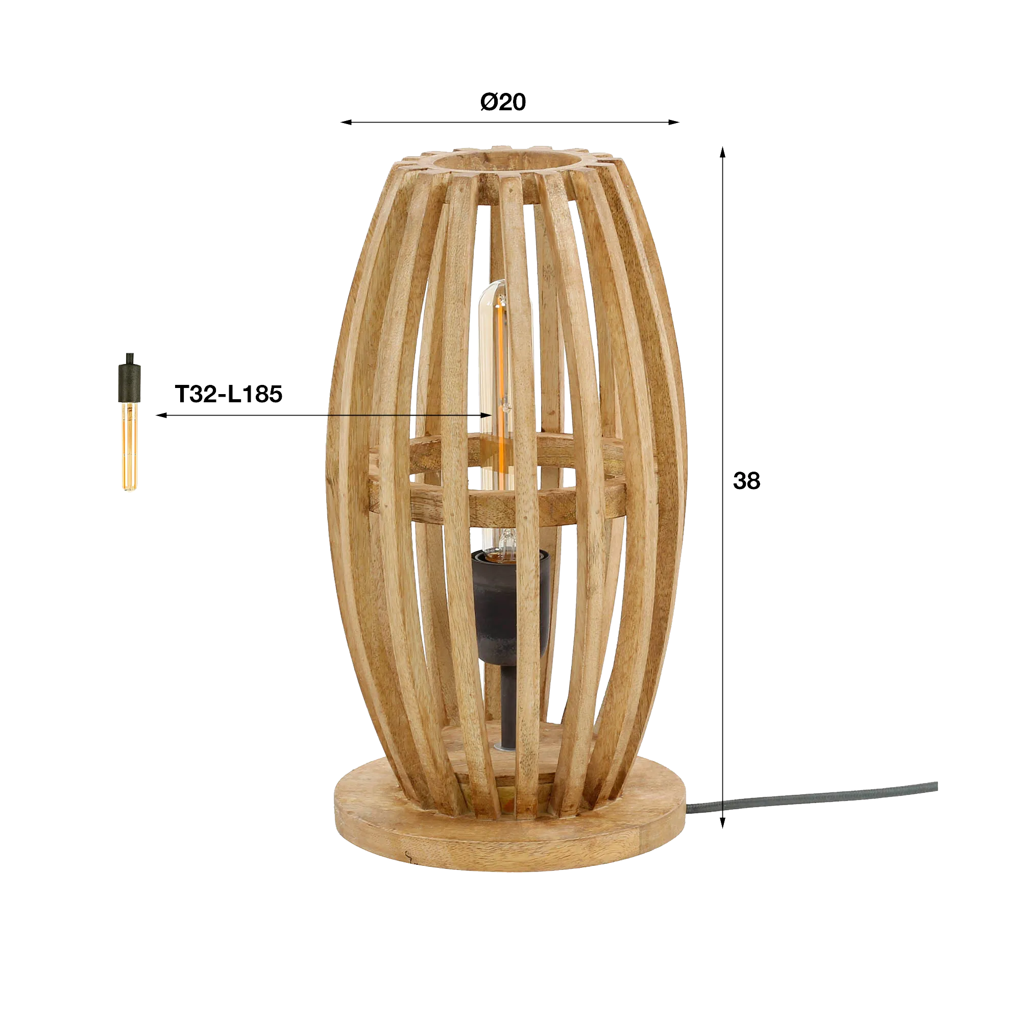Avec ses proportions équilibrées, le lampadaire à poser en bois de manguier massif Arken trouve facilement sa place sur un buffet, une console ou un meuble bas. Sa hauteur d’environ 38 cm et son diamètre proche de 20 cm en font un luminaire facile à intégrer, aussi bien dans un salon que dans une chambre ou un espace de lecture. La structure ouverte met en valeur l’ampoule décorative de référence T32-L185 (non incluse), dont la forme allongée et le filament apparent diffusent une lumière chaude, tamisée, idéale pour créer une ambiance apaisante en fin de journée.