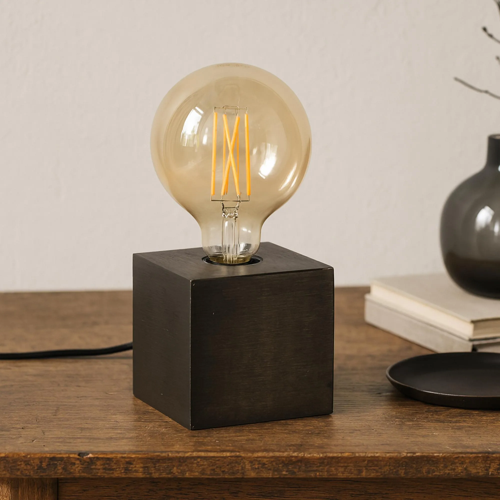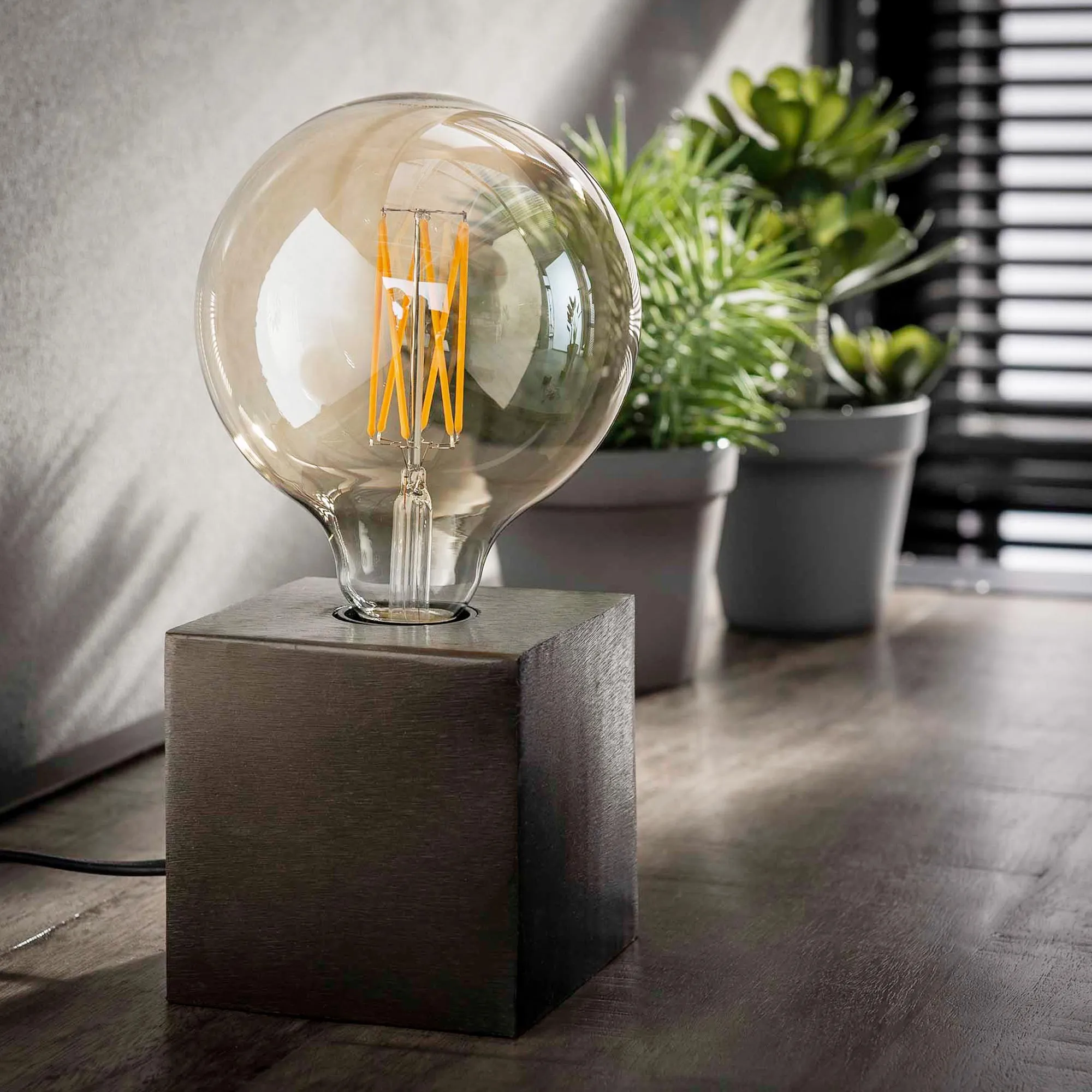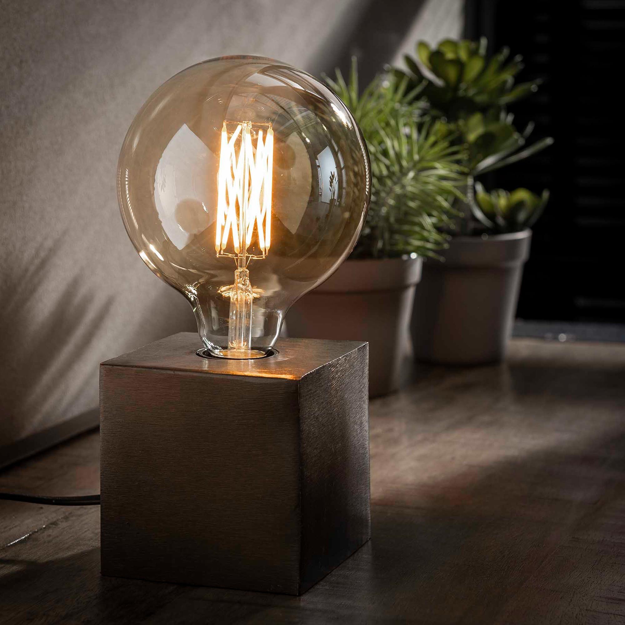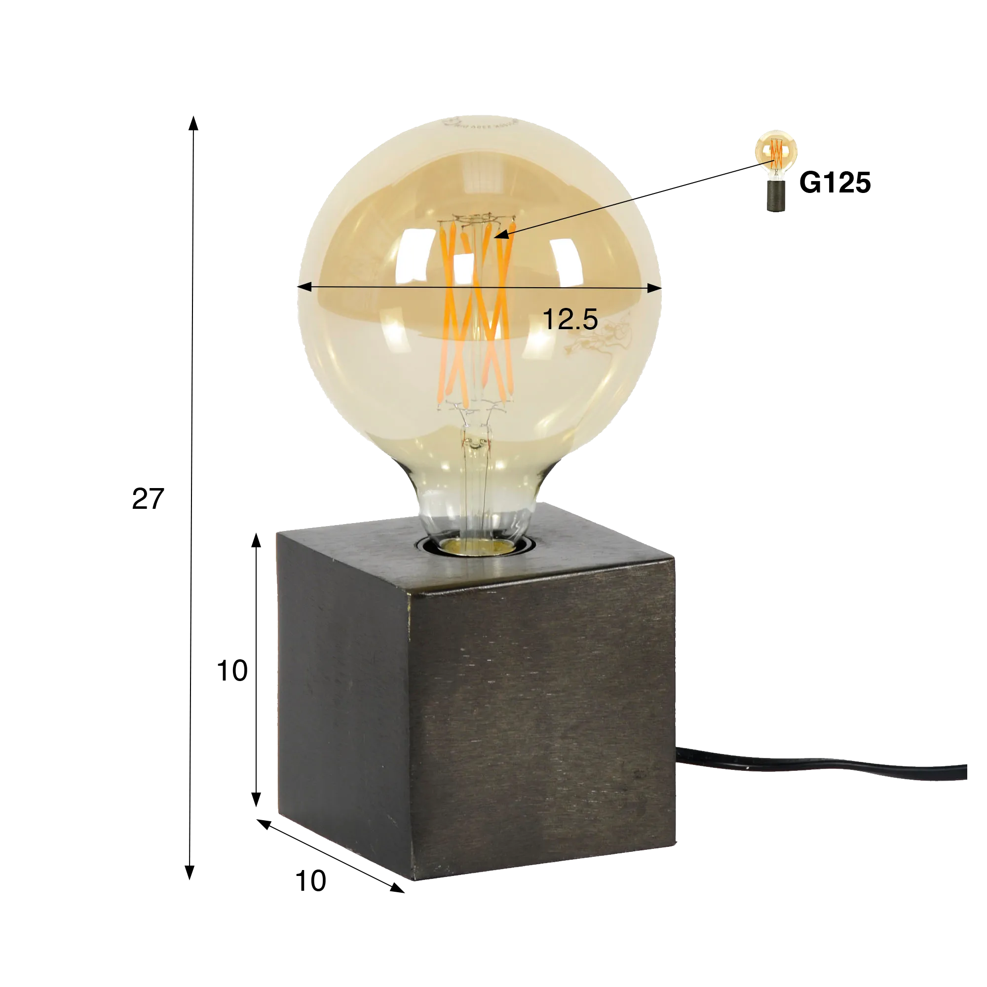 Cette lampe à poser en métal style industriel adopte une hauteur totale d’environ 27 cm, une proportion volontairement mesurée qui lui permet de trouver sa place aussi bien sur un buffet, une console, une étagère que sur une table de chevet. Au sommet du cube, l’ampoule G125 (non incluse), d’un diamètre d’environ 12,5 cm, devient un élément central du design. Nous avons fait le choix de la laisser pleinement visible afin de valoriser le dessin du filament et la chaleur de la lumière qu’elle diffuse. Allumée, elle crée une ambiance douce et enveloppante ; éteinte, elle conserve une vraie présence décorative.